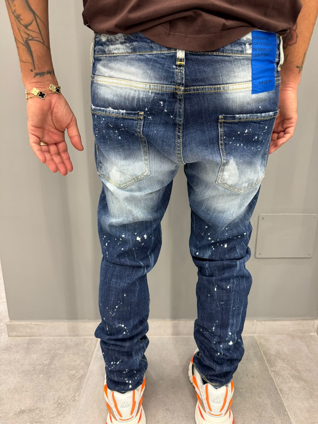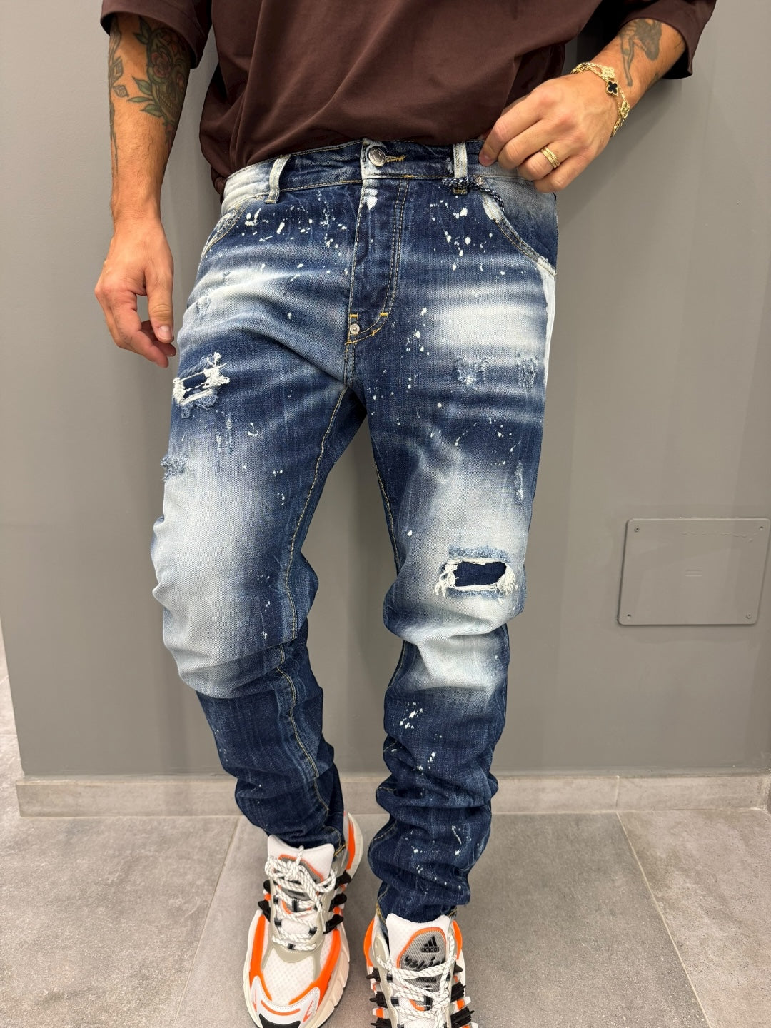 Il design esclusivo presenta sfumature di blu chiaro e dettagli con effetto vernice e strappi, che aggiungono un tocco di grinta a qualsiasi outfit. Perfetti per esprimere la tua personalità e il tuo stile unico.
