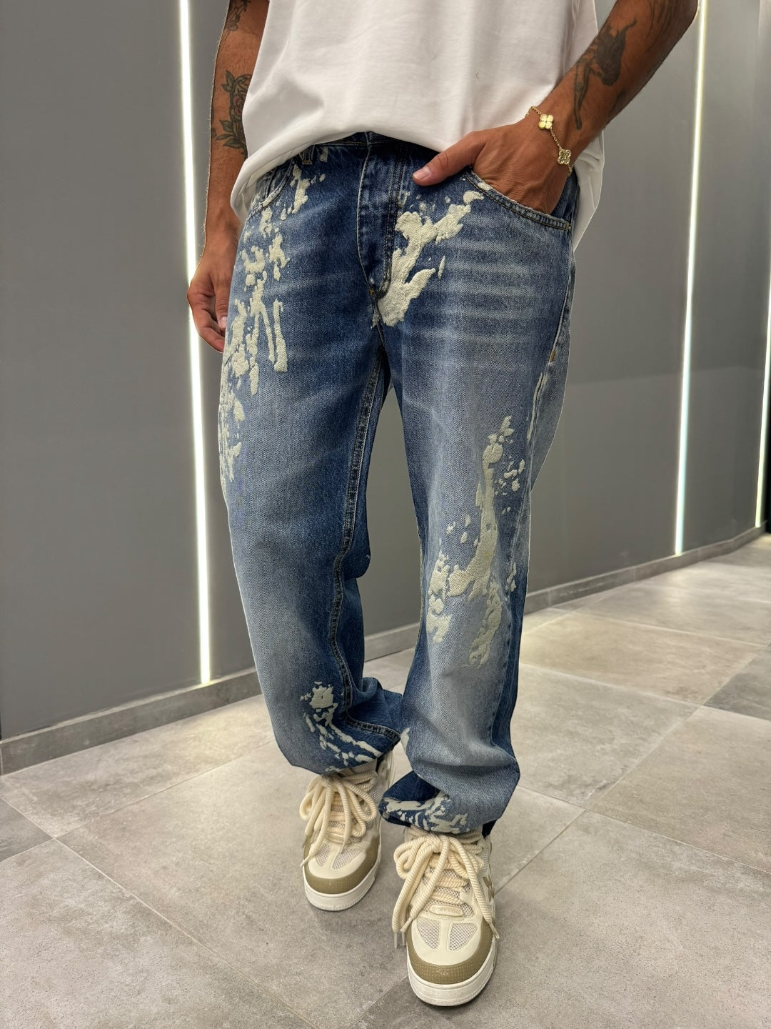 Rivoluziona il tuo guardaroba con questo jeans unico, pensato per chi ama distinguersi con stile e originalità. Realizzato in un denim di alta qualità, questo modello si caratterizza per un lavaggio blu medio arricchito da dettagli effetto "paint splash" che conferiscono un'anima artistica e dinamica al capo. La vestibilità ampia e rilassata valorizza ogni movimento, regalando comfort e un mood streetwear contemporaneo. Le leggere sfumature di usura e le pieghe naturali creano un look vissuto, autentico e personalizzato, perfetto per un outfit casual ma di forte impatto visivo. Abbinalo a sneakers dal design moderno per un risultato di tendenza e inconfondibile. Scegli il jeans che parla di creatività e personalità: un vero must-have per chi ama la moda urbana con un tocco di arte.