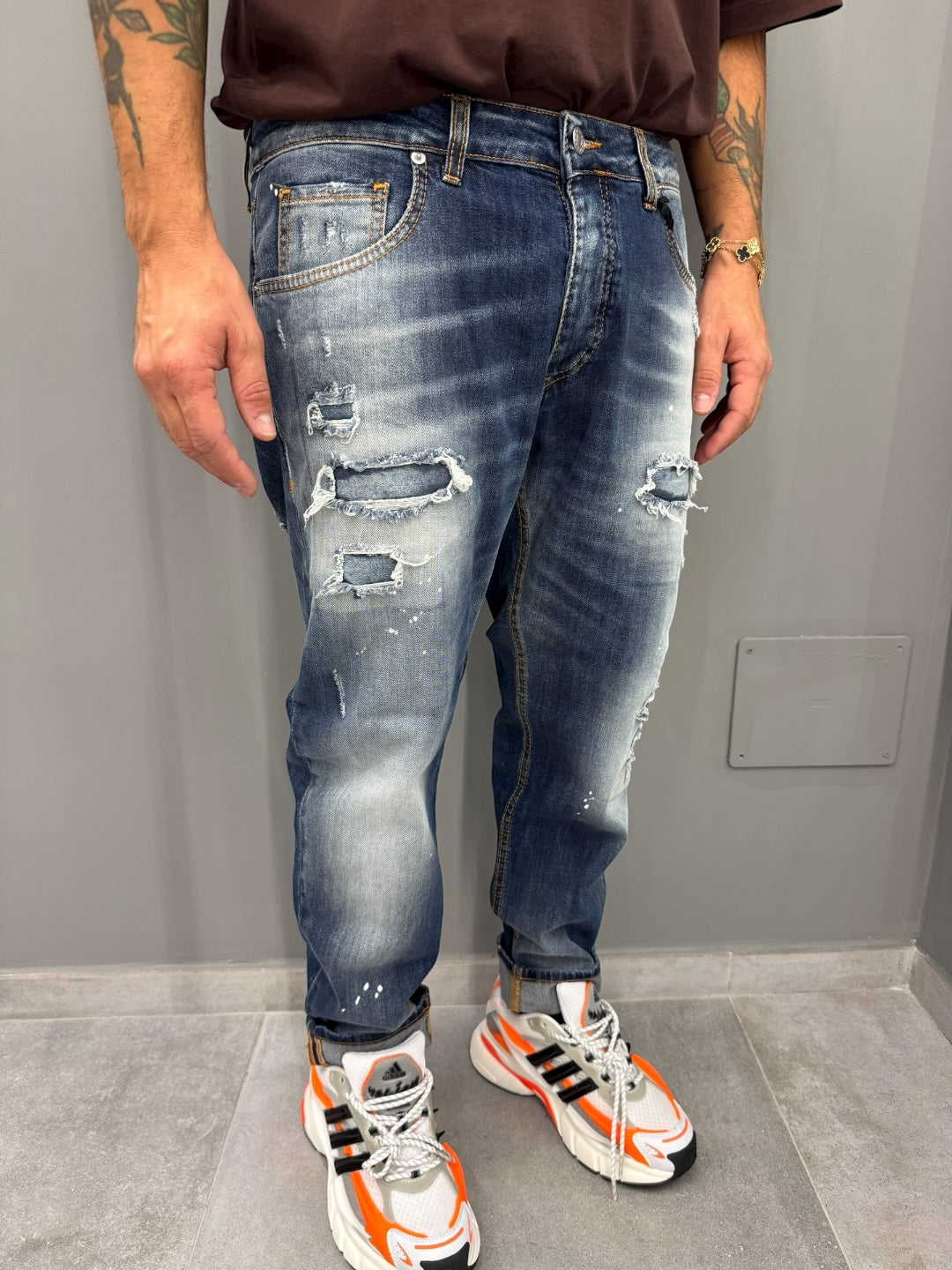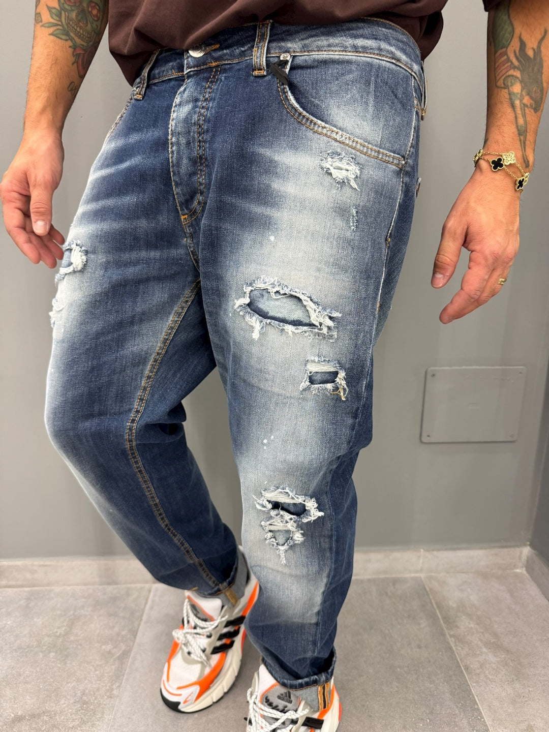 Il design presenta una tonalità di blu classico con dettagli consumati e strappi strategici, donando un look casual e disinvolto. Perfetti per chi ama uno stile rilassato, ma con un tocco di carattere deciso.
