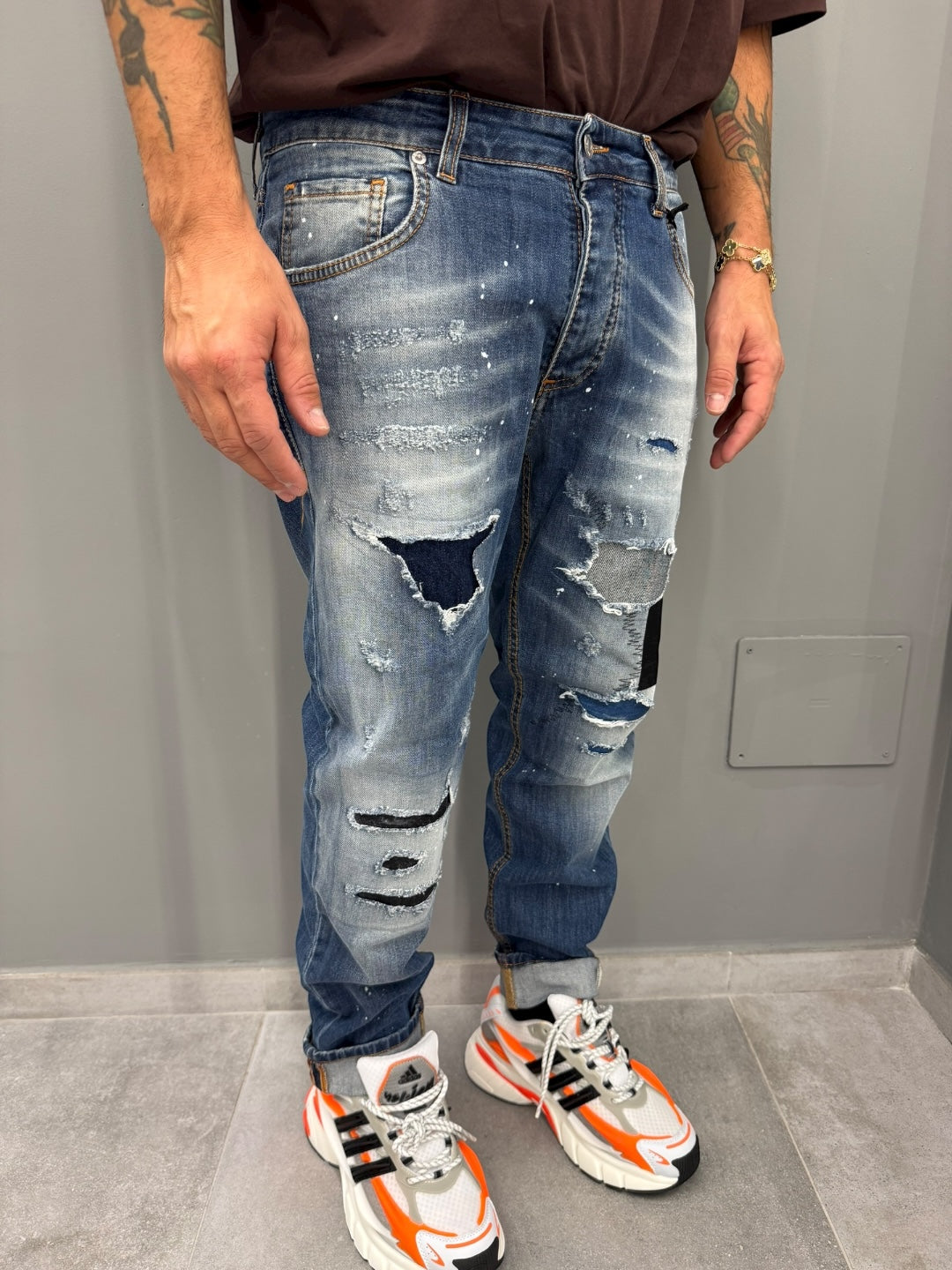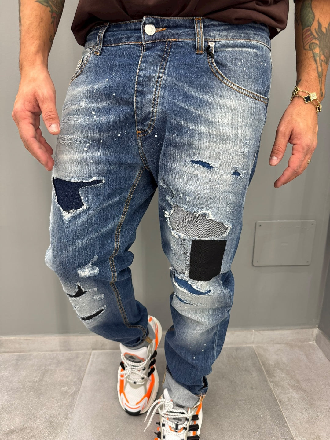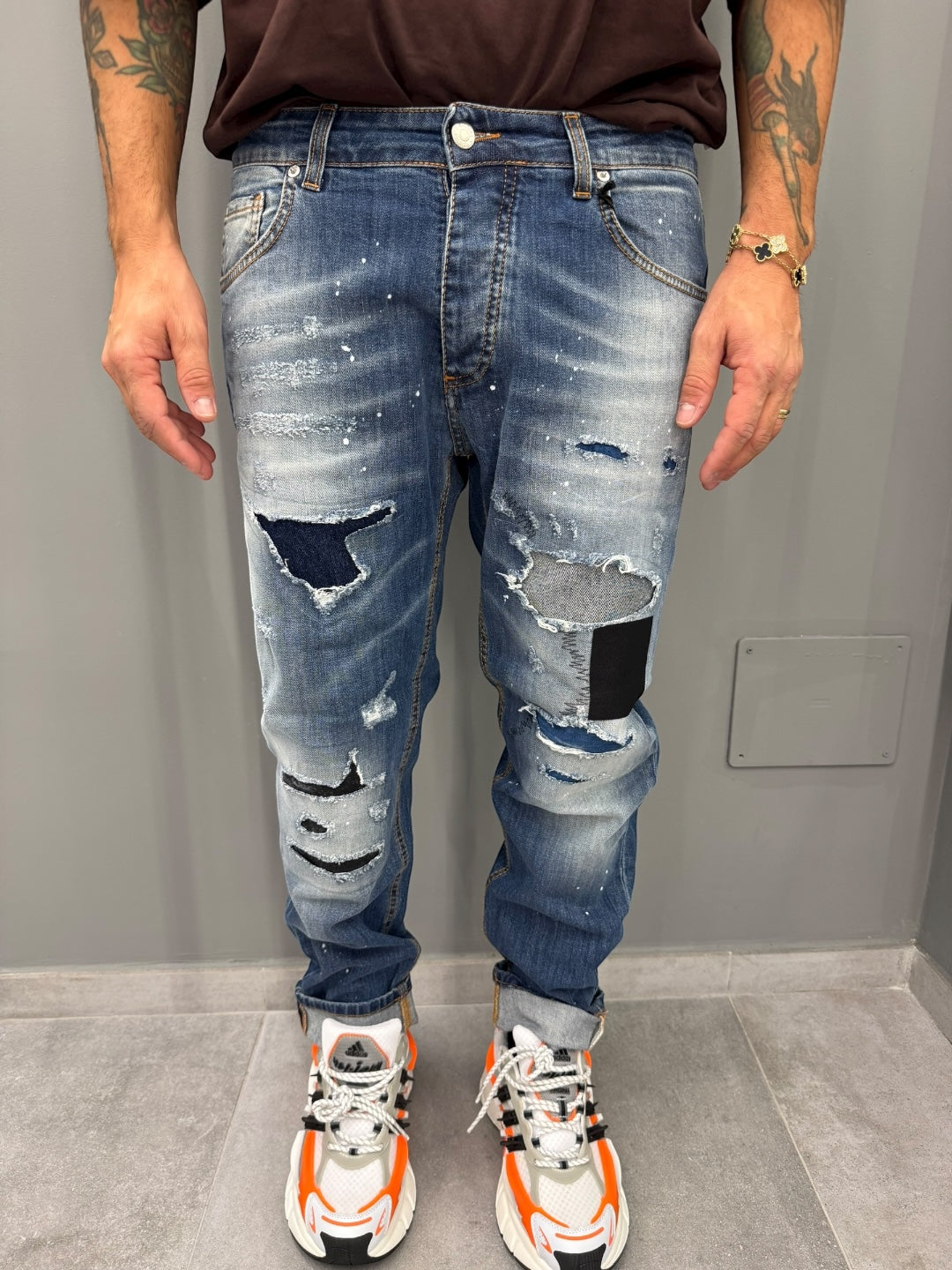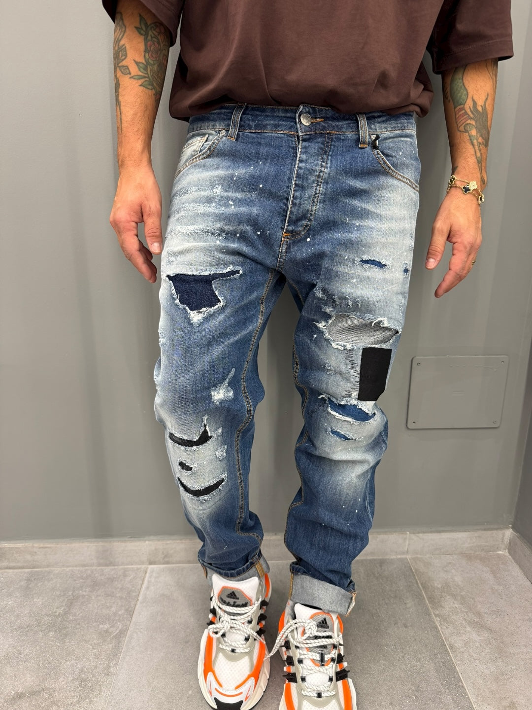 Scopri i jeans regular che rivoluzioneranno il tuo guardaroba! Realizzati con un denim di alta qualità, questi jeans offrono un mix perfetto tra stile e comfort. I dettagli strappati e patch aggiungono un tocco di originalità e carattere, rendendoli perfetti per chi ama un look moderno e audace.