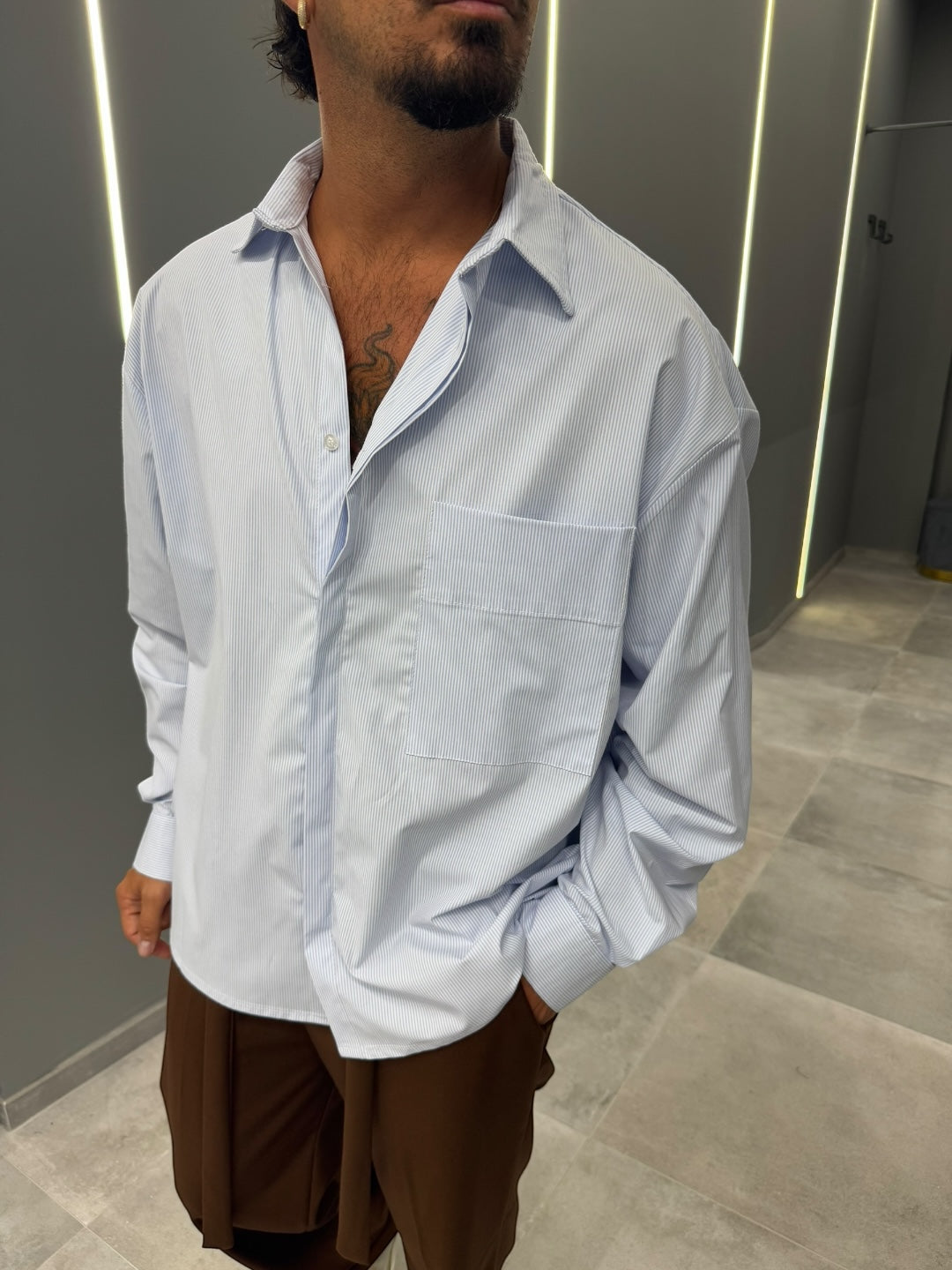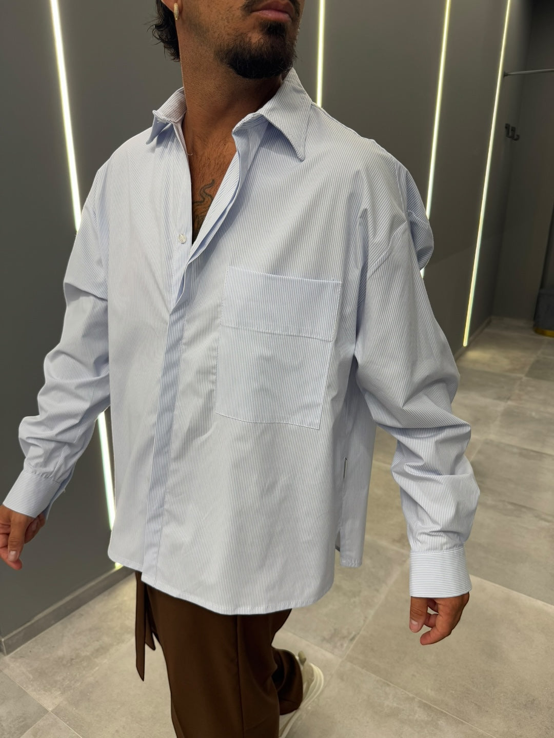 Camicia uomo a righe sottili azzurre su fondo bianco, dal taglio ampio e moderno, perfetta per chi cerca stile e comfort. Realizzata in tessuto leggero e traspirante, garantisce una vestibilità comoda per tutto il giorno. Presenta un colletto classico, un taschino funzionale sul petto e maniche lunghe con polsini regolabili a bottoni. Il dettaglio degli spacchi laterali sul fondo aggiunge libertà di movimento e un tocco contemporaneo. Ideale da abbinare sia a pantaloni classici che a jeans, per un look formale ma allo stesso tempo casual. Disponibile in diverse taglie.