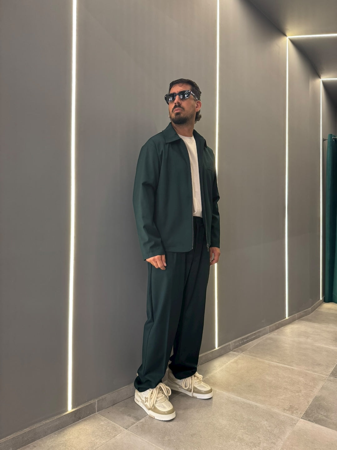 Scopri l'eleganza moderna con il nostro coordinato uomo in un raffinato verde scuro: giacca leggera con zip frontale e pantaloni ampi dal taglio contemporaneo. Perfetto per chi ama uno stile minimal ma di grande impatto, ideale per la città e per momenti casual chic. Abbinalo a una T-shirt basica bianca e sneakers per un look versatile che spicca in ogni occasione. Comfort premium e design sofisticato si incontrano in questo must-have della stagione. Non perdere l'occasione di rinnovare il tuo guardaroba con classe e originalità!