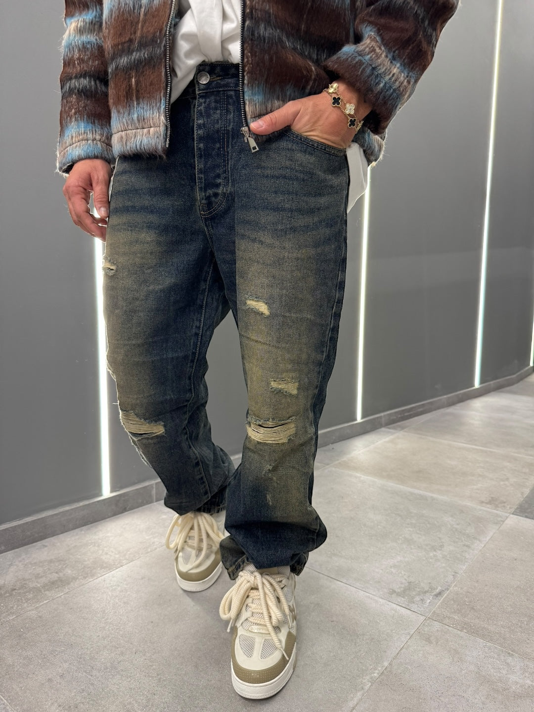 Questo denim unisce stile, personalità e comfort in un mix perfetto. Il lavaggio scuro con sfumature vissute e gli strappi strategici creano un effetto vintage autentico, ideale per chi vuole un look deciso ma sempre curato.