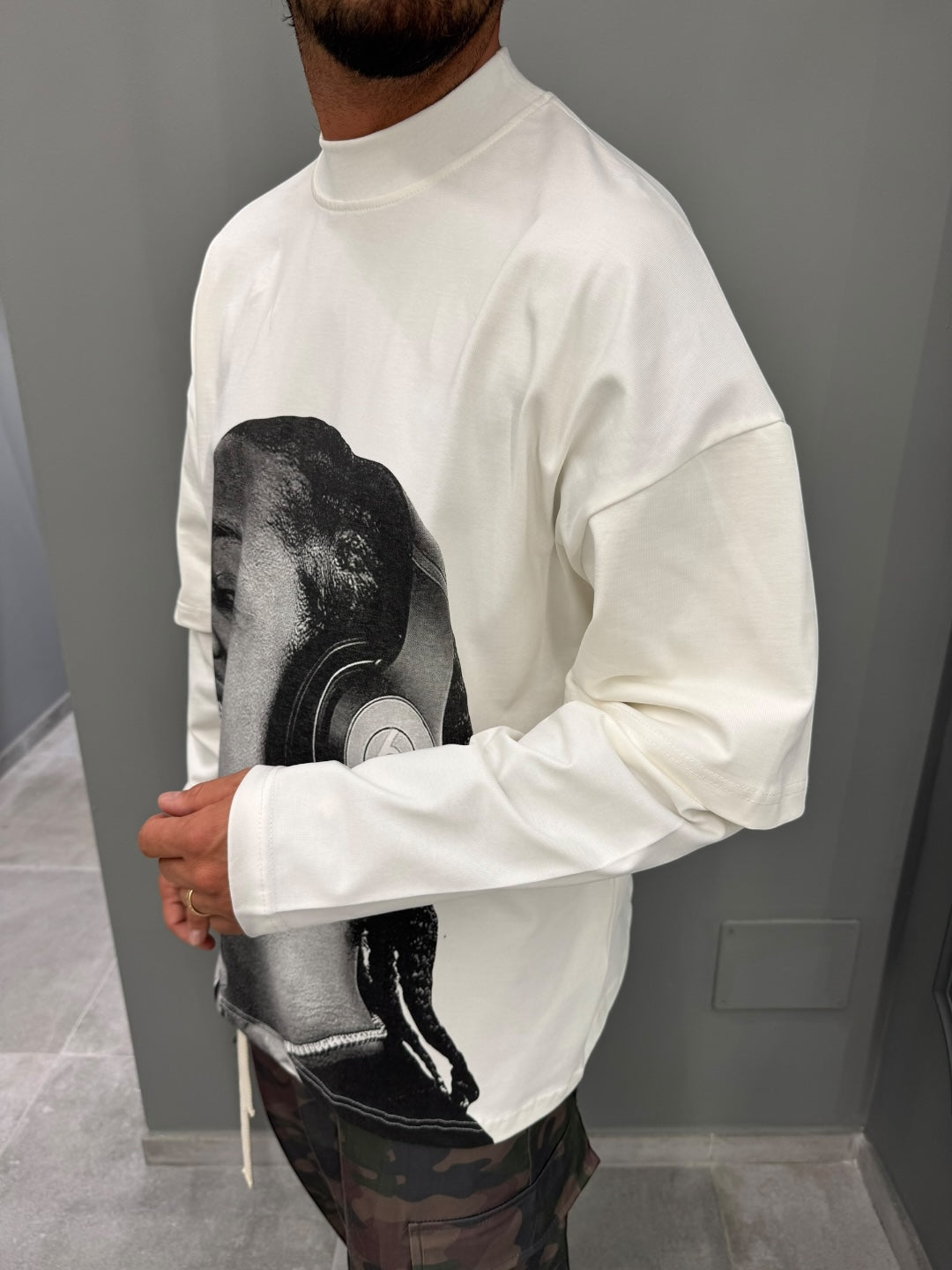 Il ritratto di una figura iconica con cuffie, posizionato con maestria sulla parte frontale, aggiunge un tocco di originalità e dinamismo, perfetto per esprimere la tua passione per la musica e la creatività. Il taglio rilassato assicura comodità senza compromessi, rendendola ideale per ogni occasione, da un'uscita casual a un evento speciale.
