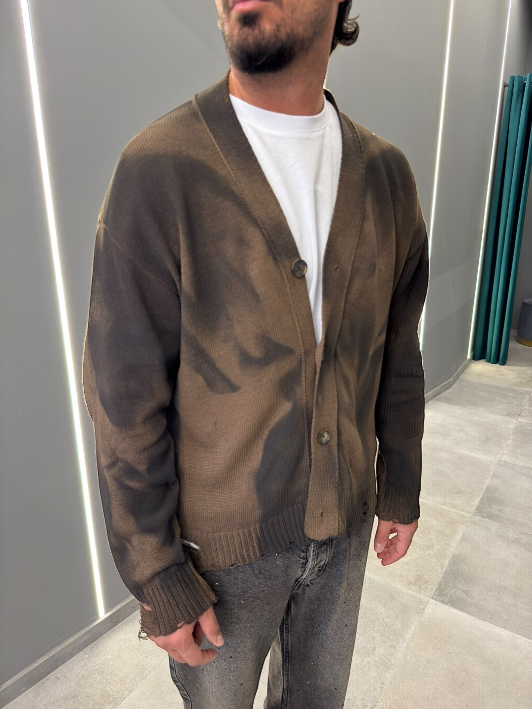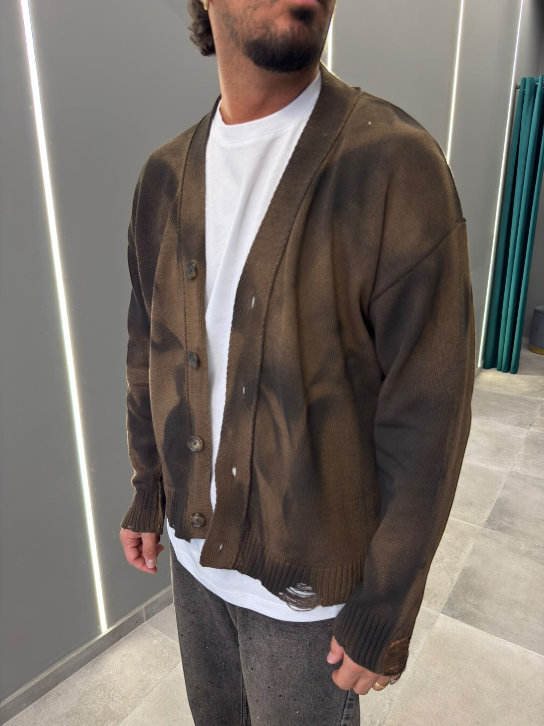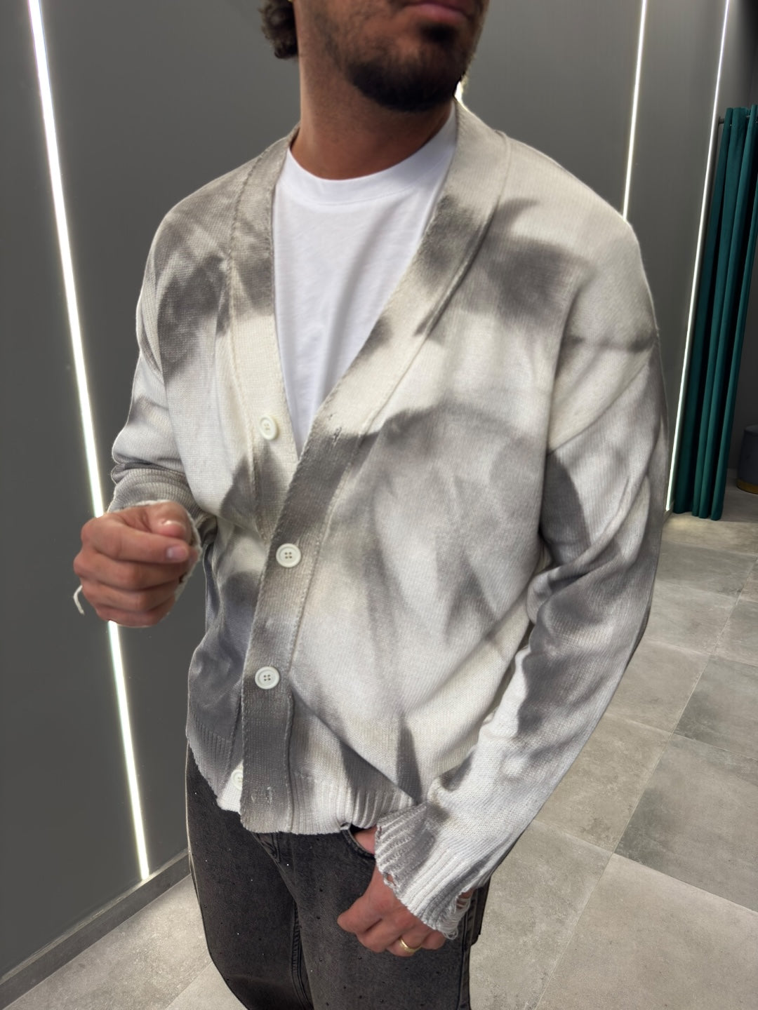 Realizzato in morbido tessuto di alta qualità, offre calore e una vestibilità rilassata. Il design con bottoni frontali e scollo a V aggiunge un tocco classico, mentre le sfumature uniche donano un aspetto contemporaneo e sofisticato.