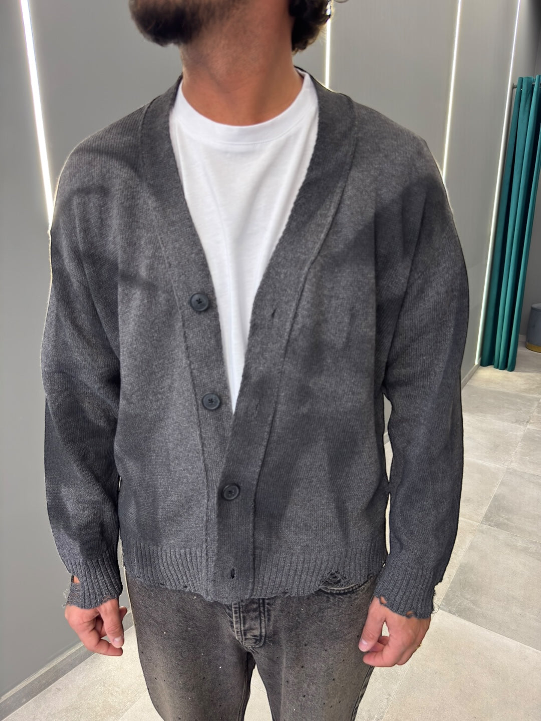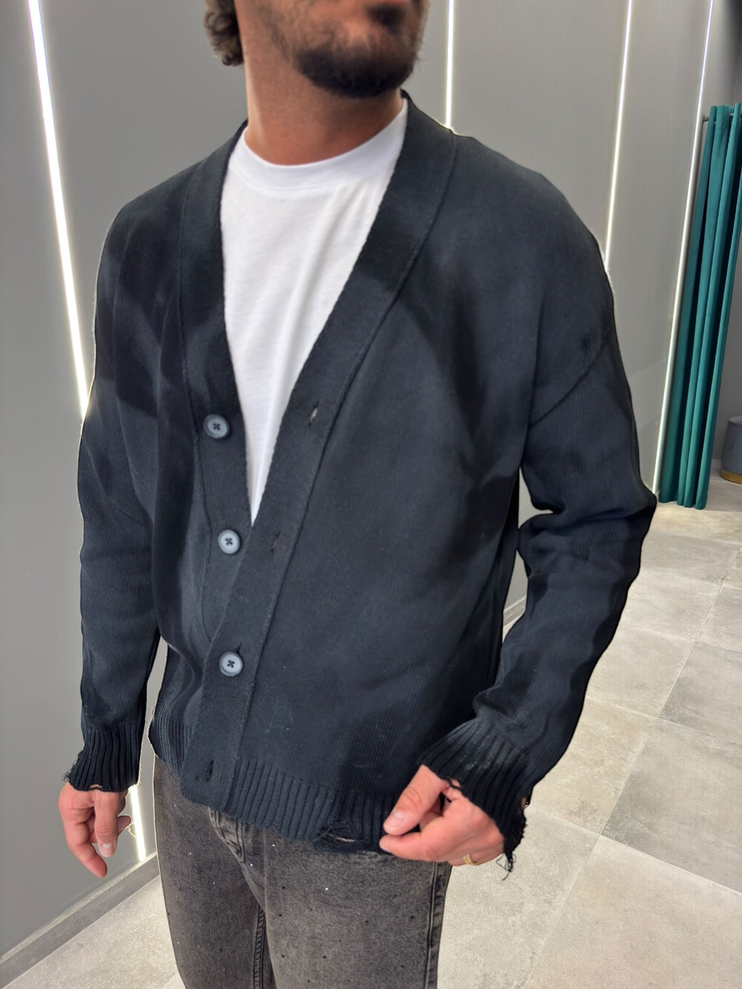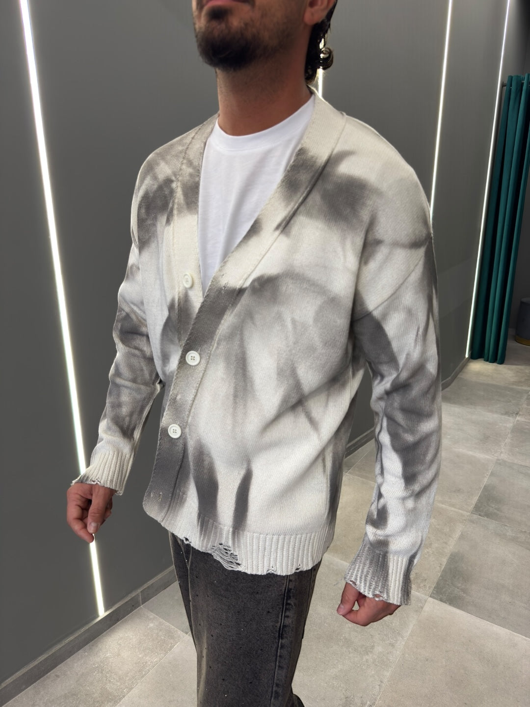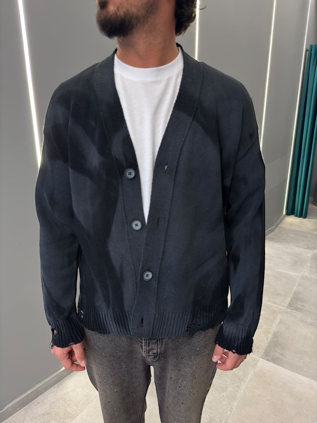 Realizzato in morbido tessuto di alta qualità, offre calore e una vestibilità rilassata. Il design con bottoni frontali e scollo a V aggiunge un tocco classico, mentre le sfumature uniche donano un aspetto contemporaneo e sofisticato.