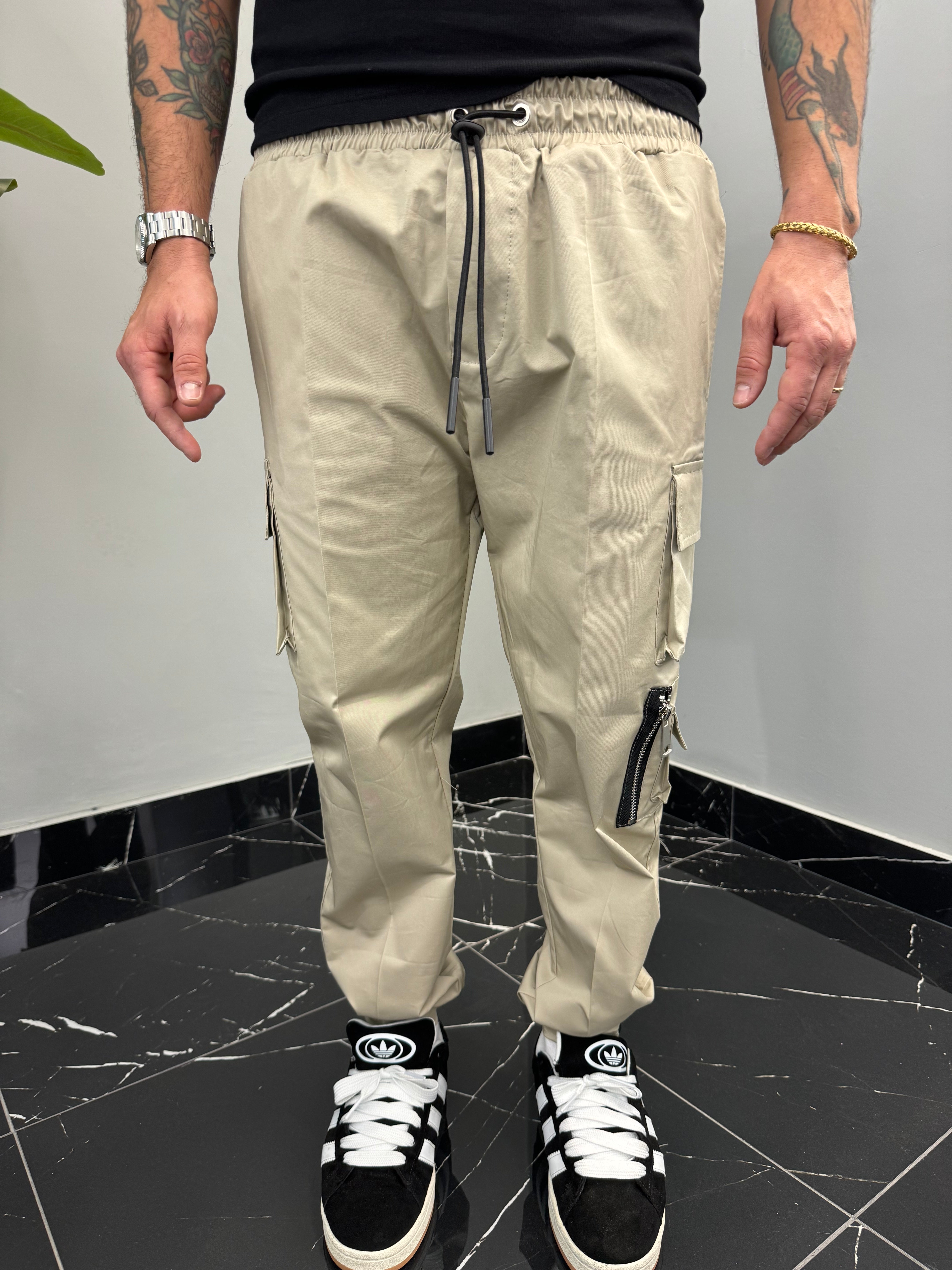 COLORE BEIGE CON ELASTICO E LACCIO IN VITA , ELASTICO E CIAPPA SUL FONDO , TASCONI LATERALI , ZIP E TASCHINO SU GAMBA SINISTRA .