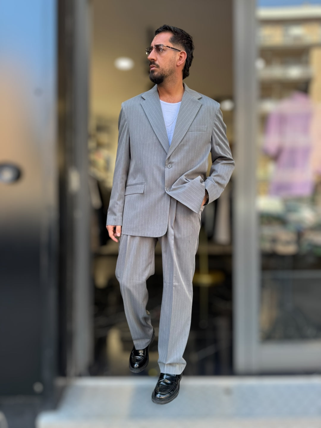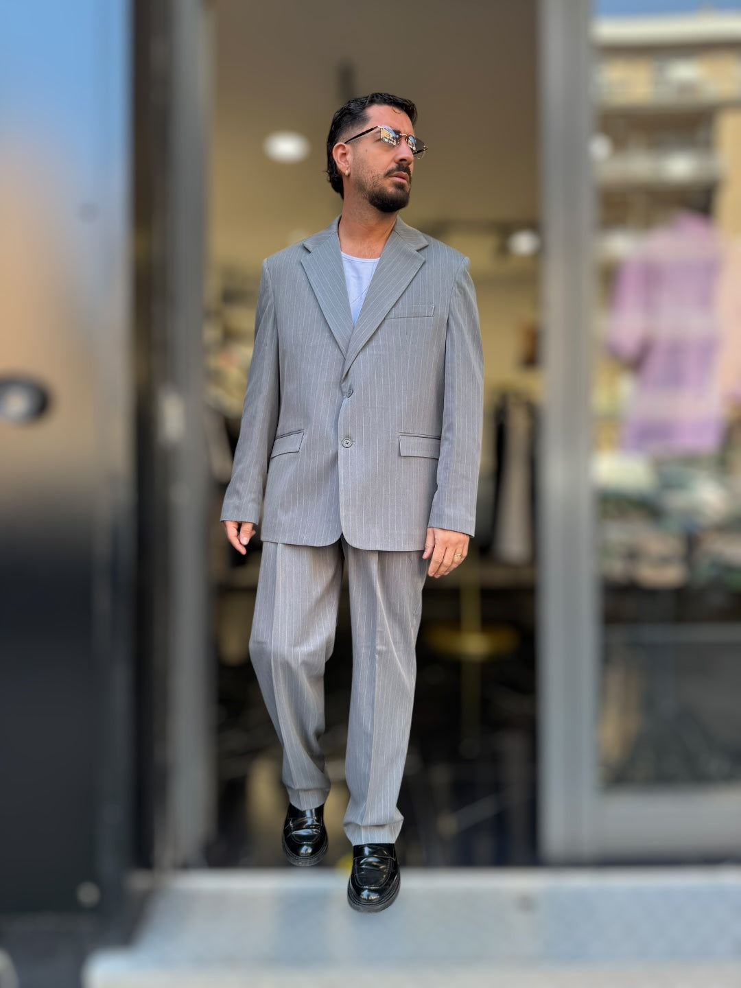 Scopri l'eleganza senza tempo di questo abito uomo a righe sottili, che unisce design classico e dettagli moderni per uno stile raffinato e contemporaneo. Realizzato in tessuto di alta qualità, leggero e confortevole, questo completo dal taglio ampio offre una vestibilità rilassata ma curata, perfetta per valorizzare ogni silhouette.