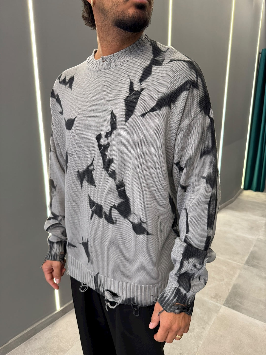 Scopri il nostro maglione oversize tie-dye, un capo che fonde arte contemporanea e streetwear per un look distintivo e alla moda. Realizzato in morbido e caldo tessuto a maglia grigio chiaro, questo pullover si caratterizza per un unico e moderno effetto tie-dye nero che crea giochi di luce e ombra in ogni dettaglio.