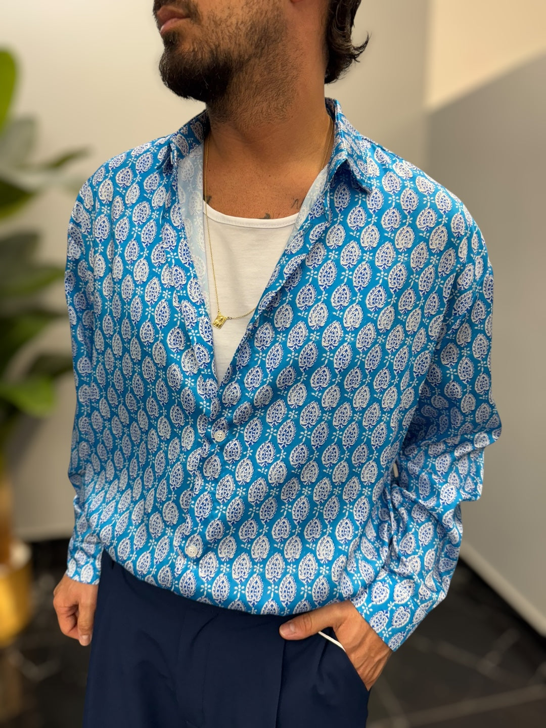 Non lasciarti sfuggire questa opportunità: porta eleganza e stile nelle tue serate estive con la nostra camicia a fantasia in raso! Sii il centro dell'attenzione e lascia un'impressione duratura in ogni occasione.