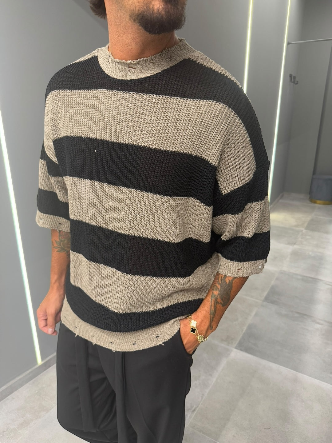Scopri il fascino unico di questa maglia in filo cotone, perfetta per chi ama uno stile casual ma ricercato. Il suo design a righe larghe alterna tonalità naturali e scure, creando un contrasto visivo di grande impatto e modernità. La maglia presenta una vestibilità morbida e avvolgente, ideale per accompagnarti con comfort durante tutte le tue giornate.