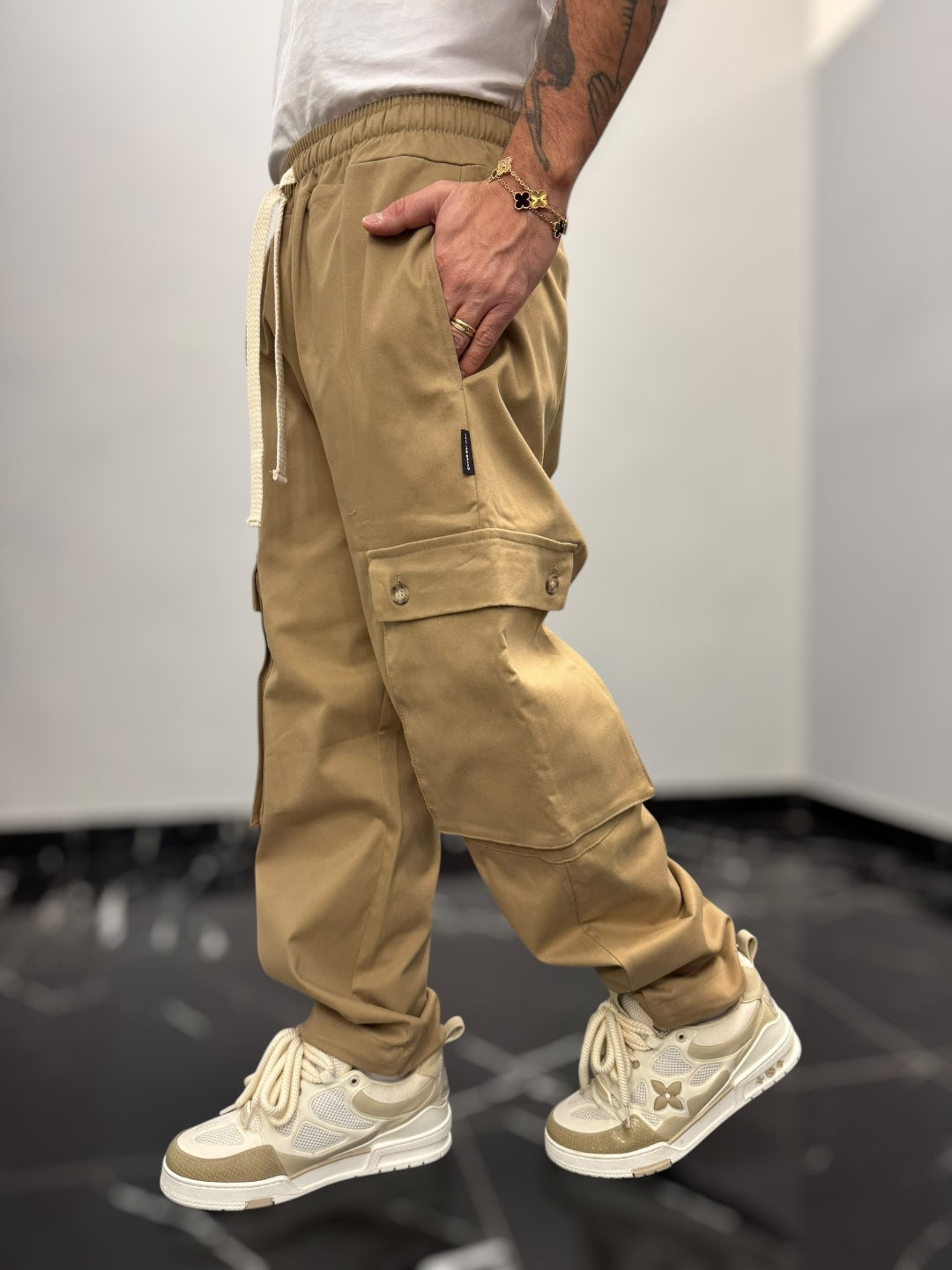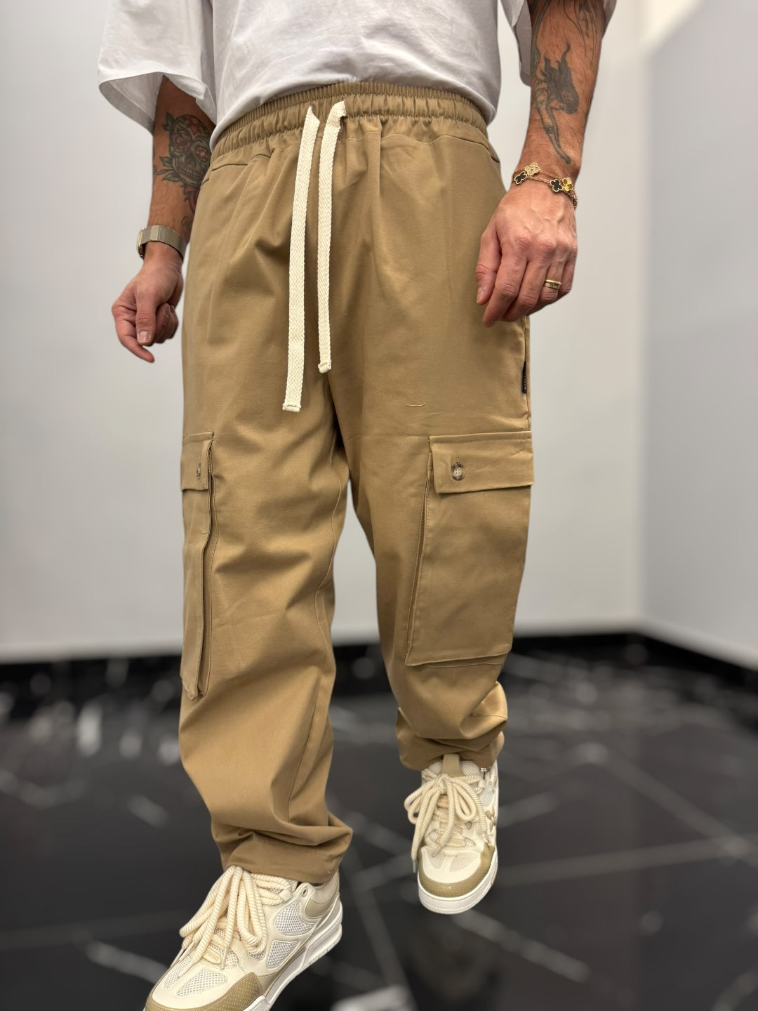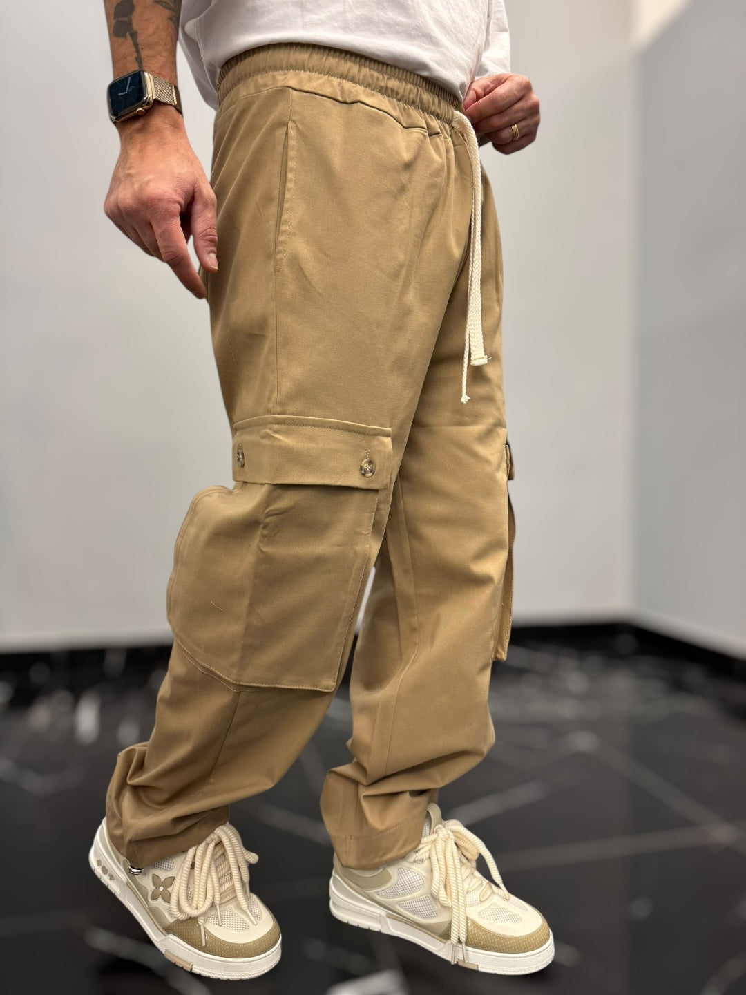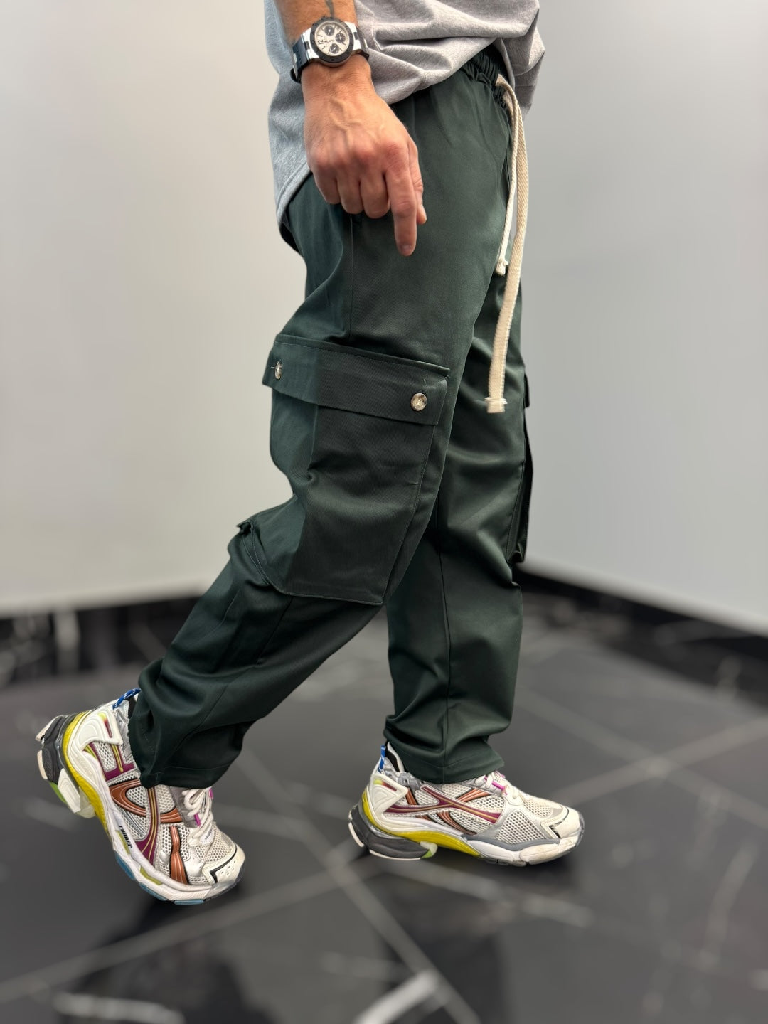 Questo pantalone cargo in cotone gabardina è un capo pratico e di tendenza, perfetto per chi cerca comodità e stile in un’unica soluzione. La vita elastica, regolabile con un doppio laccio, assicura una vestibilità comoda e versatile, adattandosi facilmente alla silhouette senza sacrificare il comfort.Dotato di due ampi tasconi laterali, offre praticità e spazio extra per piccoli oggetti, mantenendo un look casual e moderno. Il fondo largo contribuisce a una vestibilità rilassata, con la possibilità di stringerlo grazie a cordini regolabili, che permettono di adattare il capo a diversi stili e preferenze. Perfetto per un outfit urbano, si abbina facilmente a t-shirt e sneakers per un look casual e funzionale.