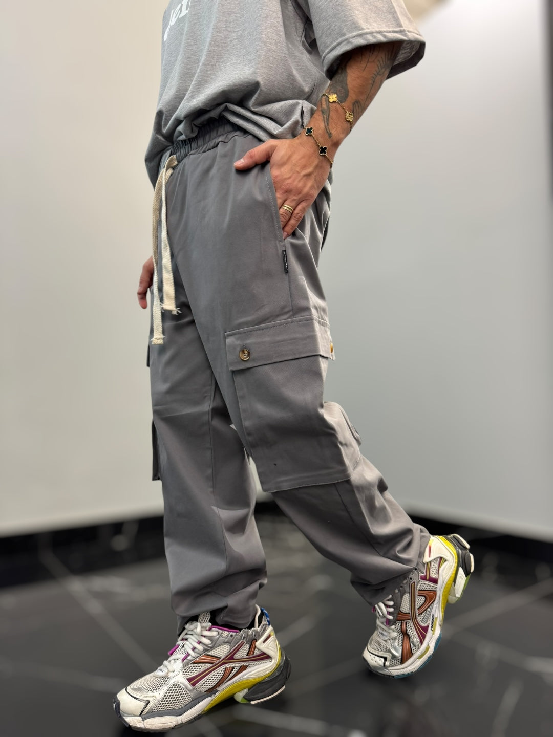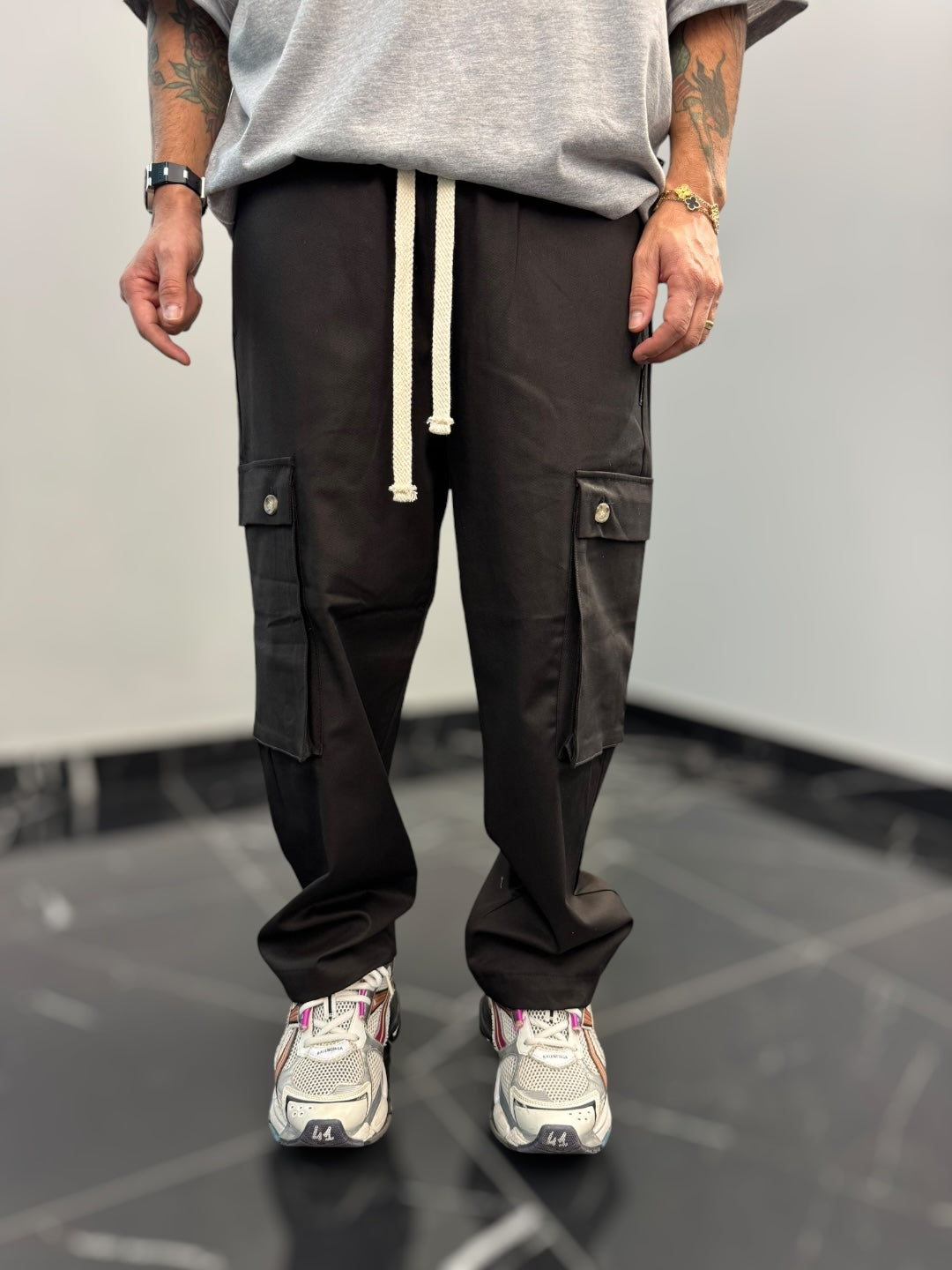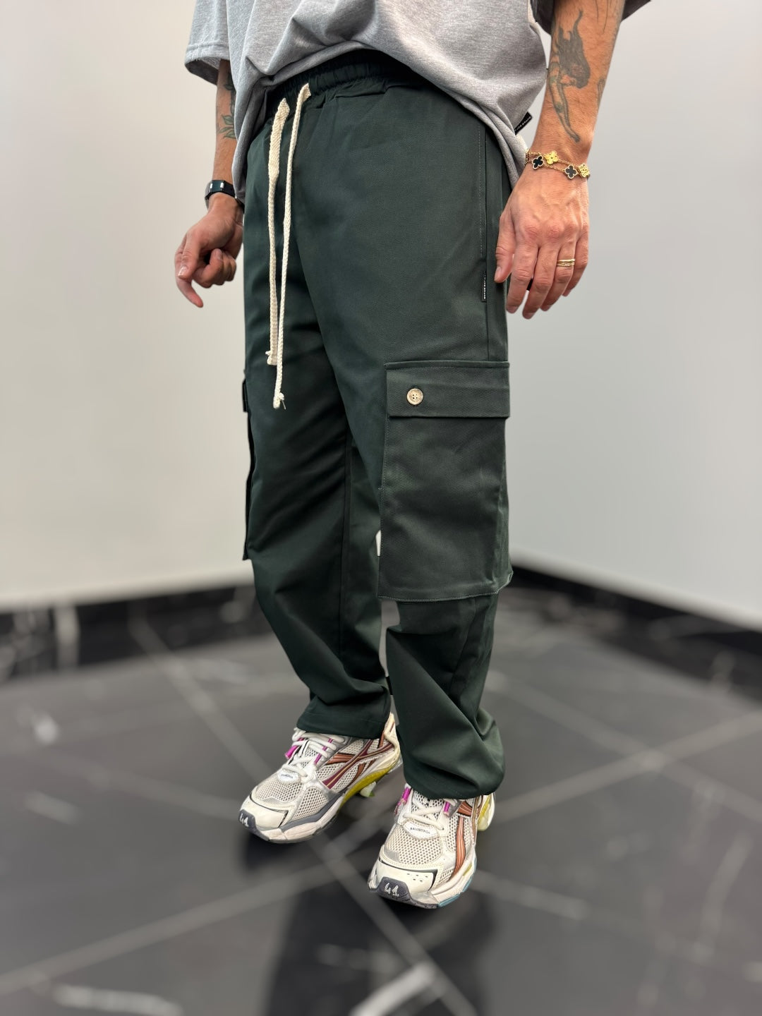 Questo pantalone cargo in cotone gabardina è un capo pratico e di tendenza, perfetto per chi cerca comodità e stile in un’unica soluzione. La vita elastica, regolabile con un doppio laccio, assicura una vestibilità comoda e versatile, adattandosi facilmente alla silhouette senza sacrificare il comfort.Dotato di due ampi tasconi laterali, offre praticità e spazio extra per piccoli oggetti, mantenendo un look casual e moderno. Il fondo largo contribuisce a una vestibilità rilassata, con la possibilità di stringerlo grazie a cordini regolabili, che permettono di adattare il capo a diversi stili e preferenze. Perfetto per un outfit urbano, si abbina facilmente a t-shirt e sneakers per un look casual e funzionale.