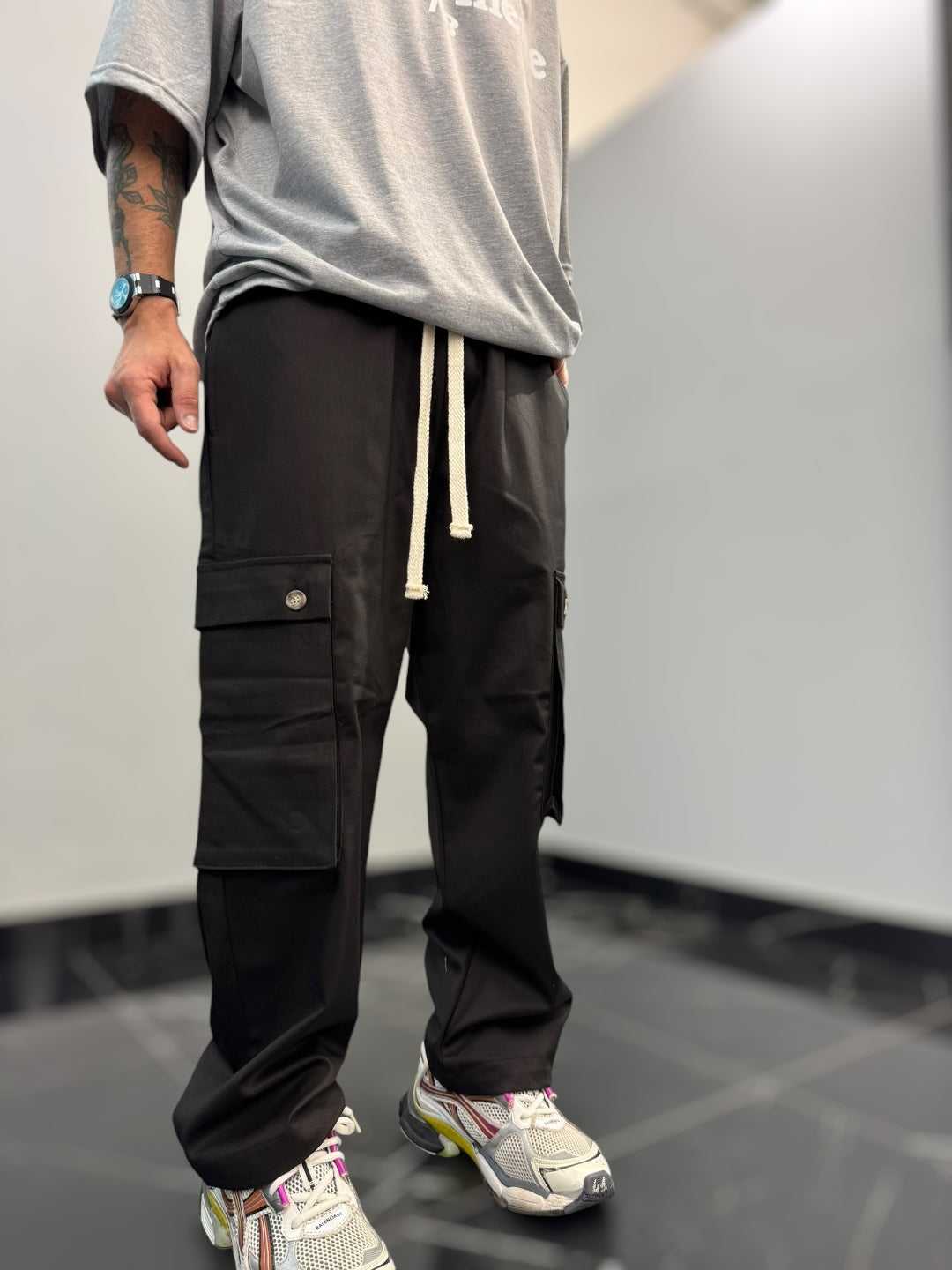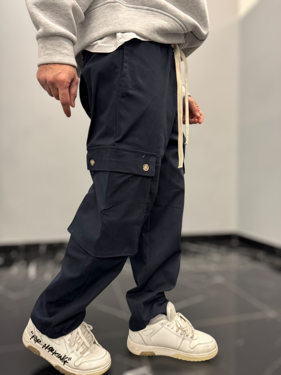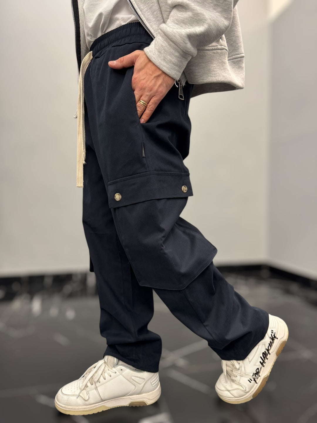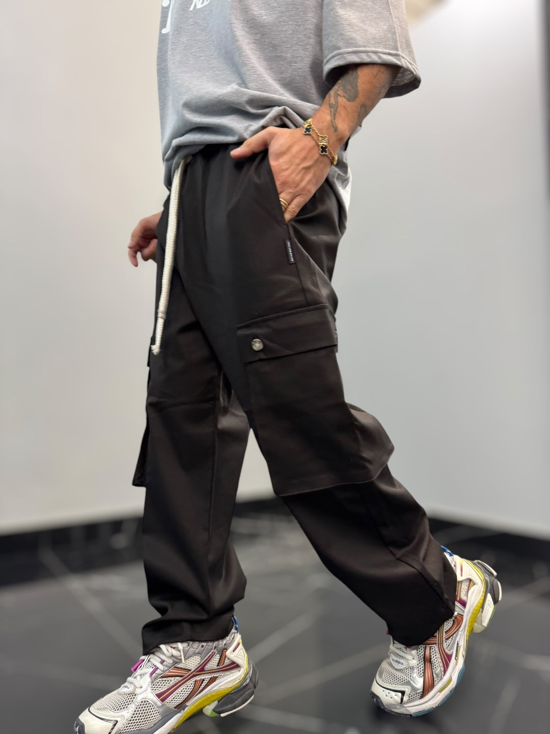 Questo pantalone cargo in cotone gabardina è un capo pratico e di tendenza, perfetto per chi cerca comodità e stile in un’unica soluzione. La vita elastica, regolabile con un doppio laccio, assicura una vestibilità comoda e versatile, adattandosi facilmente alla silhouette senza sacrificare il comfort.Dotato di due ampi tasconi laterali, offre praticità e spazio extra per piccoli oggetti, mantenendo un look casual e moderno. Il fondo largo contribuisce a una vestibilità rilassata, con la possibilità di stringerlo grazie a cordini regolabili, che permettono di adattare il capo a diversi stili e preferenze. Perfetto per un outfit urbano, si abbina facilmente a t-shirt e sneakers per un look casual e funzionale.