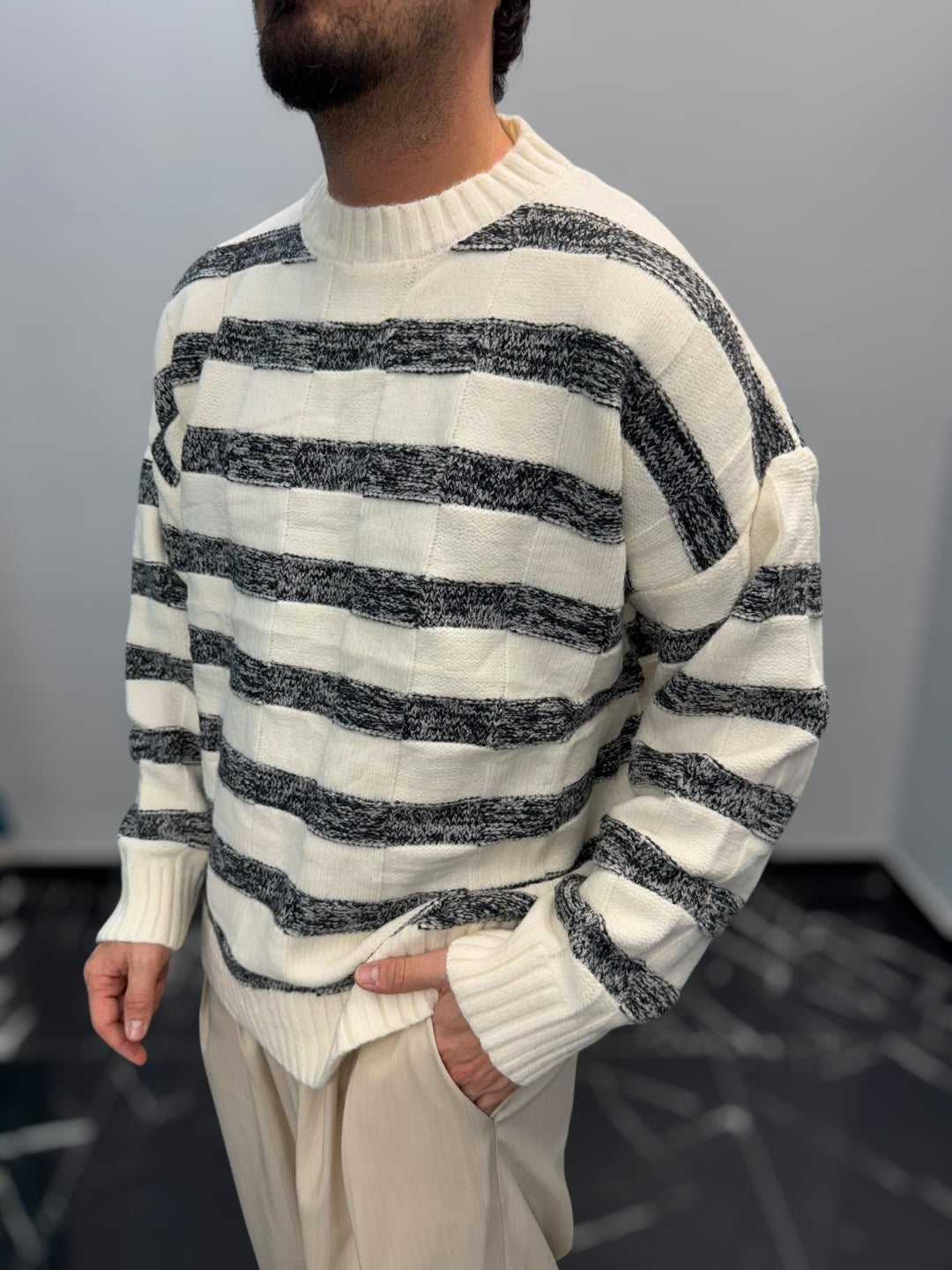 Base avorio con strisce nere spesse e regolari, per un look elegante e senza tempo.