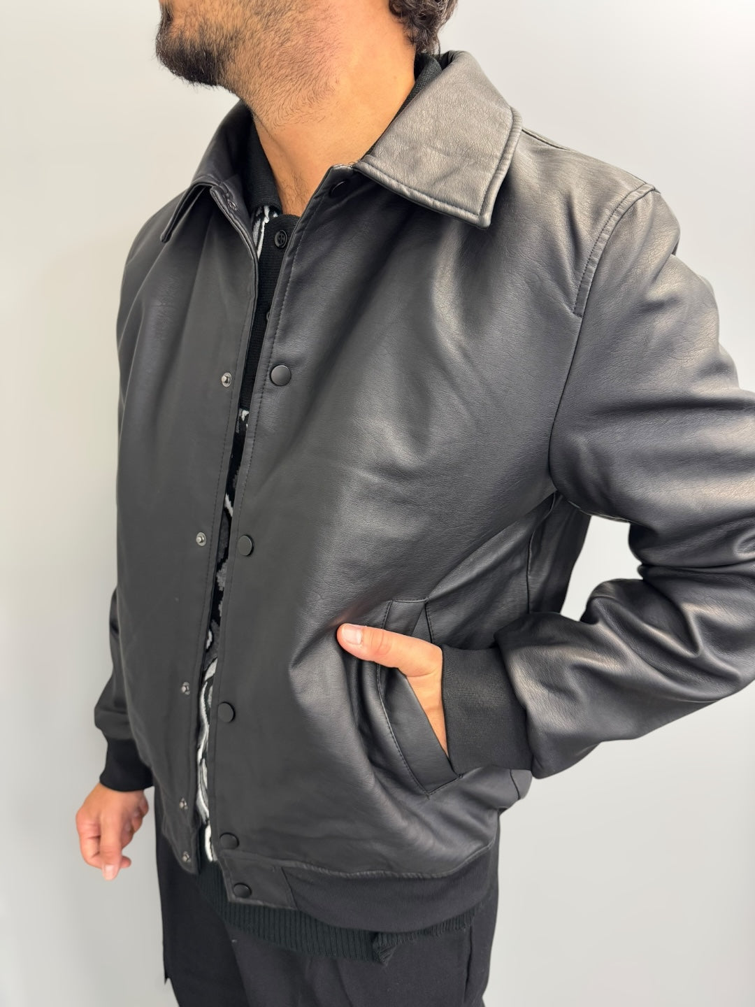 Ecco un bomber in ecopelle dallo stile grintoso e moderno, perfetto per aggiungere carattere a qualsiasi outfit. Questo modello presenta una chiusura frontale con bottoni a pressione, che dona un tocco contemporaneo e pratico. Con colletto che aggiunge un dettaglio sofisticato.