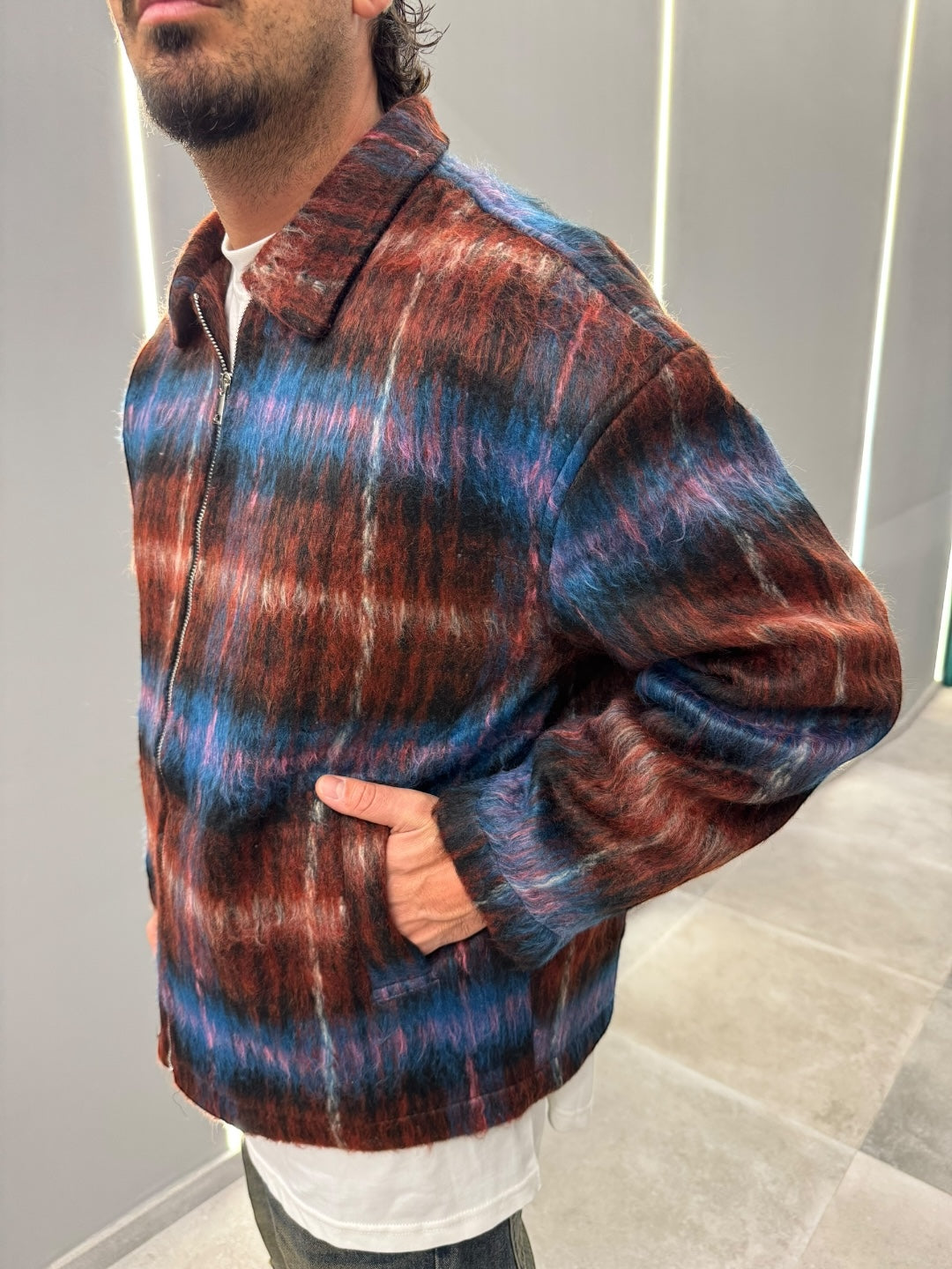 Realizzato con un tessuto morbido e dall’effetto leggermente “hairy”, dona subito un vibe premium, mentre la zip metallica frontale e le tasche laterali lo rendono pratico e perfetto per l’uso quotidiano.