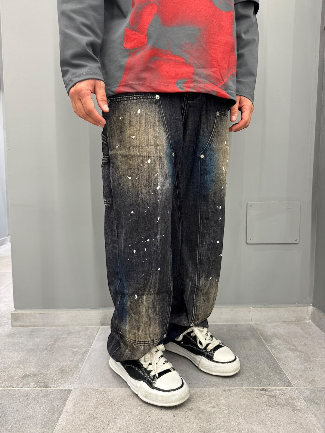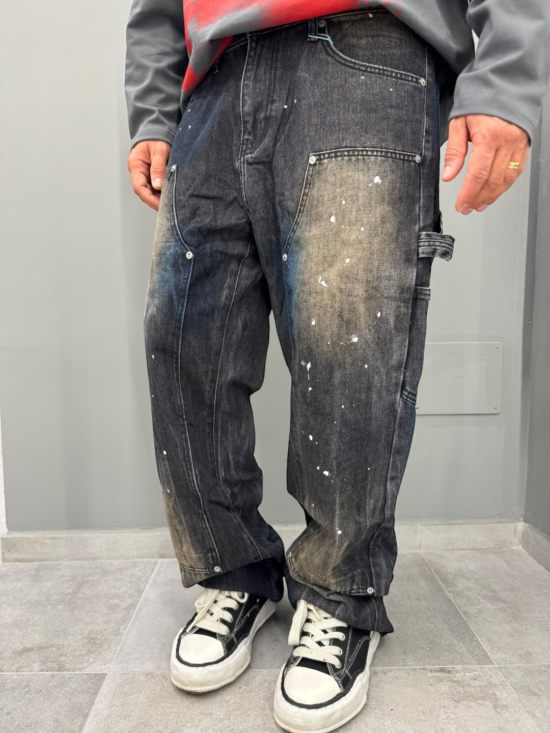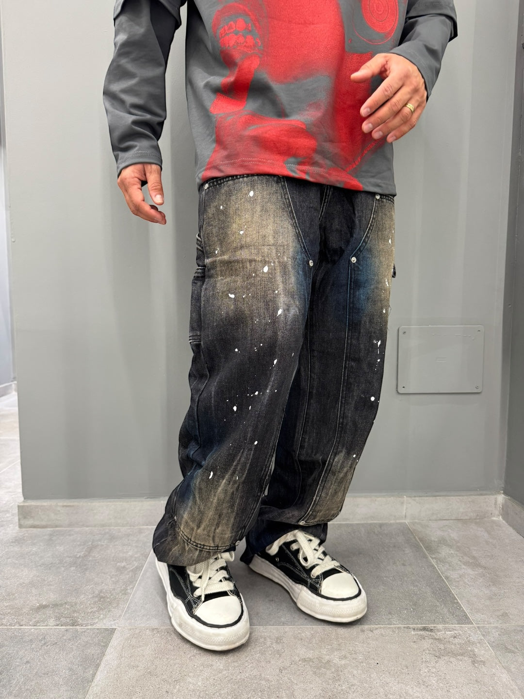 Scopri il denim baggy perfetto per chi ama uno stile urbano e disinvolto. Questo jeans è caratterizzato da un taglio ampio e comodo, ideale per chi cerca libertà di movimento senza rinunciare al look. Il lavaggio scuro con dettagli sbiaditi e schizzi di vernice conferisce un aspetto vissuto e autentico, perfetto per chi ama distinguersi con personalità.
