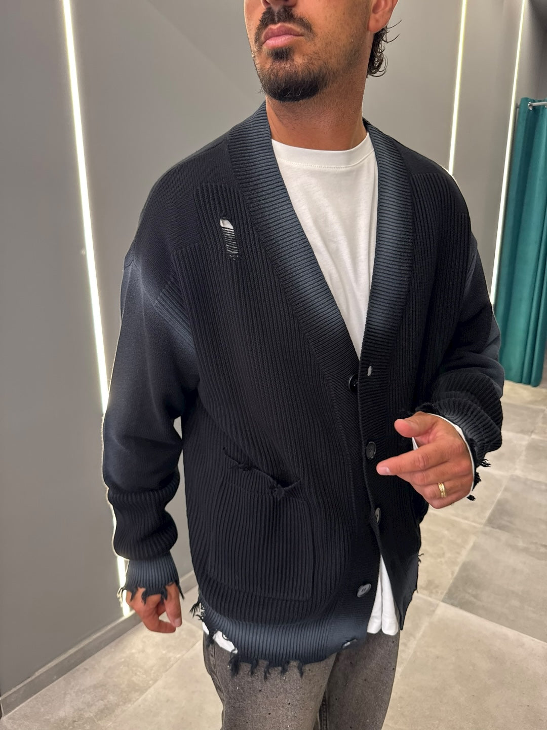 Scopri il cardigan oversize che rivoluziona il tuo look: un mix perfetto tra comfort, stile e carattere! Realizzato in morbido tessuto a maglia con un raffinato gioco di trame a coste, questo capo dal taglio ampio si distingue per il design urban contemporaneo impreziosito da piccoli dettagli di effetto "vissuto" con leggere rotture sulle maniche, sul bordo e sul corpo del cardigan.