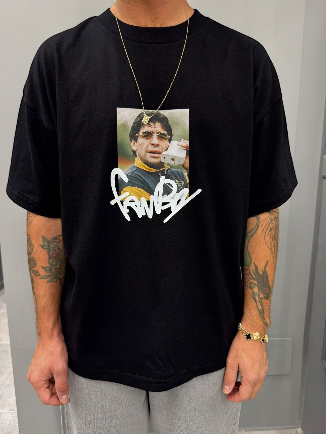Questa t-shirt nera dal fit rilassato è il capo ideale per chi vuole esprimere personalità senza sforzo. Il fronte presenta una stampa fotografica dal mood retrò, con Maradona dall’atteggiamento deciso e carismatico, resa ancora più distintiva dalla firma grafica in stile street che aggiunge carattere e unicità.