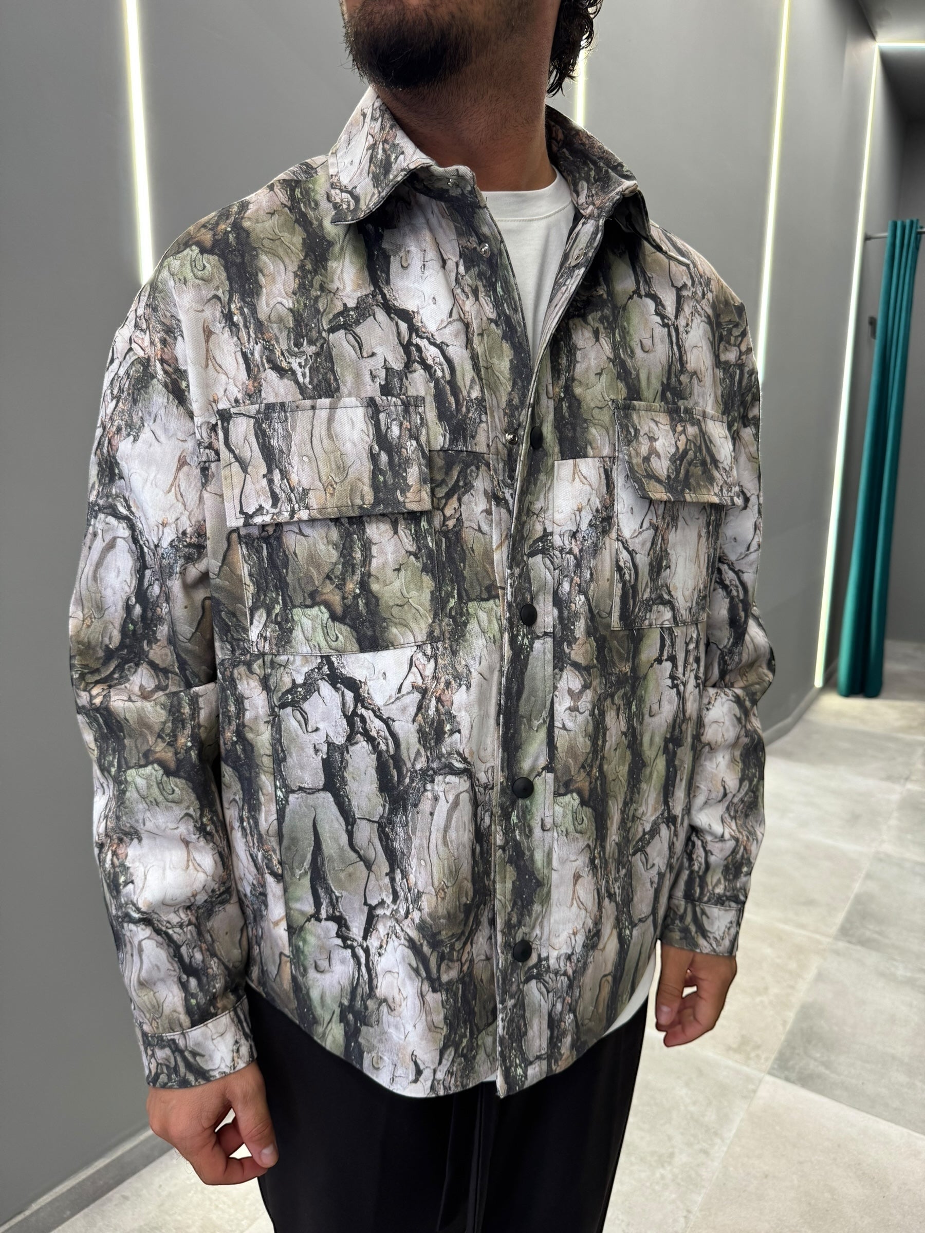 Scopri l'eleganza casual di questa giacca overshirt dal design unico che richiama le trame naturali della corteccia d'albero. Realizzata con materiali di alta qualità, questa giacca offre una vestibilità comoda e moderna grazie al suo taglio leggermente ampio, perfetto per essere indossato sia sopra una t-shirt che su un maglione leggero.
