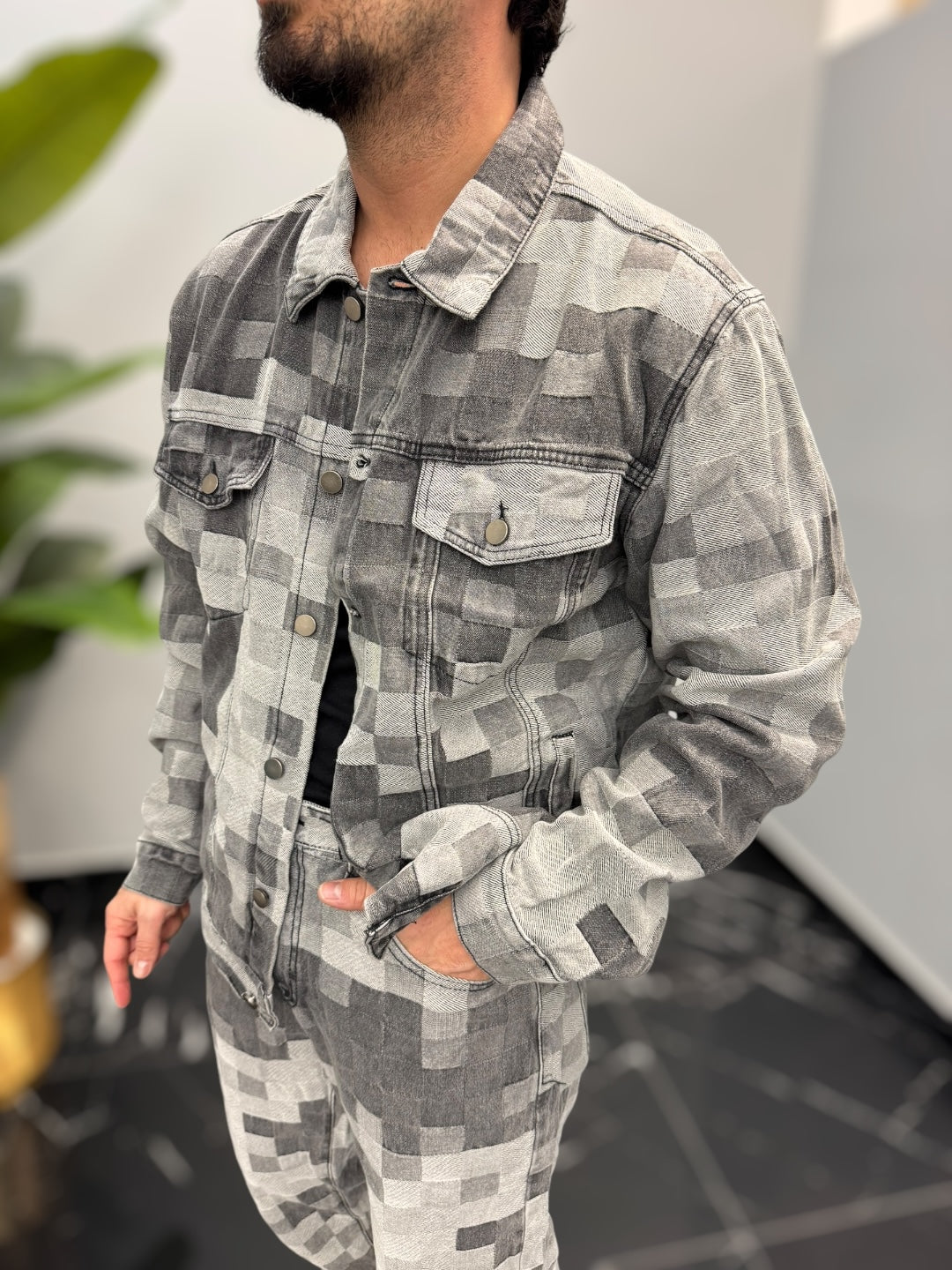 Immagina di indossare un coordinato che fonde stile, eleganza e comfort in un solo, irresistibile look. Questo set in jeans grigio e nero, con un’inconfondibile fantasia a quadri ispirata al monogram della Vuitton, è il mix perfetto tra luxury e streetwear. La trama elegante dei quadri gioca con il contrasto dei toni grigio e nero, creando un effetto visivo raffinato, ma dal carattere forte e deciso.