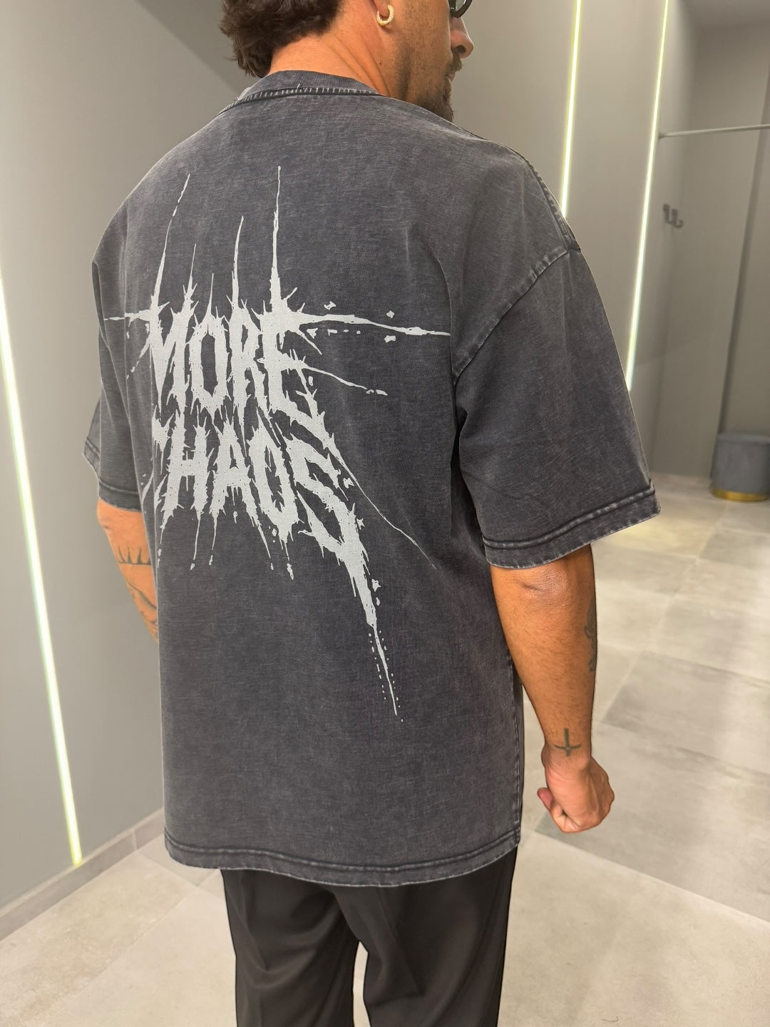 Il design unico sul retro, con la scritta "More Chaos" in uno stile grafico audace e graffiante, è il dettaglio che fa la differenza, regalando un look urbano e contemporaneo. Disponibile in due tonalità evergreen — bianco naturale e nero slavato — questa t-shirt si abbina facilmente a pantaloni larghi, jeans o bermuda, creando outfit d’impatto sia per il giorno sia per la sera.