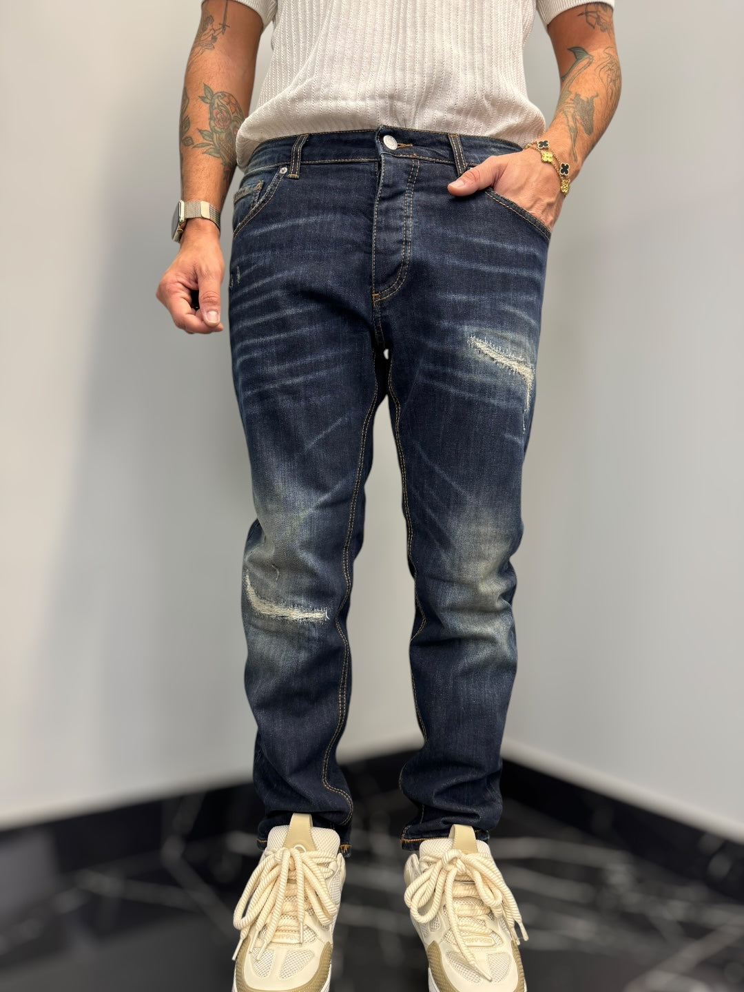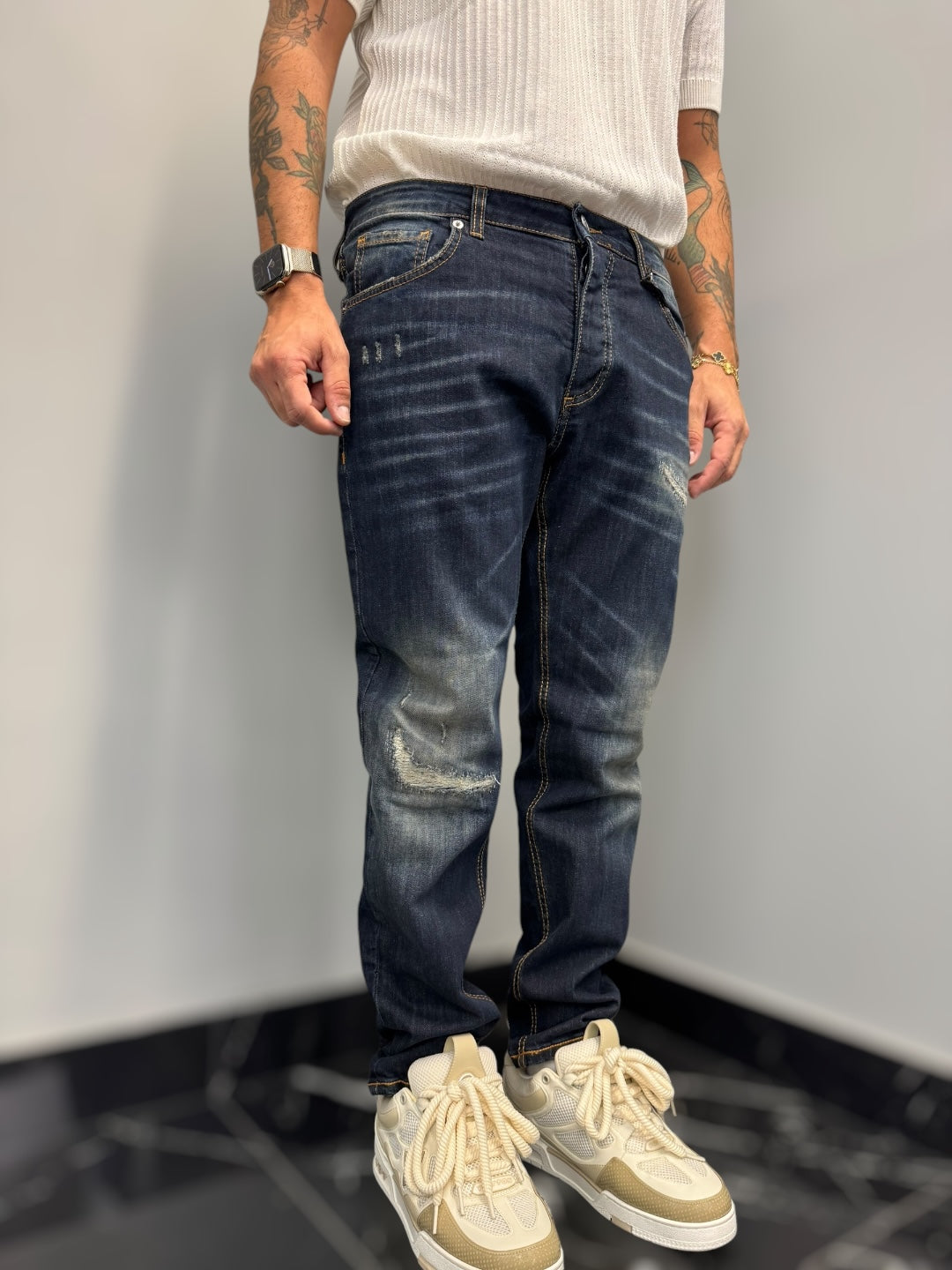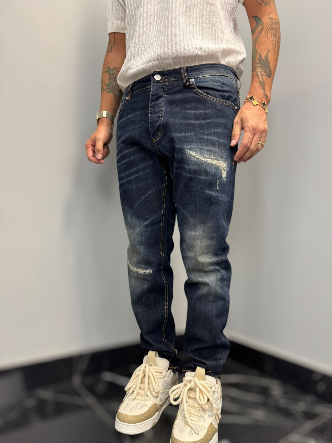 LAVAGGIO BLU SCURO SABBIATO CON SFUMATURE , ROTTURE E ABRASIONI.
