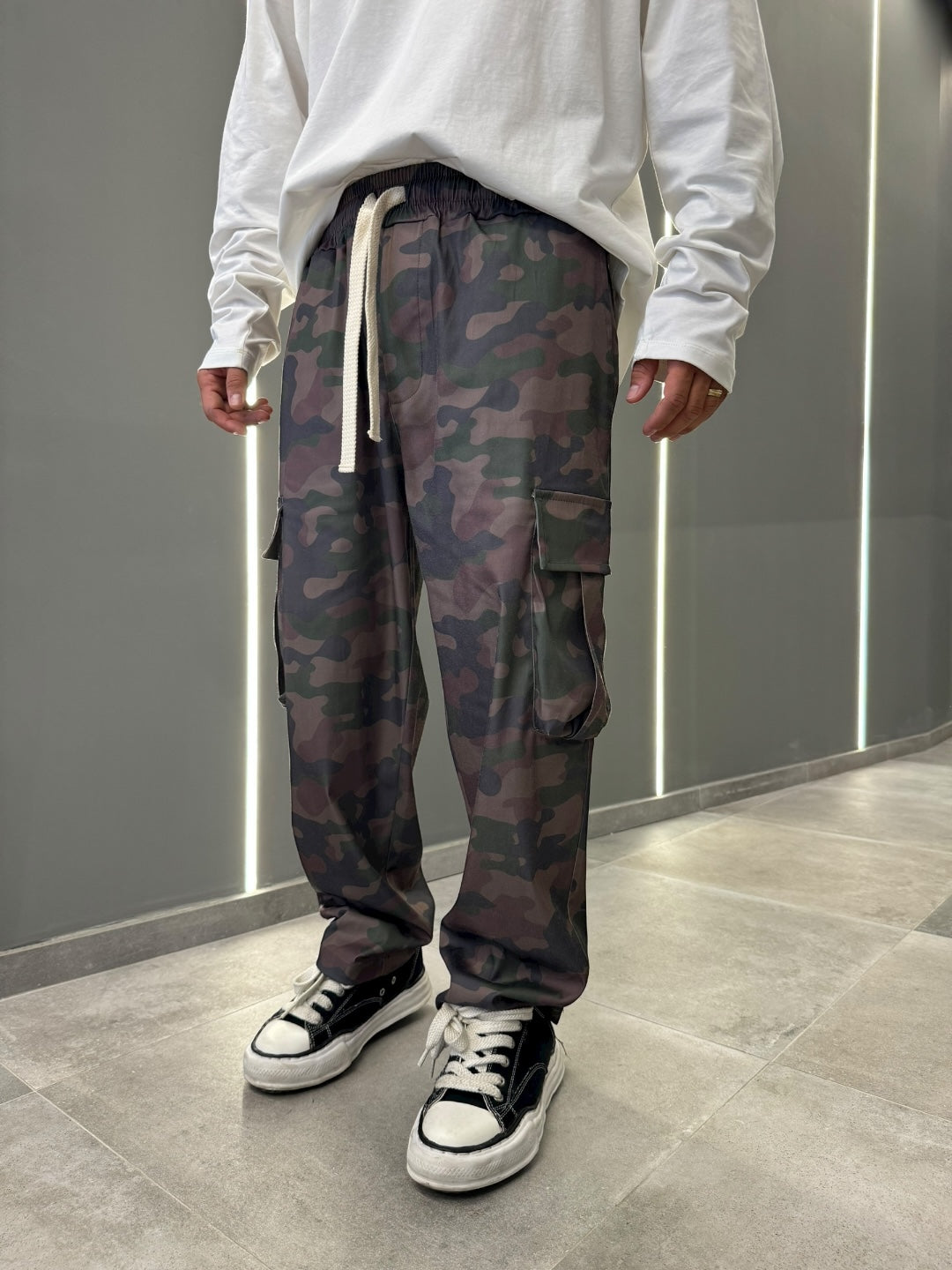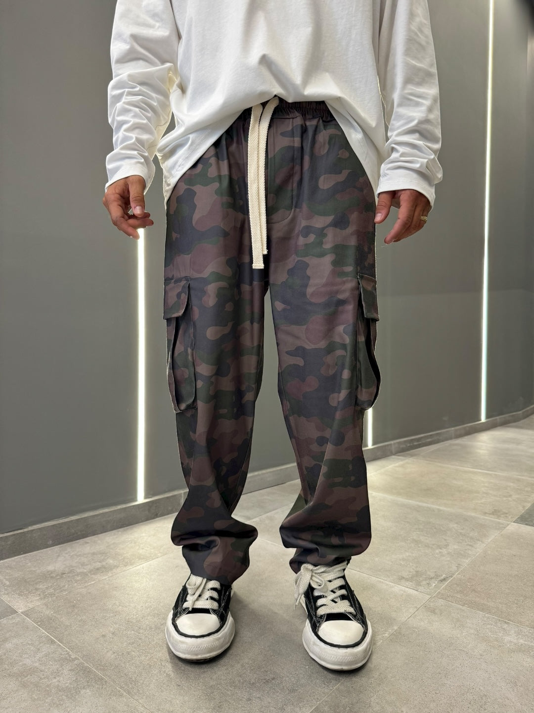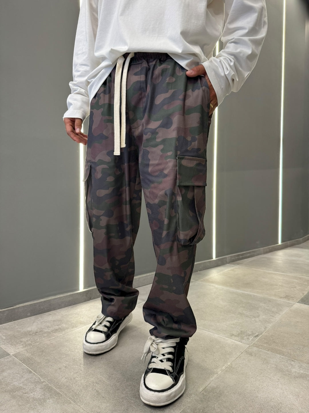 Scopri il massimo comfort e lo stile senza compromessi con i nostri pantaloni cargo camouflage! Realizzati in tessuto morbido e resistente, sono perfetti per chi ama un look casual e dinamico, senza rinunciare alla praticità. La fantasia mimetica in tonalità scure dona un tocco di grinta e originalità, mentre le ampie tasche laterali con patta assicurano spazio extra per portare con te tutto l'essenziale.