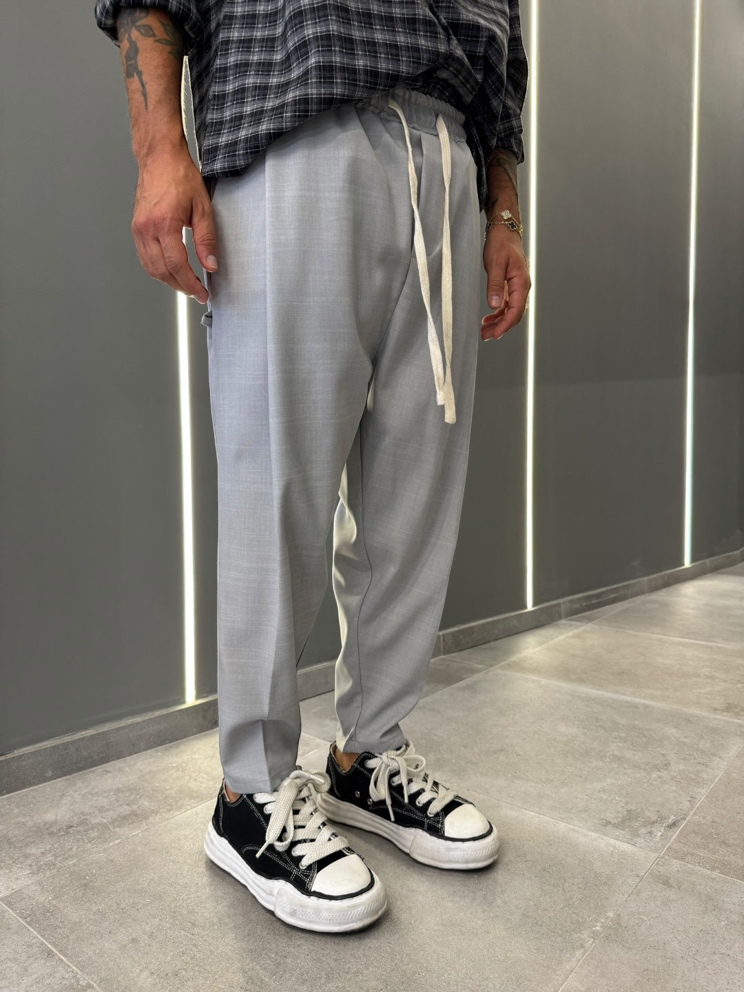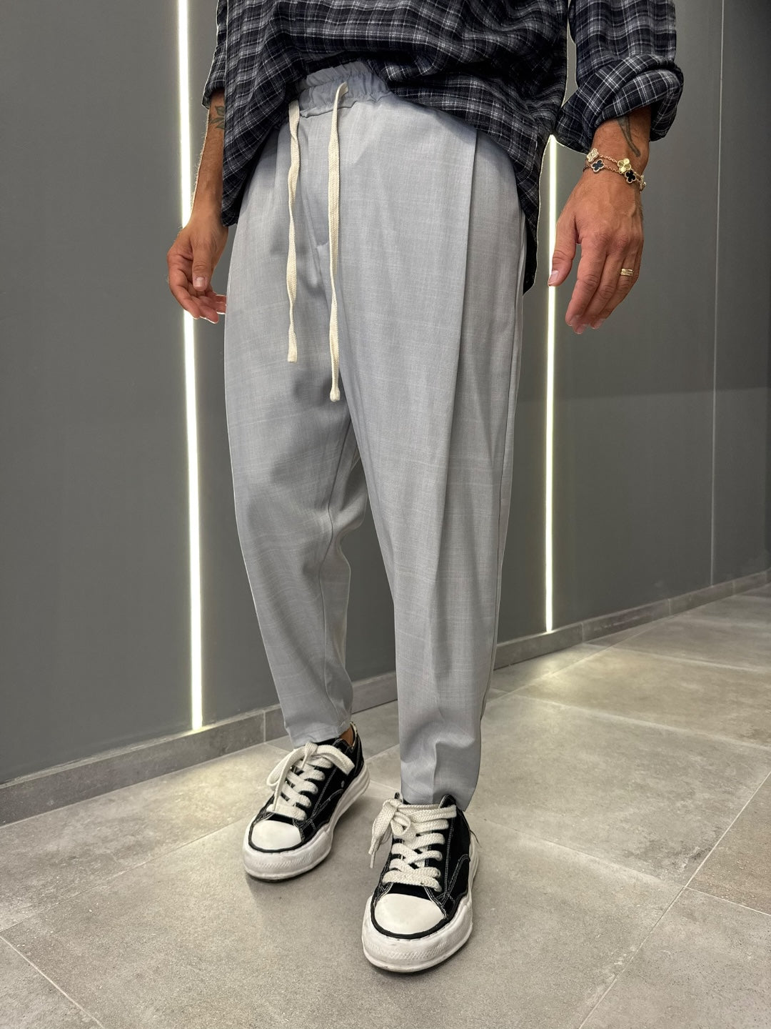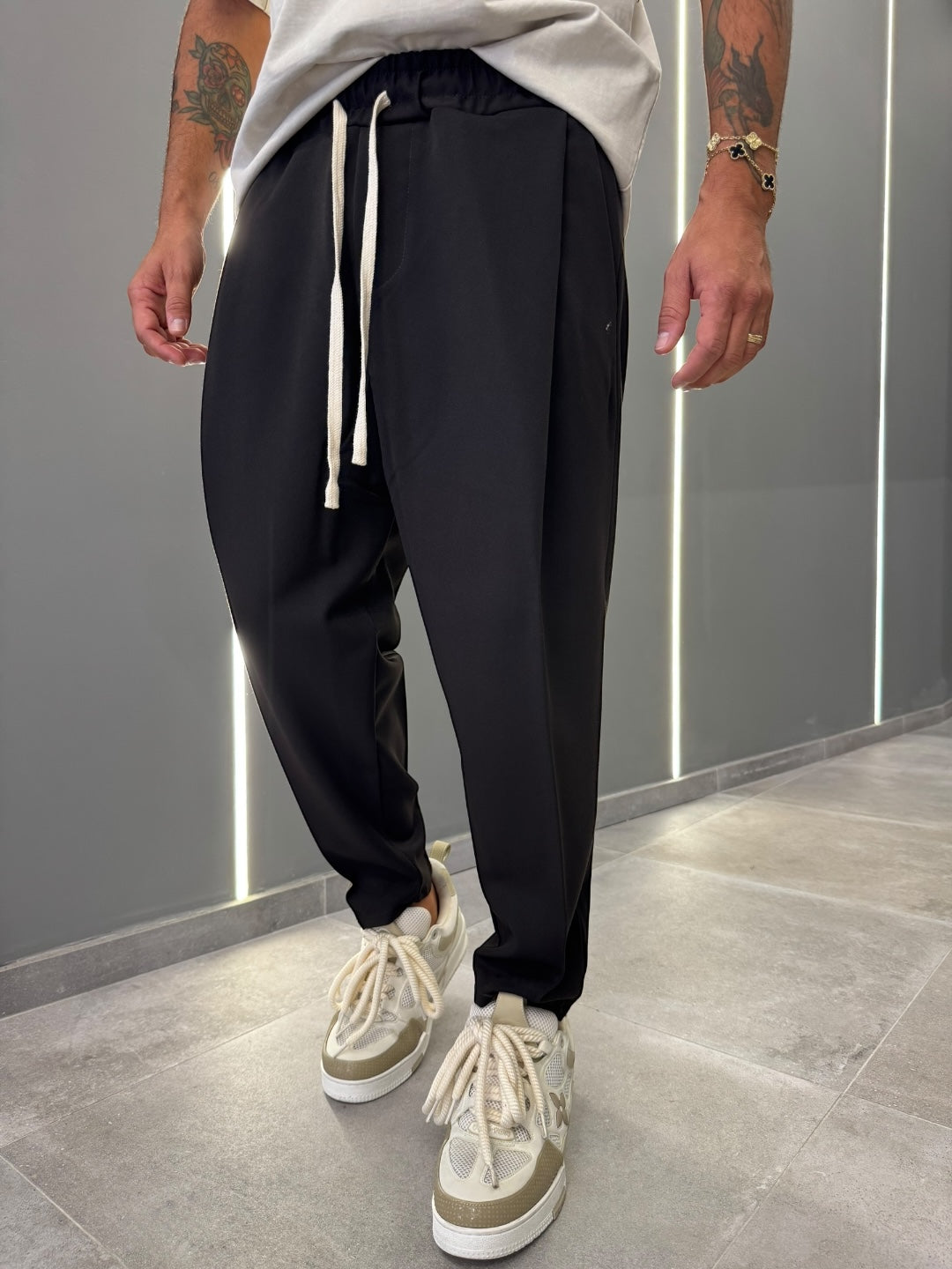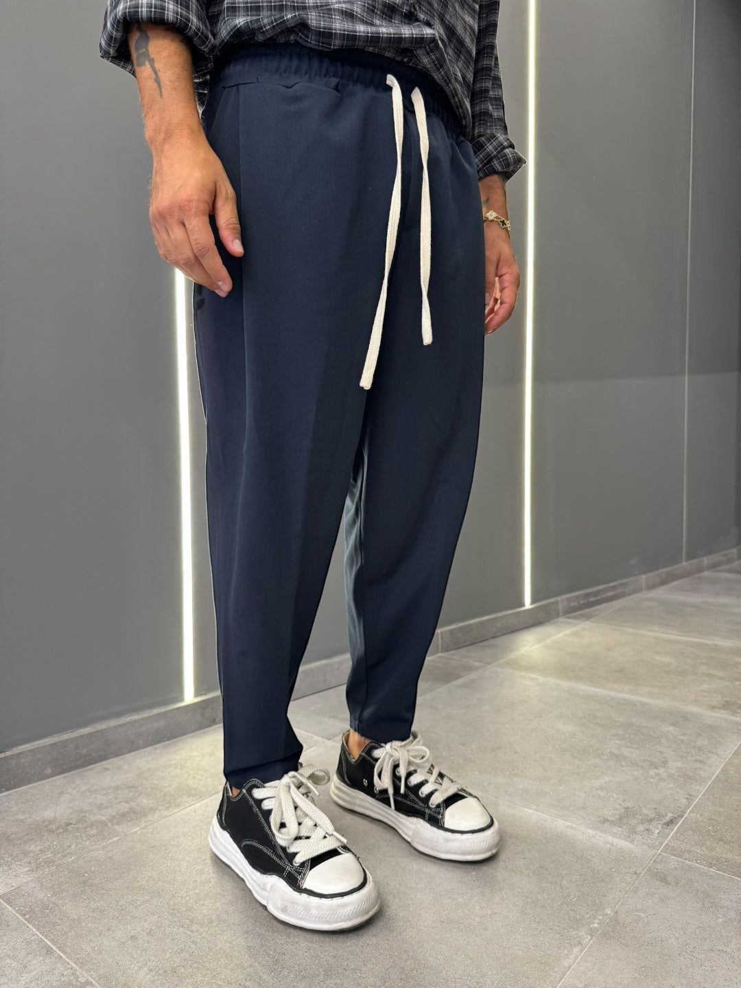 Questo pantalone con laccio è l’ideale per chi cerca un mix tra eleganza e comodità. La vestibilità è perfetta grazie alla costruzione con pence che dona volume nella parte alta, garantendo comfort sulla coscia, mentre il taglio si stringe gradualmente fino alla caviglia, per una silhouette moderna e slanciata.Dotato di pratiche tasche America sui lati, aggiunge funzionalità senza rinunciare allo stile. Il laccio in vita permette di regolare facilmente la vestibilità, adattandosi alle diverse esigenze di chi lo indossa. Questo pantalone si presta a diverse occasioni, da abbinare sia con una camicia per un look casual-elegante che con una t-shirt per uno stile più rilassato.