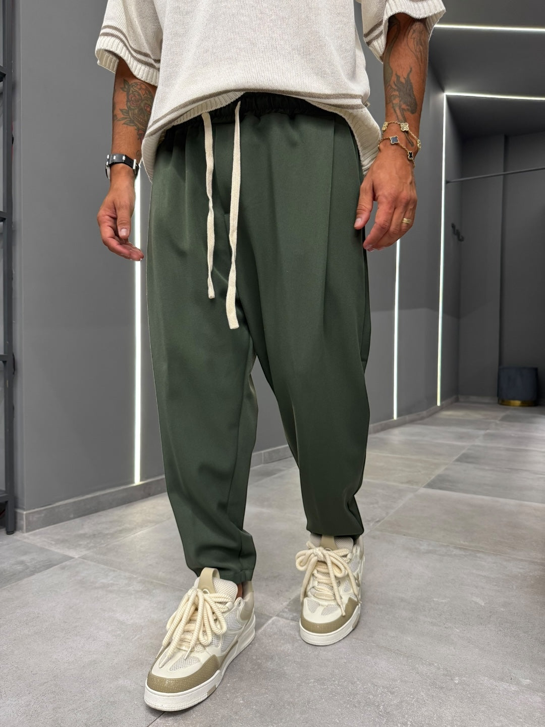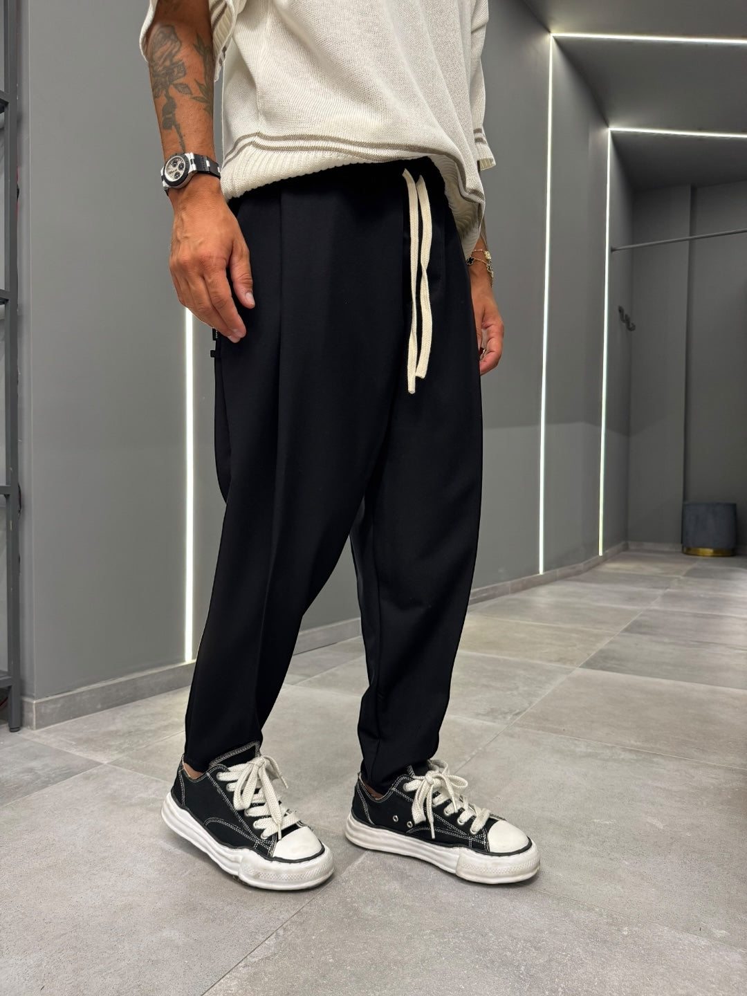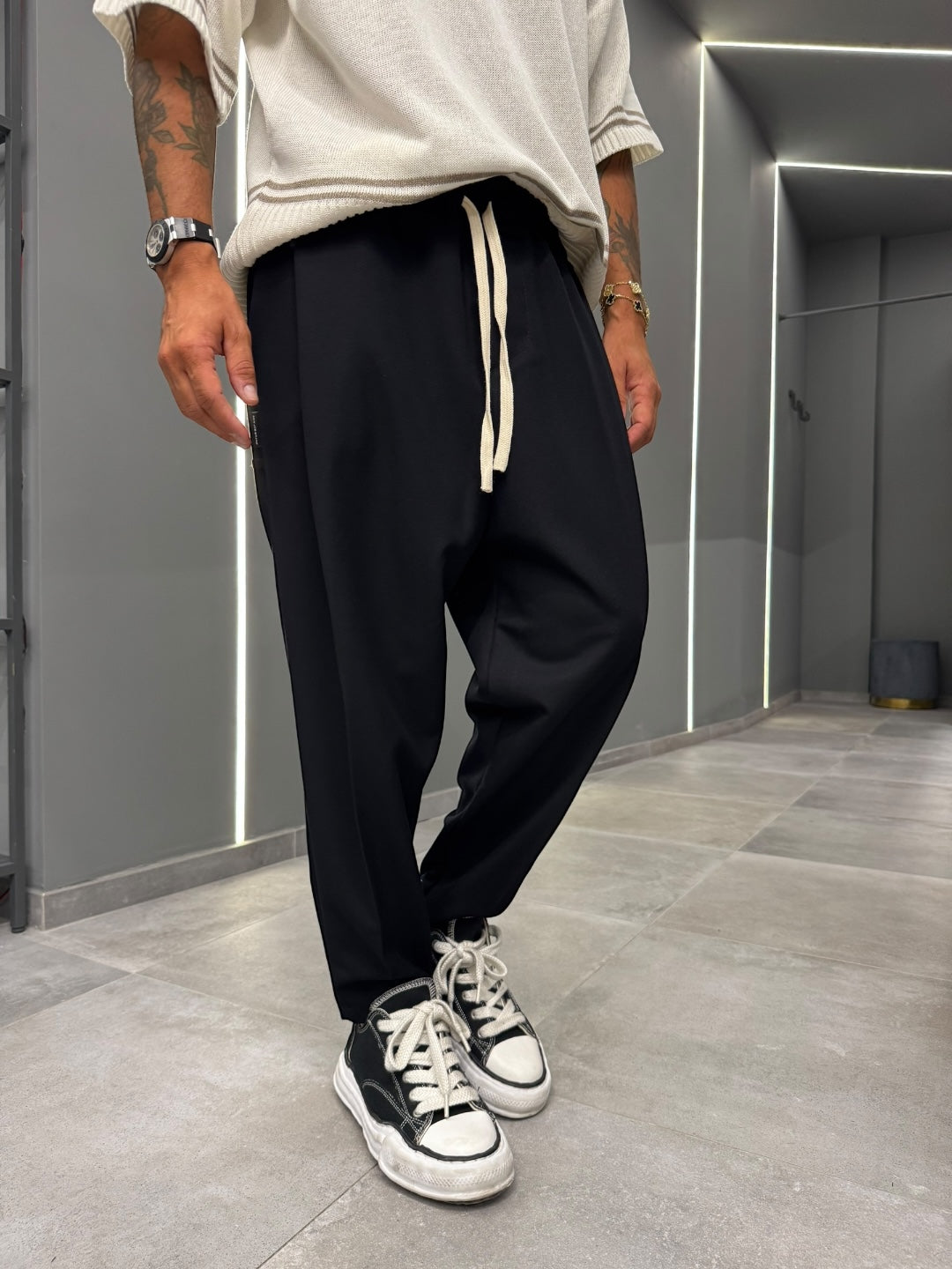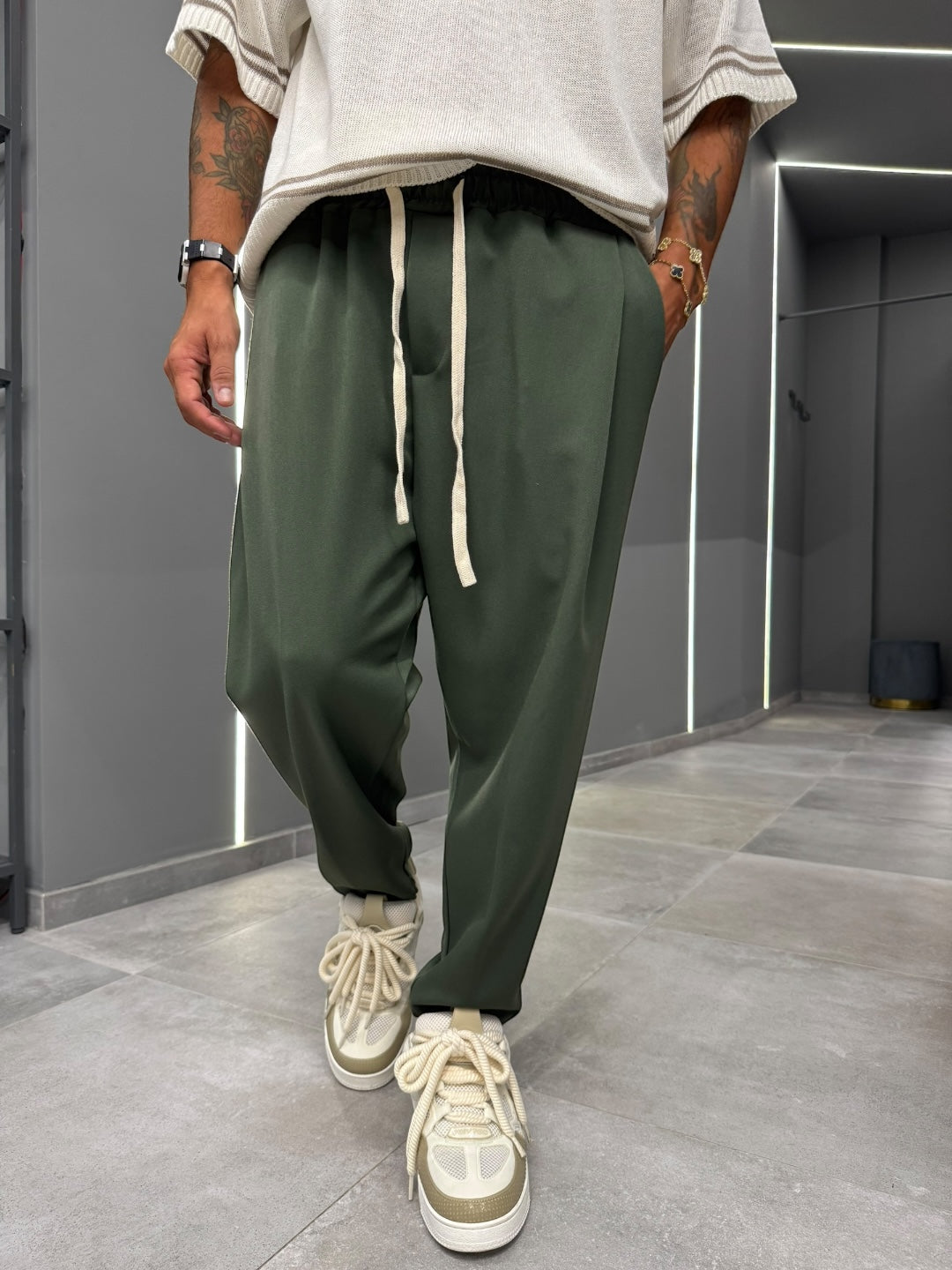 Questo pantalone con laccio è l’ideale per chi cerca un mix tra eleganza e comodità. La vestibilità è perfetta grazie alla costruzione con pence che dona volume nella parte alta, garantendo comfort sulla coscia, mentre il taglio si stringe gradualmente fino alla caviglia, per una silhouette moderna e slanciata.Dotato di pratiche tasche America sui lati, aggiunge funzionalità senza rinunciare allo stile. Il laccio in vita permette di regolare facilmente la vestibilità, adattandosi alle diverse esigenze di chi lo indossa. Questo pantalone si presta a diverse occasioni, da abbinare sia con una camicia per un look casual-elegante che con una t-shirt per uno stile più rilassato.