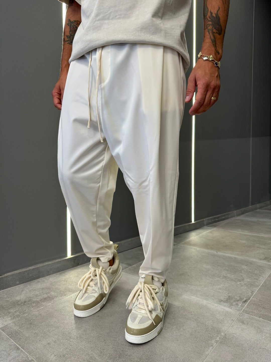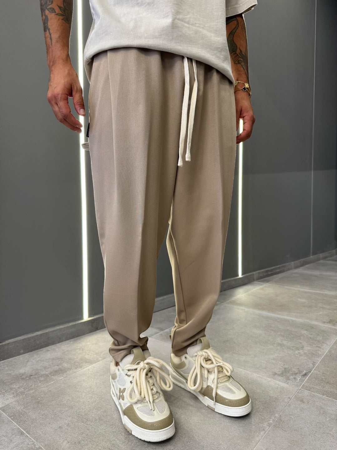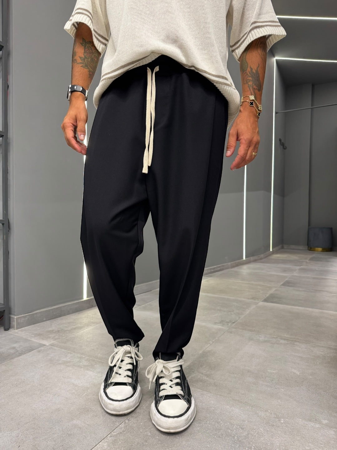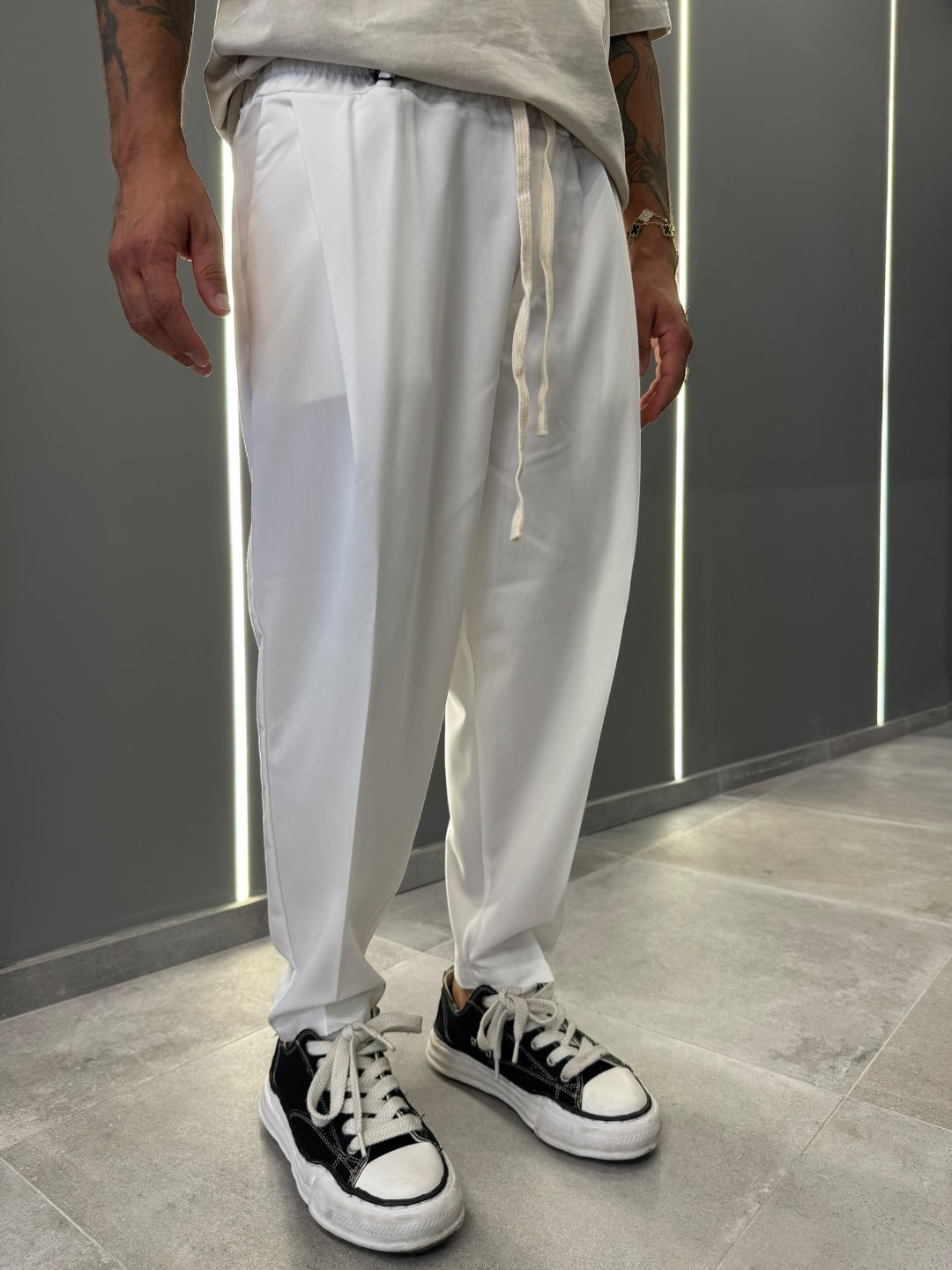 Questo pantalone con laccio è l’ideale per chi cerca un mix tra eleganza e comodità. La vestibilità è perfetta grazie alla costruzione con pence che dona volume nella parte alta, garantendo comfort sulla coscia, mentre il taglio si stringe gradualmente fino alla caviglia, per una silhouette moderna e slanciata.Dotato di pratiche tasche America sui lati, aggiunge funzionalità senza rinunciare allo stile. Il laccio in vita permette di regolare facilmente la vestibilità, adattandosi alle diverse esigenze di chi lo indossa. Questo pantalone si presta a diverse occasioni, da abbinare sia con una camicia per un look casual-elegante che con una t-shirt per uno stile più rilassato.