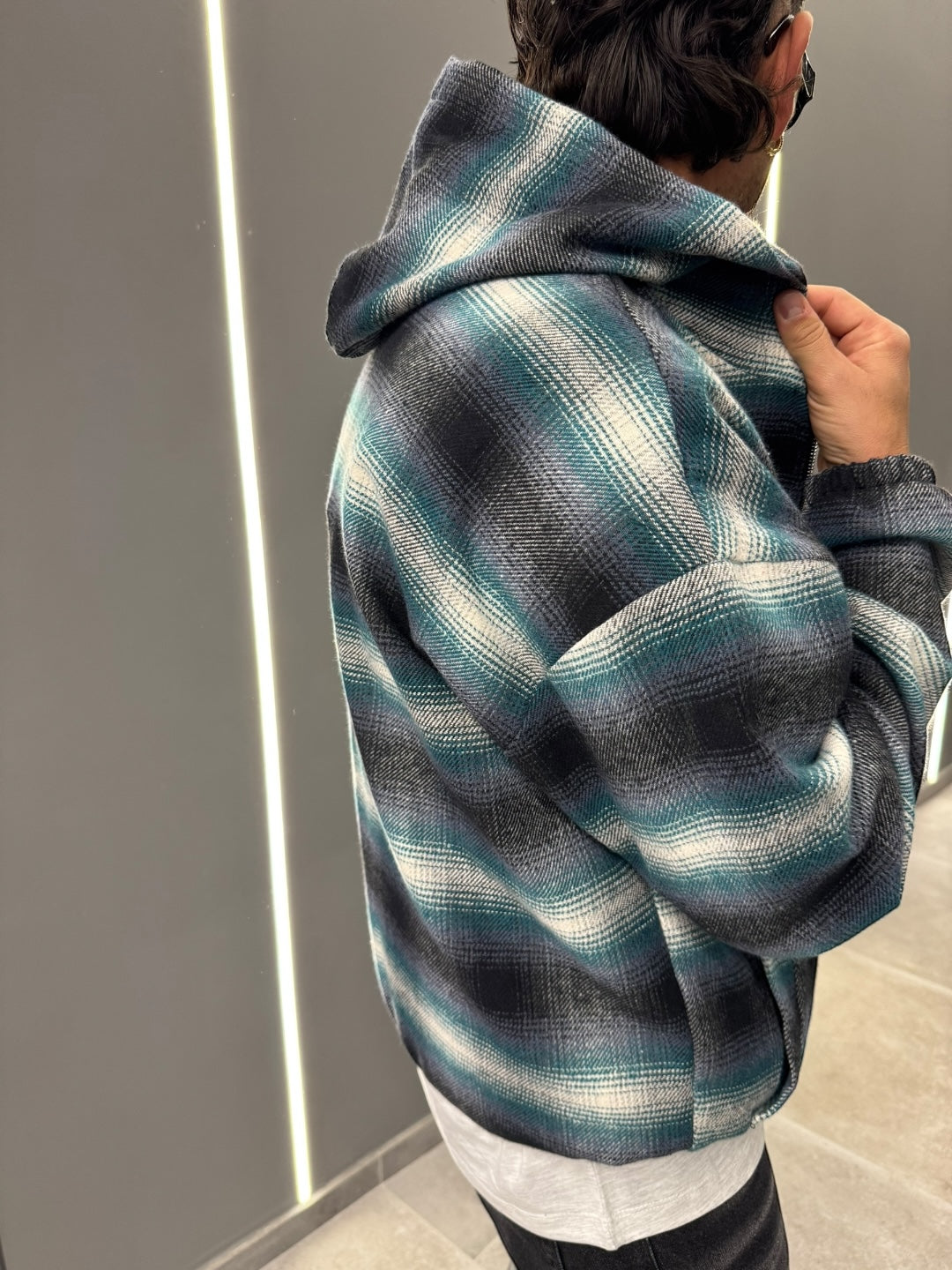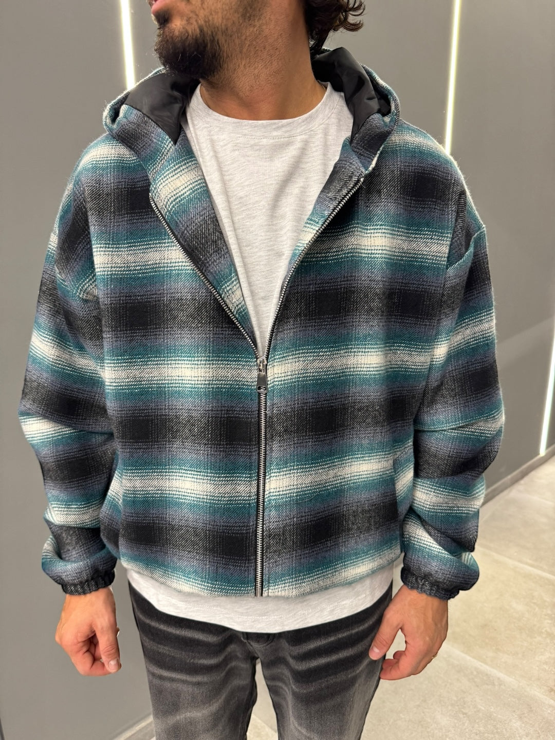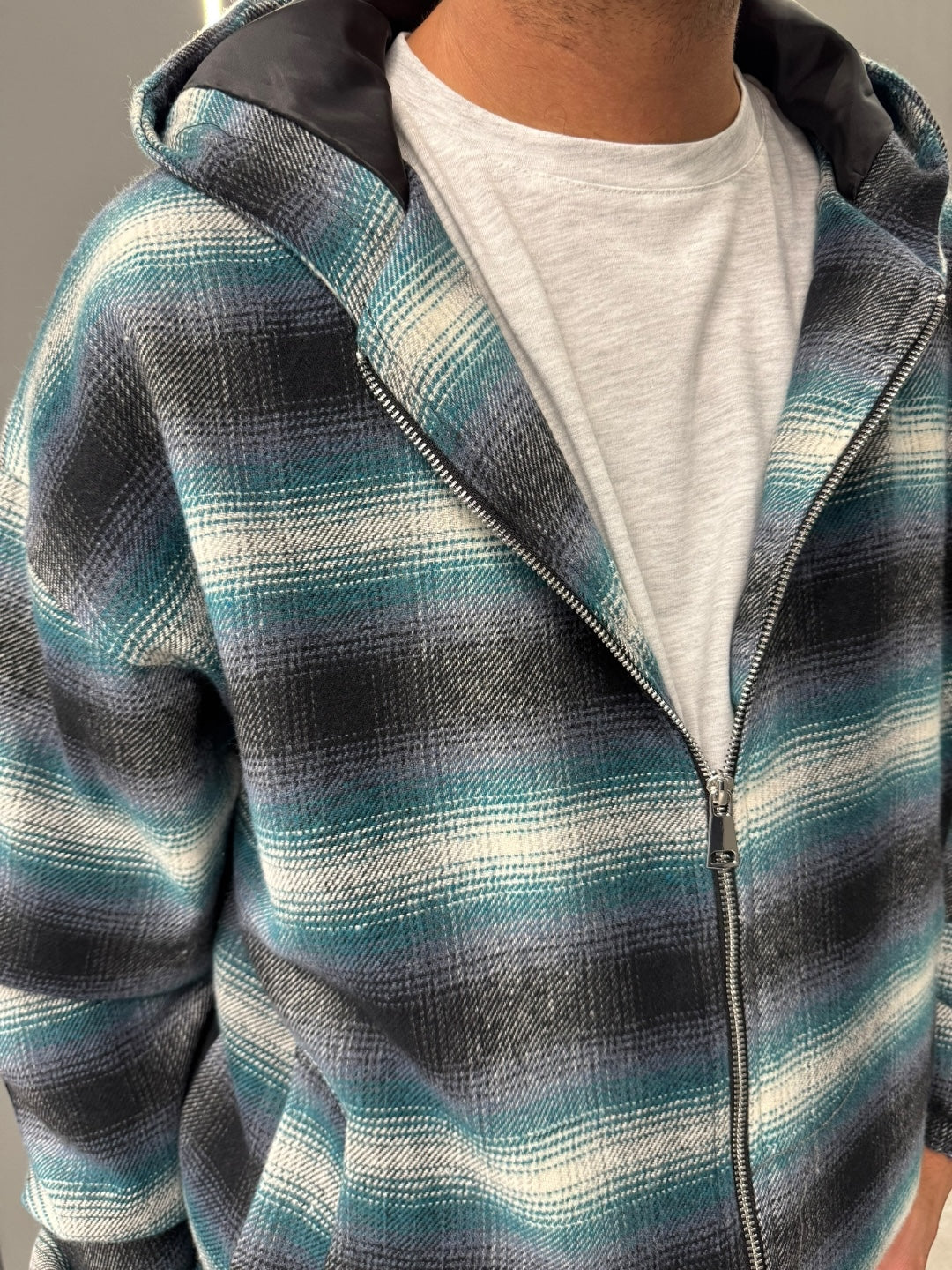 Unisce il calore della flanella spazzolata all’anima urbana di una giacca zip con cappuccio, perfetta per chi cerca uno stile rilassato ma deciso. Le sfumature fredde nei toni del petrolio, grigio e nero si fondono in un pattern check che non passa inosservato, aggiungendo profondità e personalità a qualsiasi outfit.
