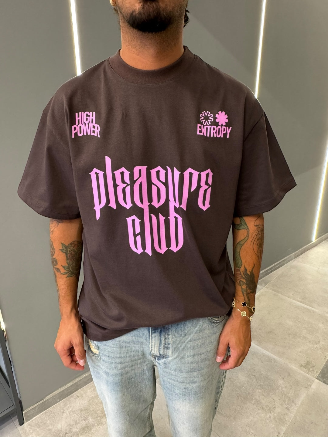 Scopri la nostra t-shirt esclusiva in cotone premium, pensata per chi vuole distinguersi con stile e comfort! Questo modello, caratterizzato da una stampa audace e moderna "pleasure club" in un rosa acceso che crea un contrasto unico con il tessuto marrone, è il pezzo perfetto per chi ama esprimere la propria personalità attraverso il look.
