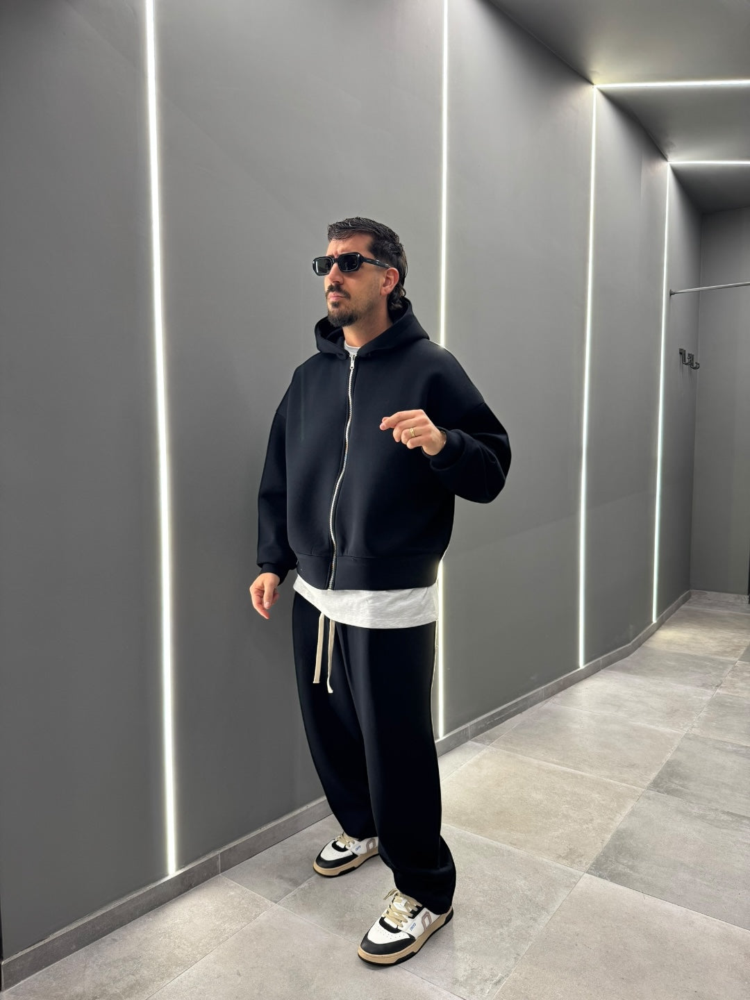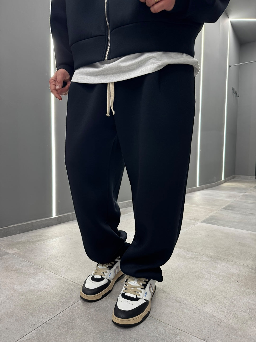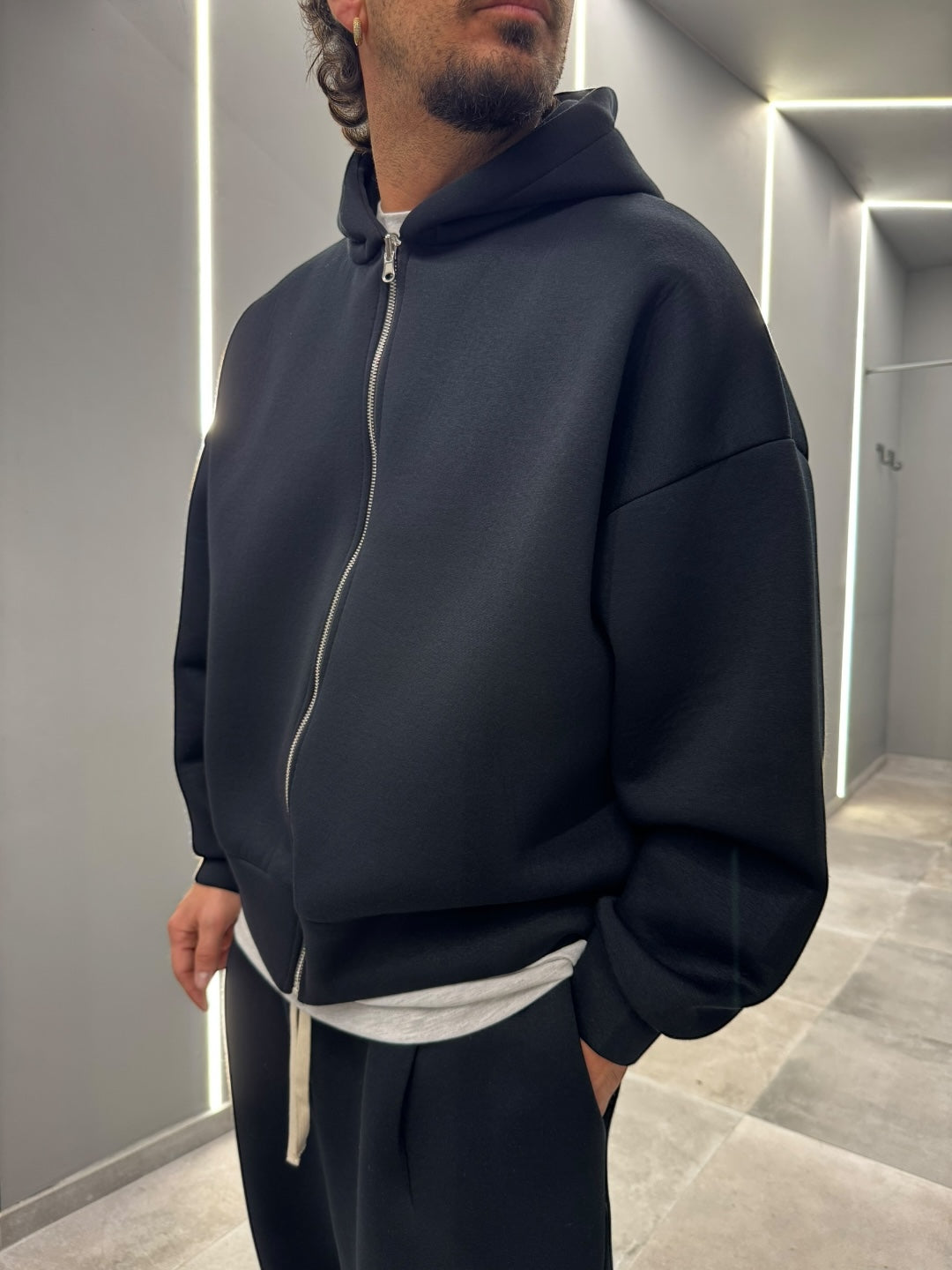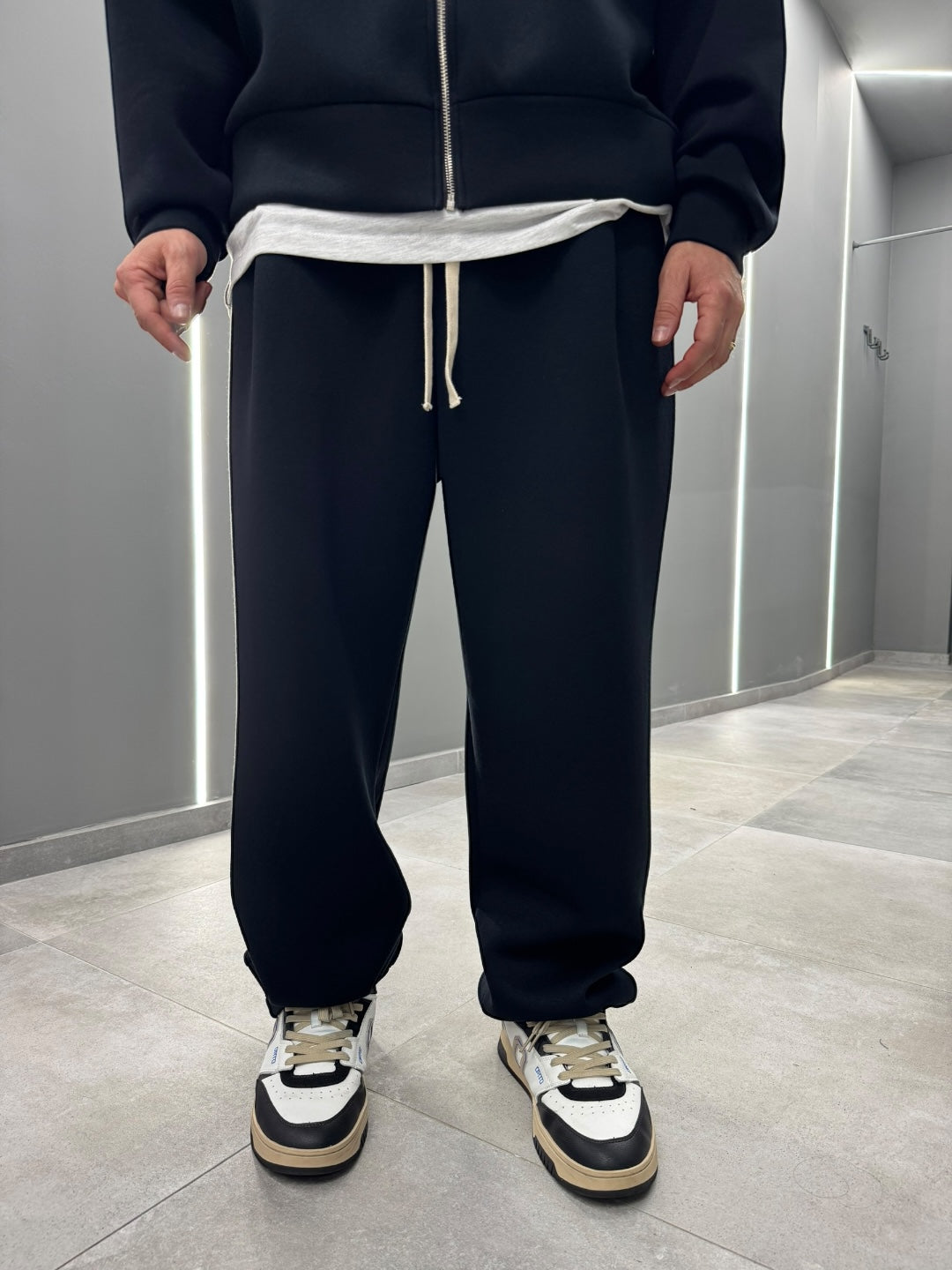 Coordinato tuta in tessuto scuba, dal design pulito e contemporaneo. Felpa con cappuccio e zip frontale abbinata a pantalone dal fit confortevole, morbido e strutturato allo stesso tempo. Ideale per un look urban e moderno, perfetto sia per il tempo libero che per outfit casual curati. Disponibile nei colori nero e blu notte.
