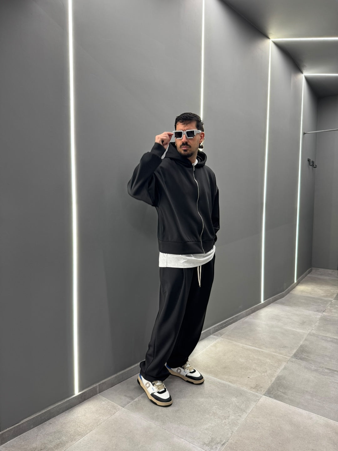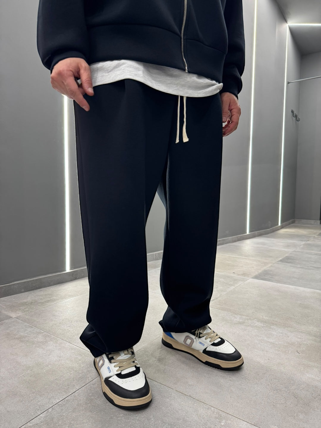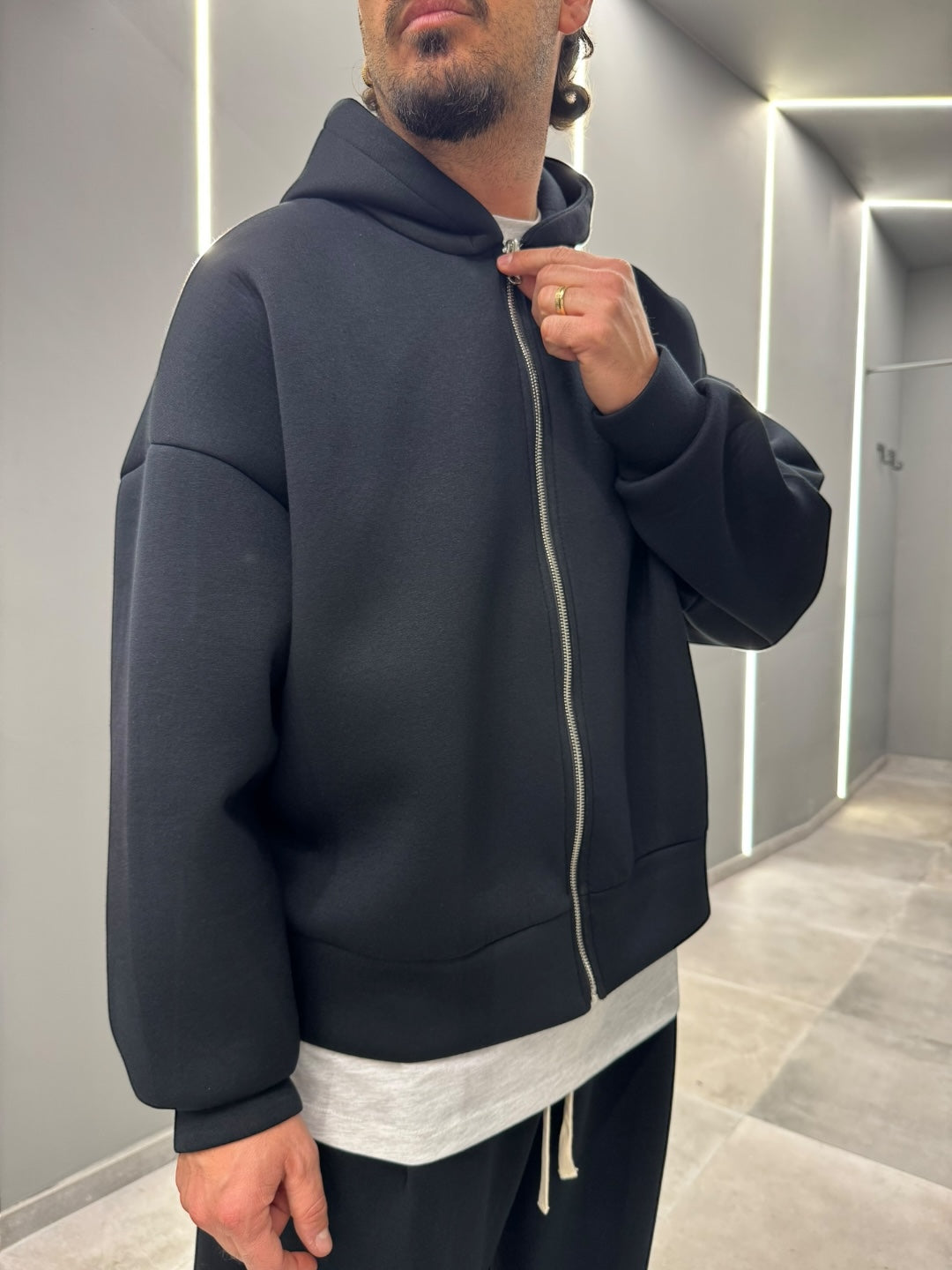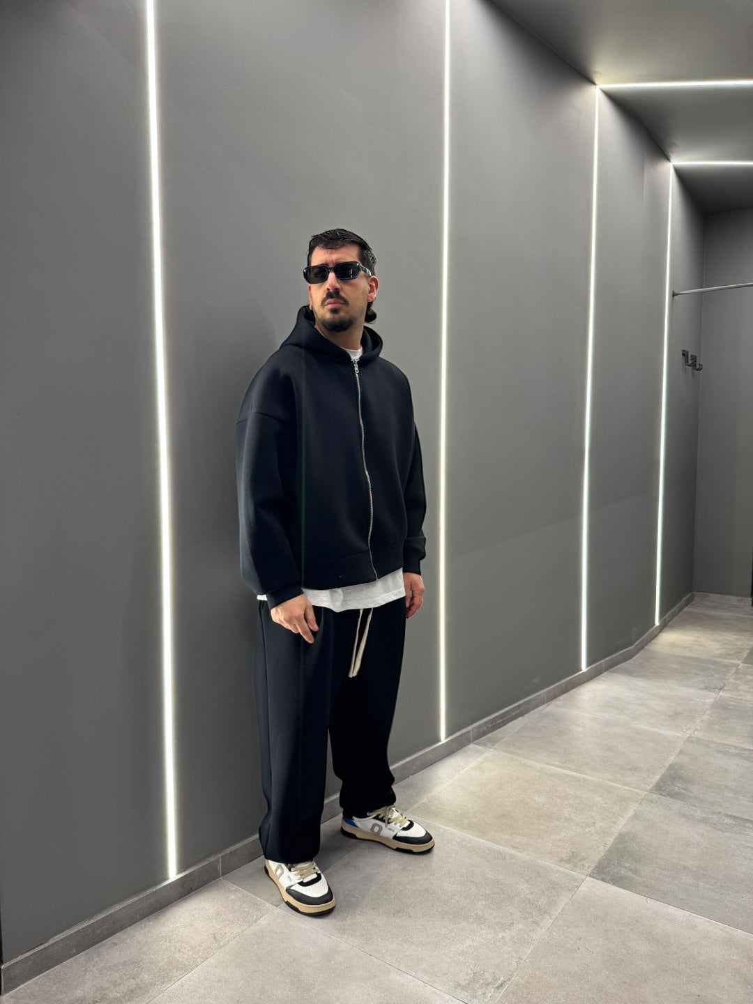 Coordinato tuta in tessuto scuba, dal design pulito e contemporaneo. Felpa con cappuccio e zip frontale abbinata a pantalone dal fit confortevole, morbido e strutturato allo stesso tempo. Ideale per un look urban e moderno, perfetto sia per il tempo libero che per outfit casual curati. Disponibile nei colori nero e blu notte.