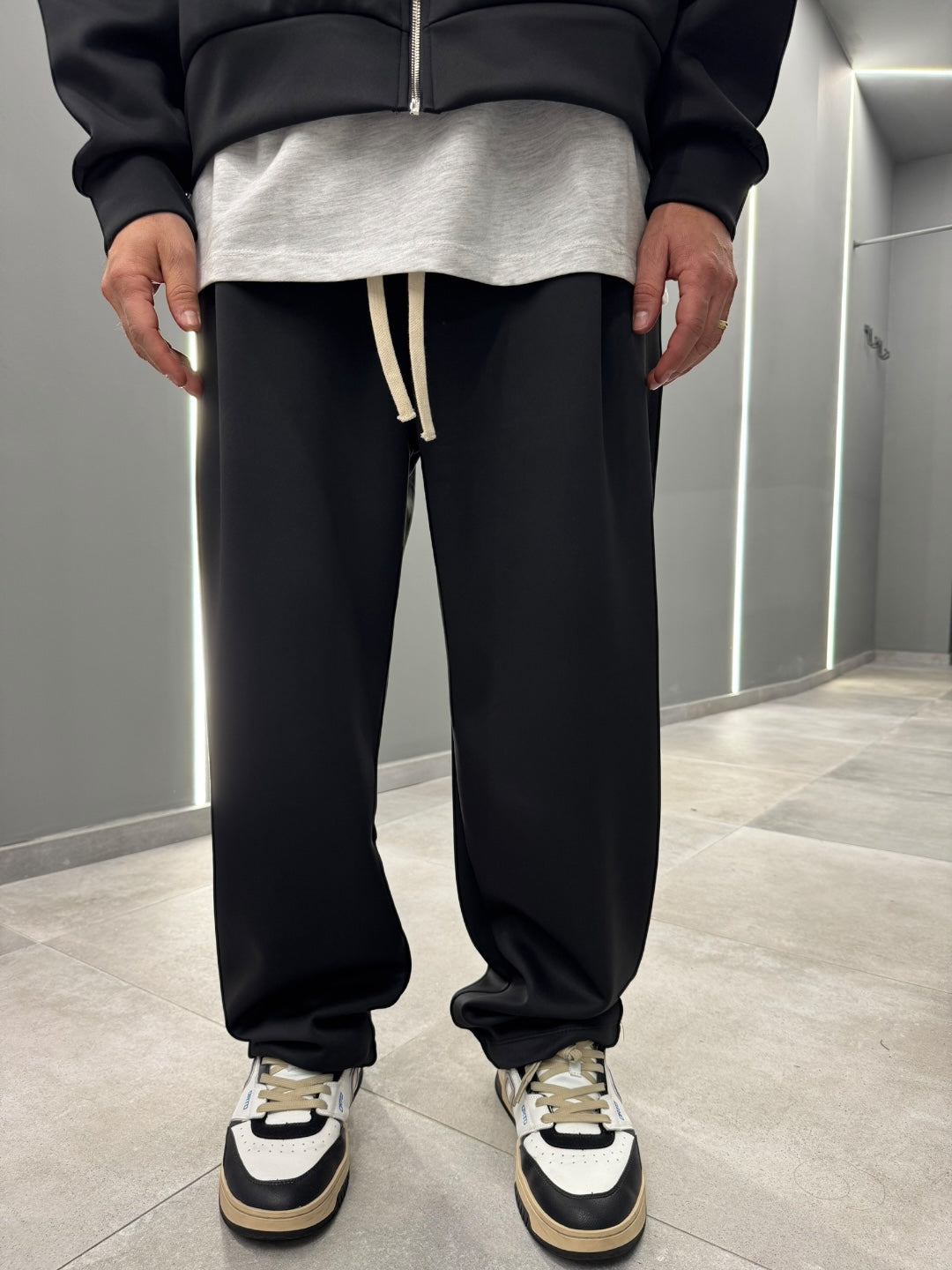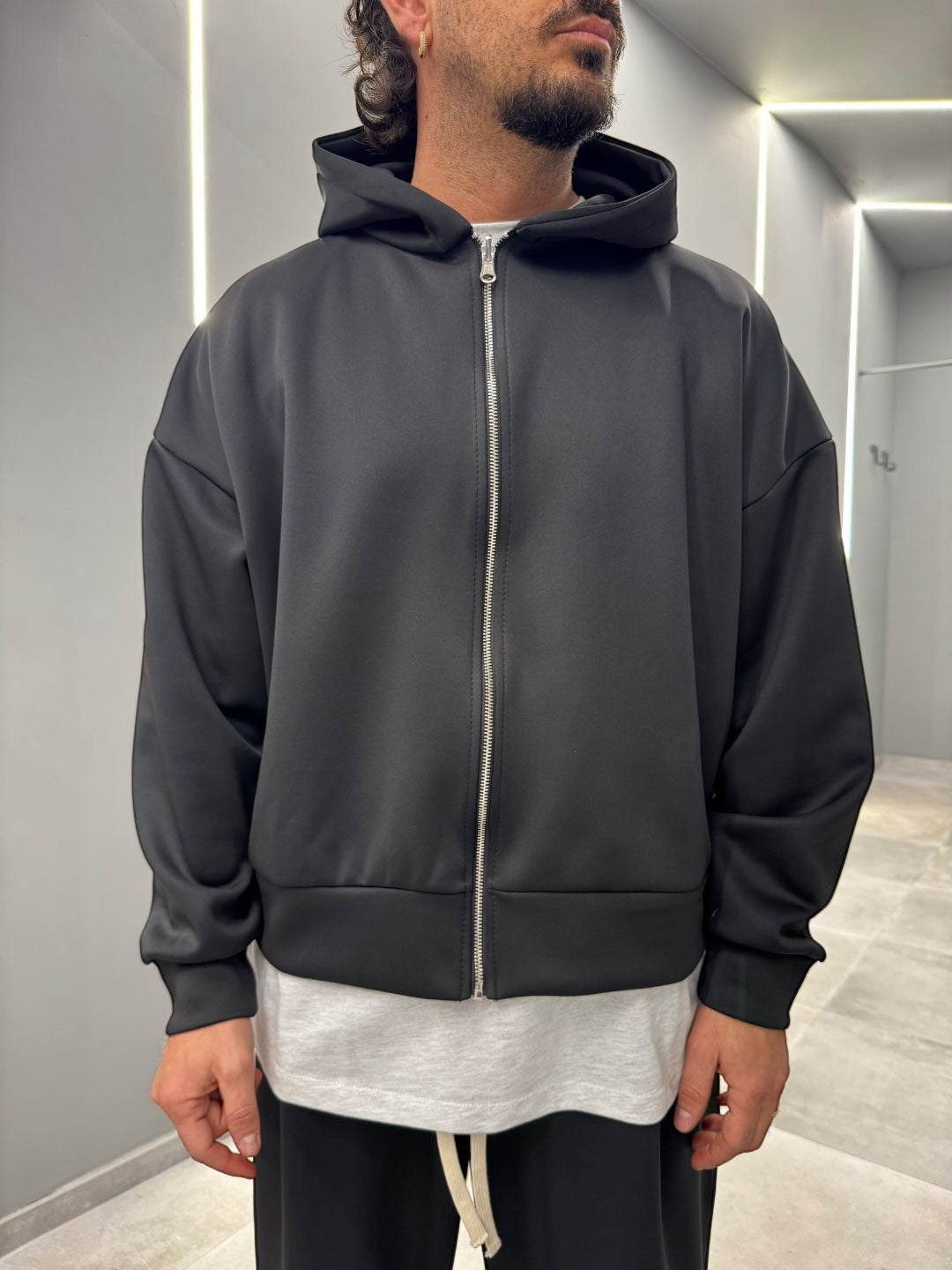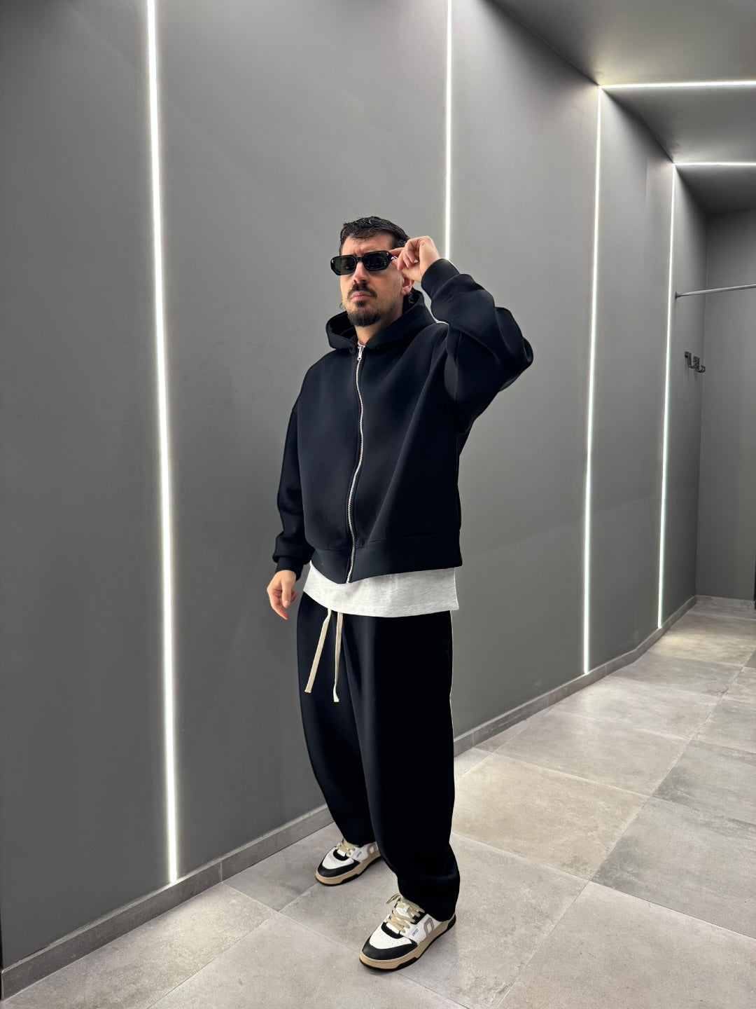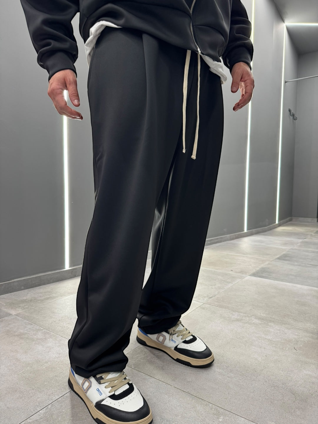 Coordinato tuta in tessuto scuba, dal design pulito e contemporaneo. Felpa con cappuccio e zip frontale abbinata a pantalone dal fit confortevole, morbido e strutturato allo stesso tempo. Ideale per un look urban e moderno, perfetto sia per il tempo libero che per outfit casual curati. Disponibile nei colori nero e blu notte.