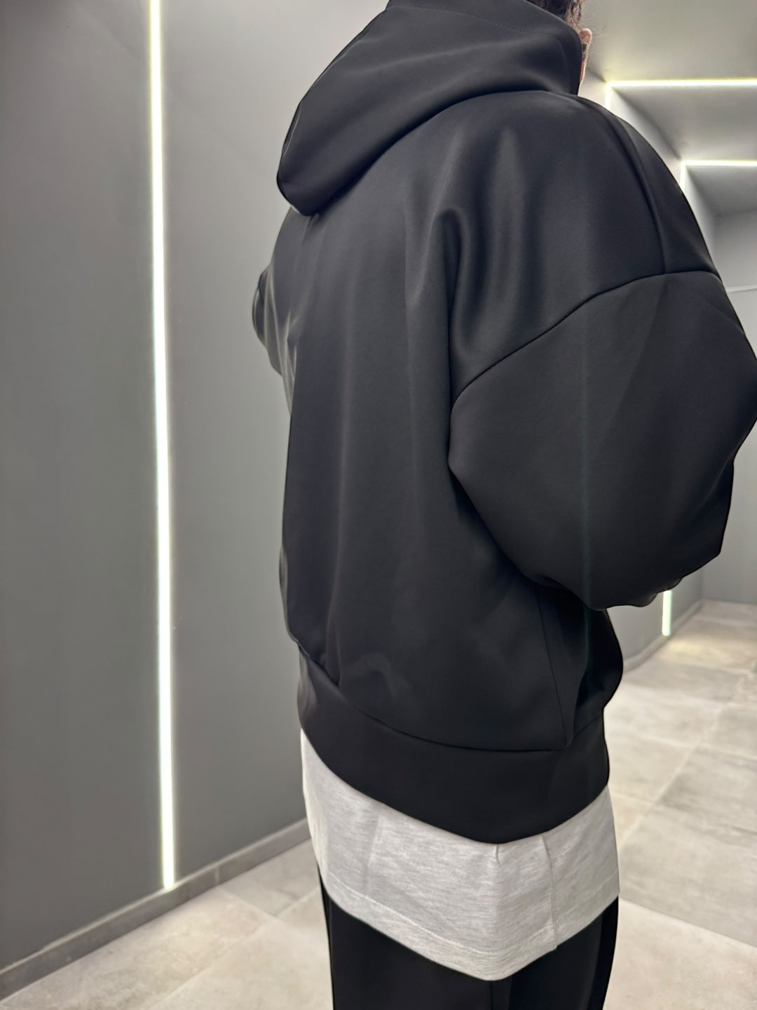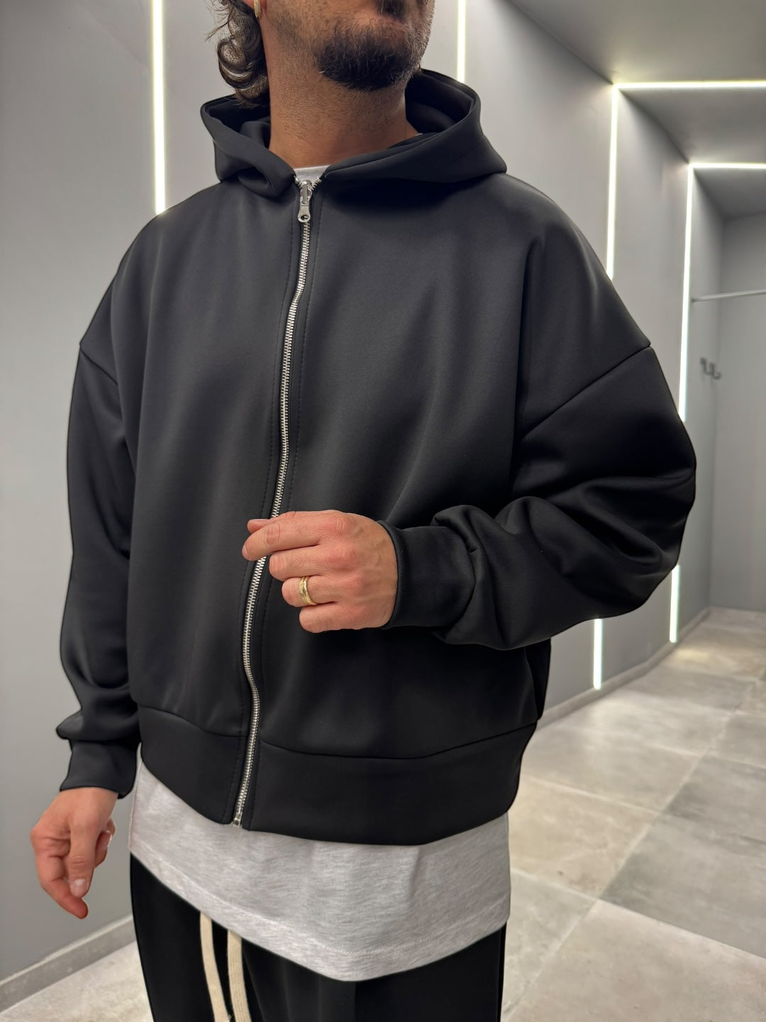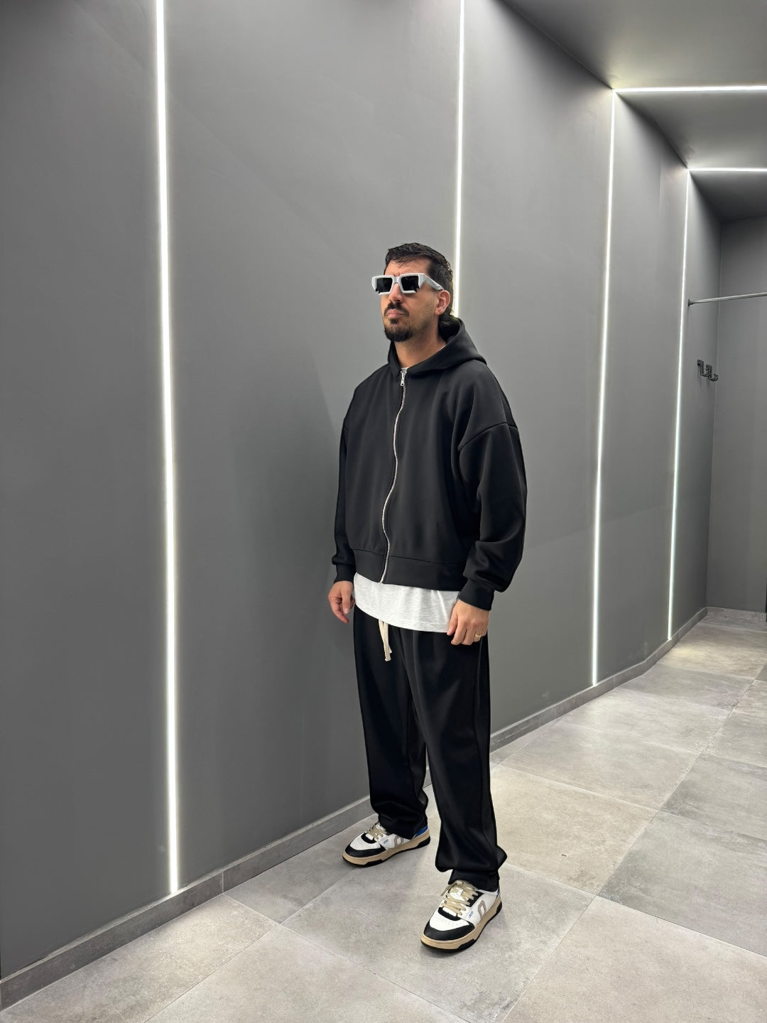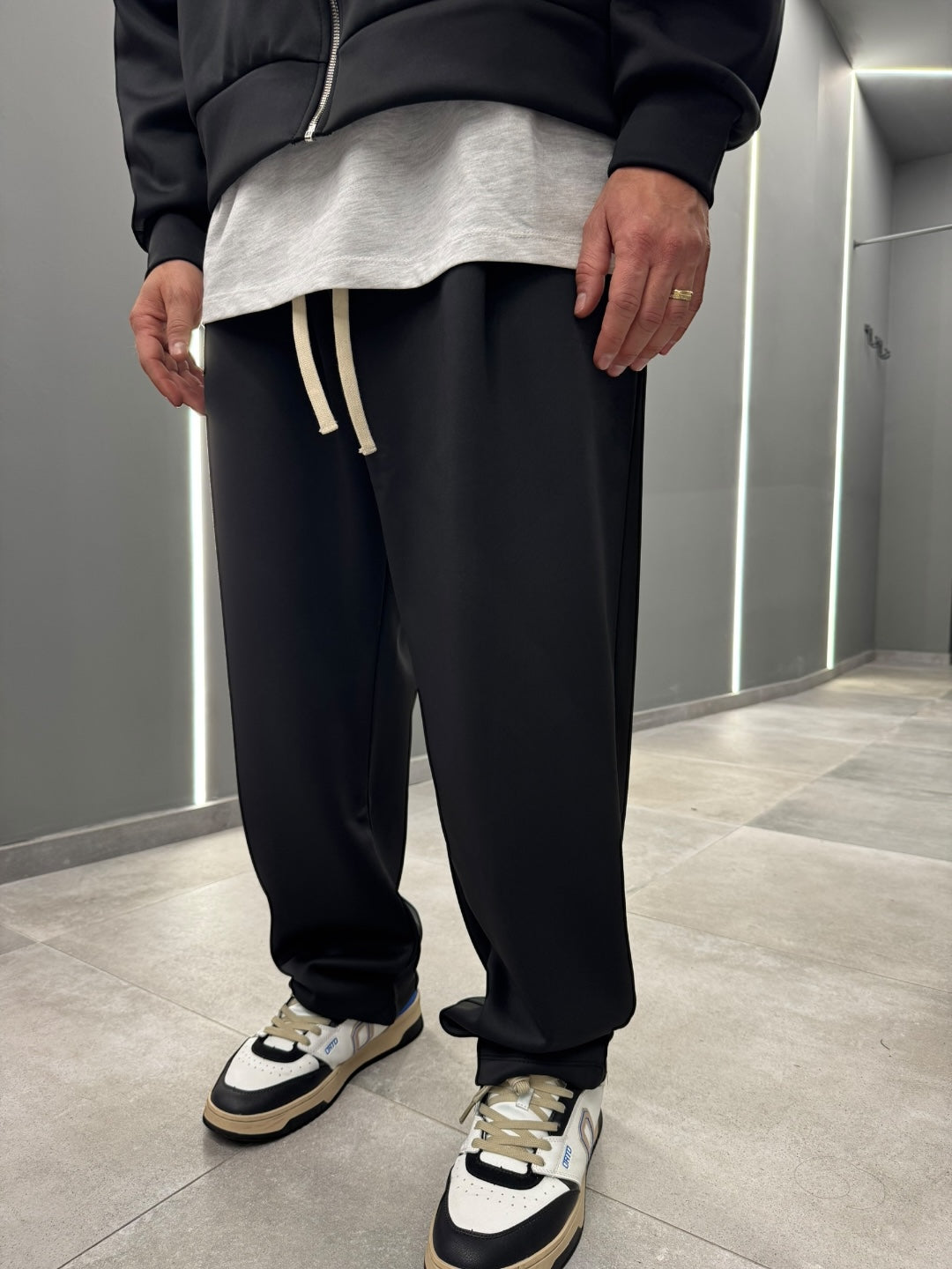 Coordinato tuta in tessuto scuba, dal design pulito e contemporaneo. Felpa con cappuccio e zip frontale abbinata a pantalone dal fit confortevole, morbido e strutturato allo stesso tempo. Ideale per un look urban e moderno, perfetto sia per il tempo libero che per outfit casual curati. Disponibile nei colori nero e blu notte.
