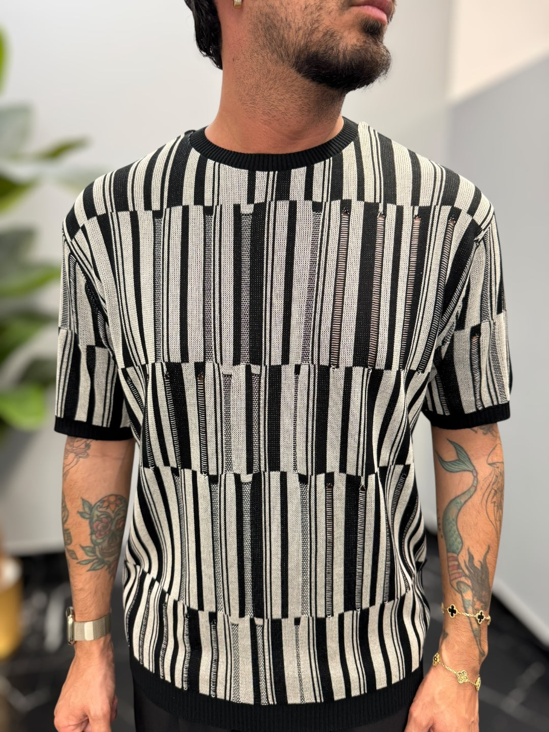 Realizzata in un tessuto leggero, la maglia si adatta perfettamente alle temperature estive, garantendo comfort e traspirabilità anche durante le serate più calde. I colori alternati creano un effetto accattivante che cattura l’attenzione e ti permetterà di esprimere la tua personalità con facilità.