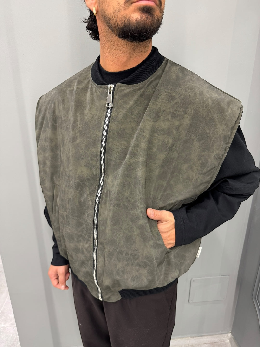 Scopri il nostro smanicato in ecopelle martellata, un capo unico che unisce stile e praticità con un tocco contemporaneo! Realizzato con un materiale eco-friendly che richiama l’effetto martellato, questo smanicato è disponibile in due raffinati colori: un verde militare intenso e un grigio ferro leggermente sfumato, perfetti per aggiungere carattere a qualsiasi outfit.