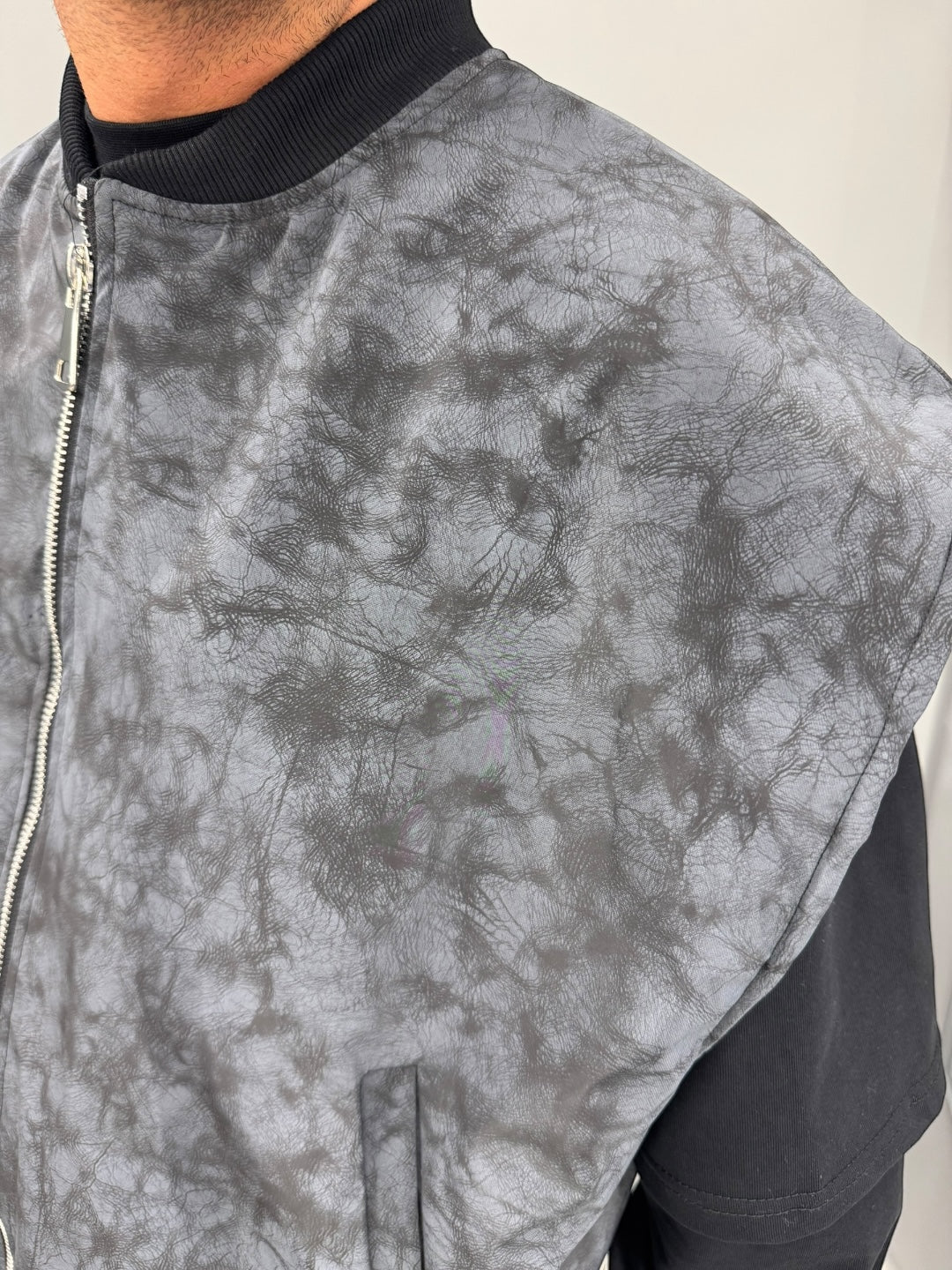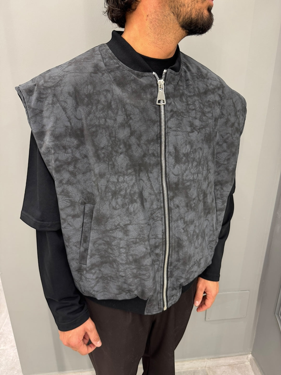 Il design oversize e senza maniche lo rende perfetto per stratificare su felpe o maglie a manica lunga, offrendo libertà di movimento e un look urban moderno. La chiusura frontale con zip metallica aggiunge un dettaglio funzionale e di carattere, mentre il collo e l’orlo sono rifiniti con bordi elasticizzati per un fit comodo e curato.