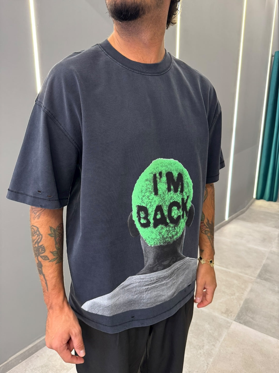 Realizzata in morbido cotone di alta qualità, questa maglia presenta una vestibilità oversize, comoda e moderna, perfetta per chi ama uno stile urban e contemporaneo. Il design si distingue per la stampa frontale iconica che ritrae la silhouette di una figura con i capelli colorati in verde fluo o fucsia, su cui campeggia la scritta audace "I'M BACK": un messaggio di ritorno e rinascita, ideale per chi vuole esprimere grinta e personalità.