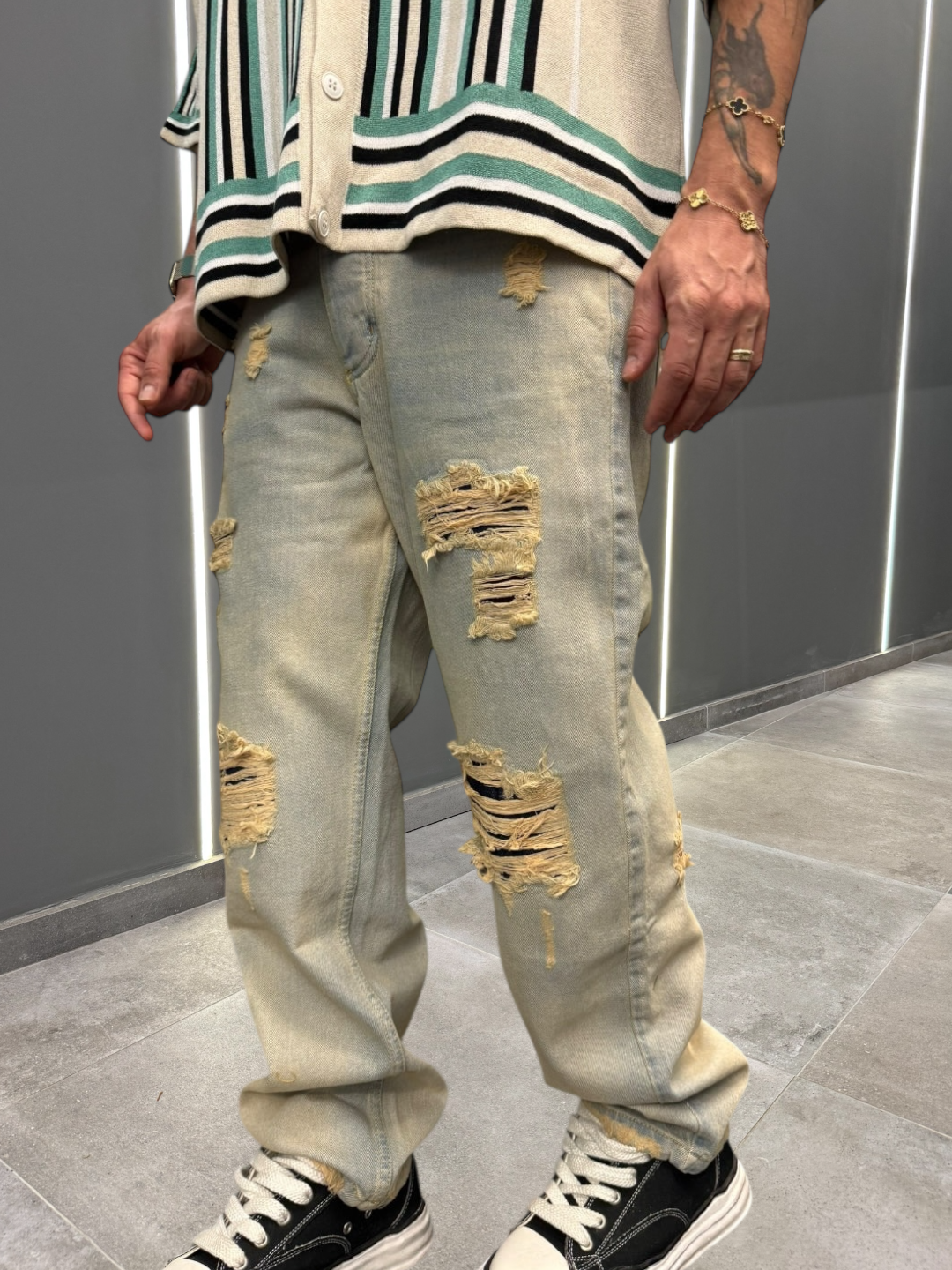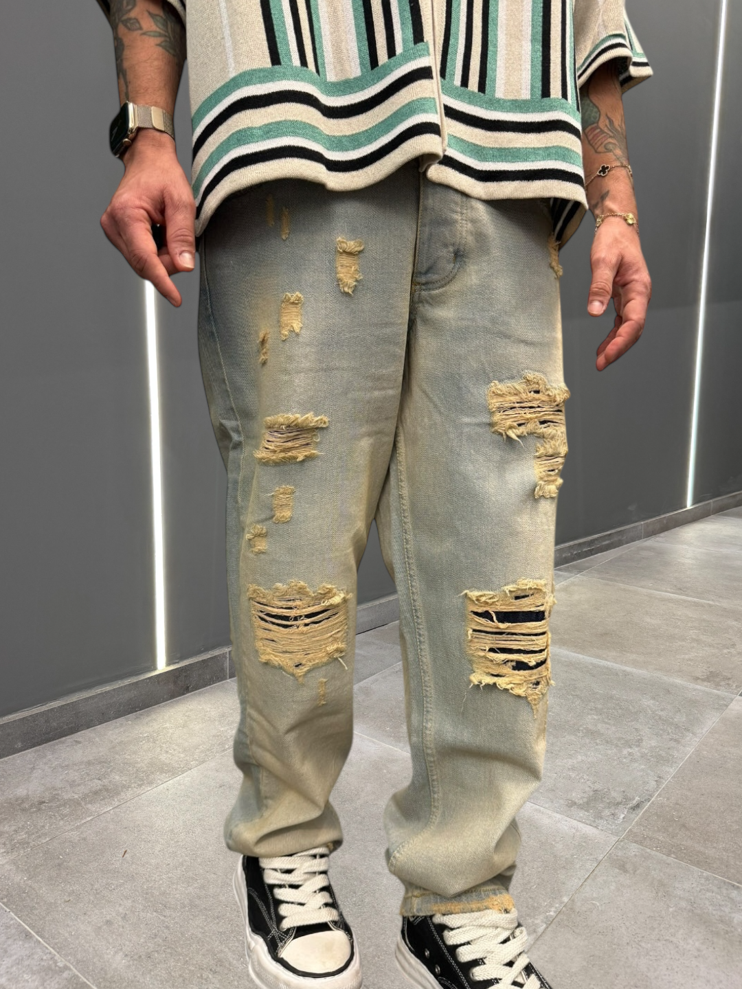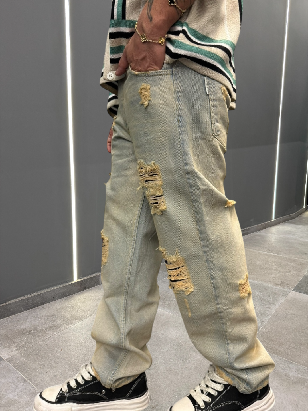 Un denim baggy in lavaggio sabbiato con rotture, è un capo d’abbigliamento dal carattere distintivo, perfetto per un look casual e contemporaneo. La finitura sabbiata conferisce al tessuto un aspetto leggermente vissuto, con sfumature di colore che esaltano la texture del denim, creando un effetto più morbido e opaco. Le rotture sparse lungo il pantalone aggiungono un tocco di “used look” senza esagerare, mantenendo l’equilibrio tra il vintage e il moderno.