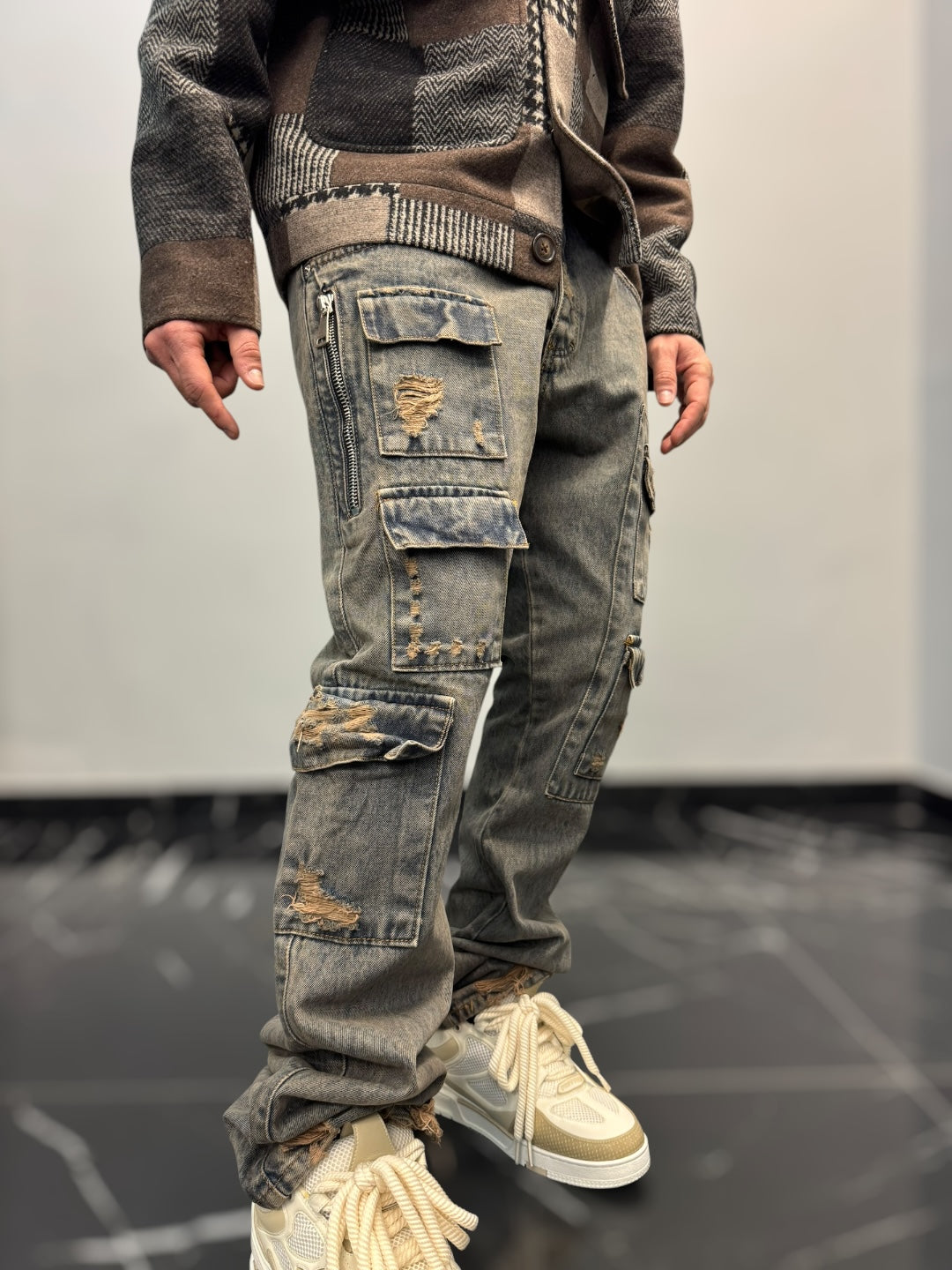 Porta il tuo outfit a un altro livello con questi jeans cargo flared sabbiati, un capo che unisce la praticità del cargo alla raffinatezza del taglio a zampa. Ideale per chi ama osare con un look deciso ma sofisticato.