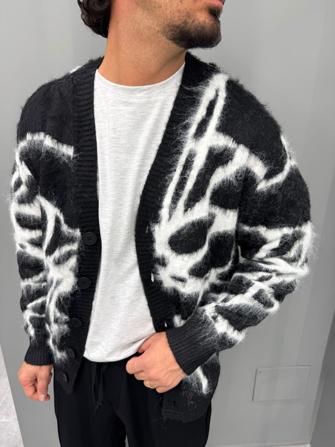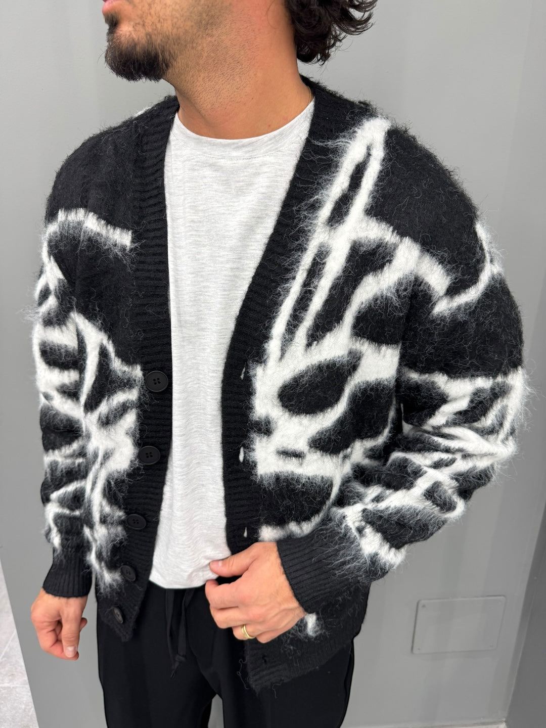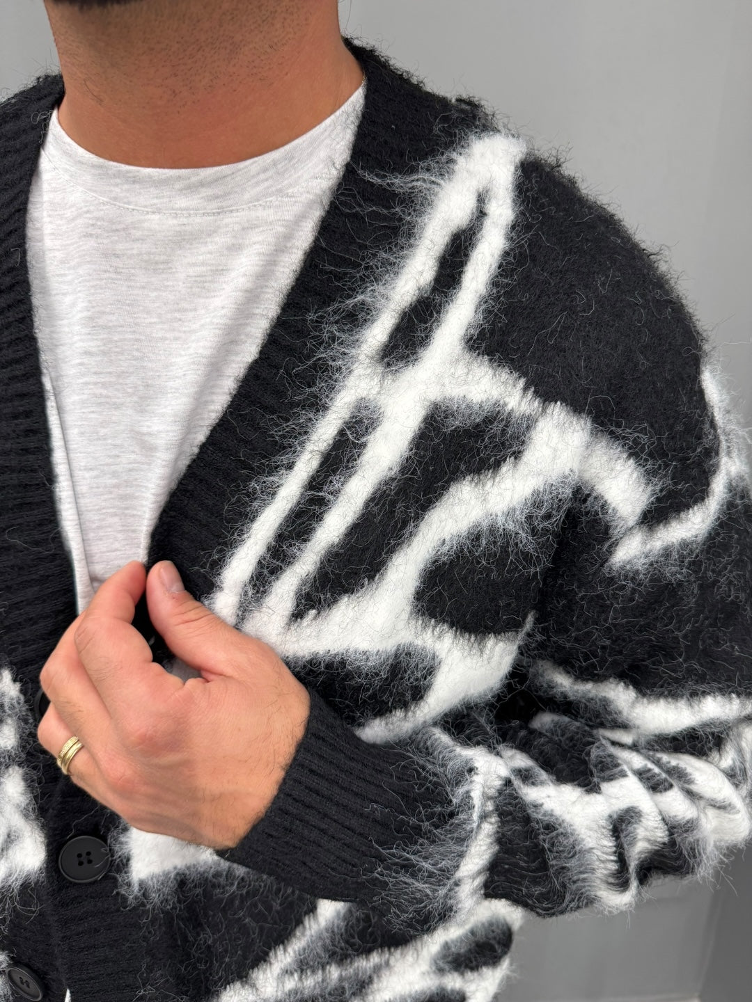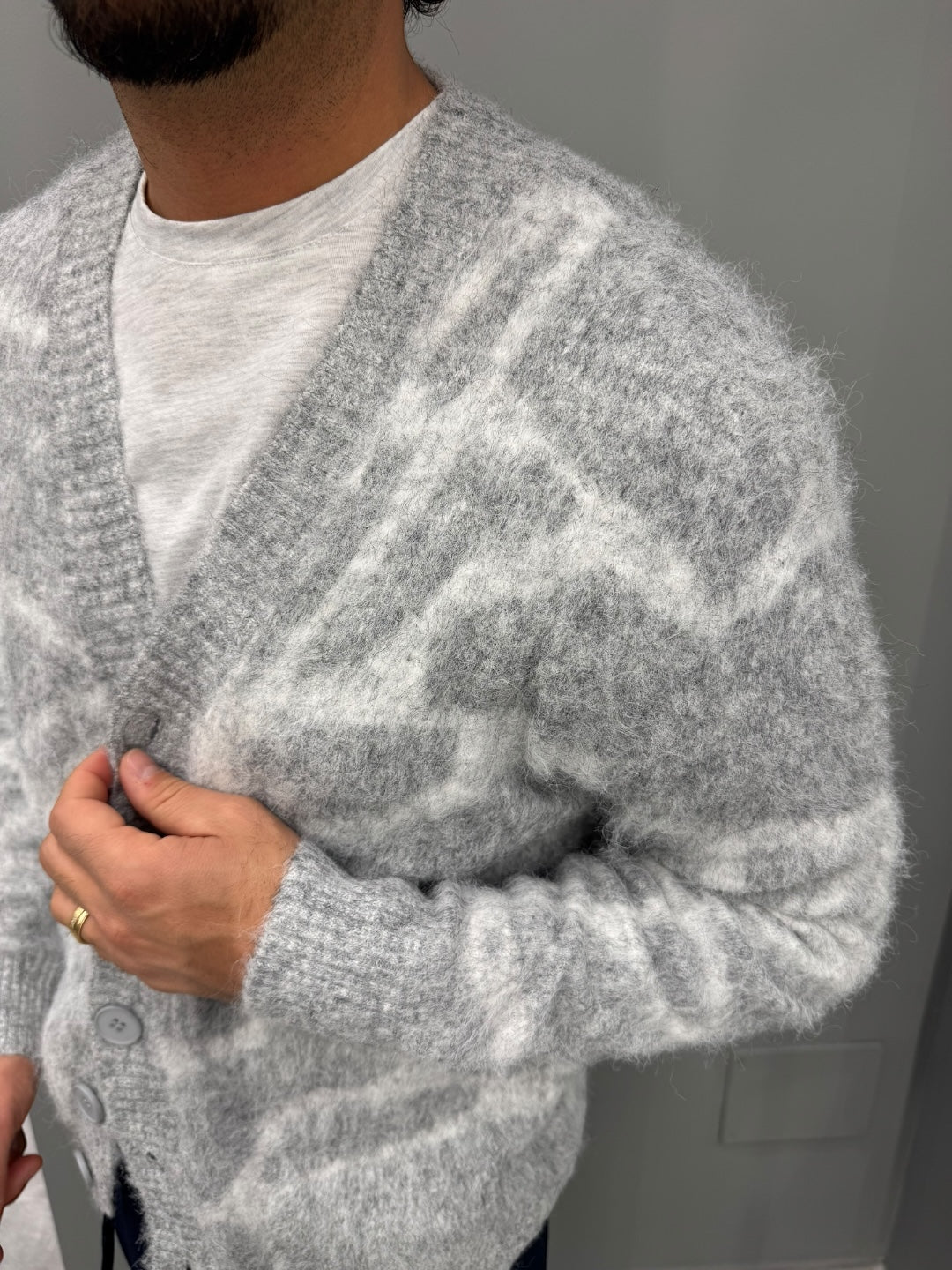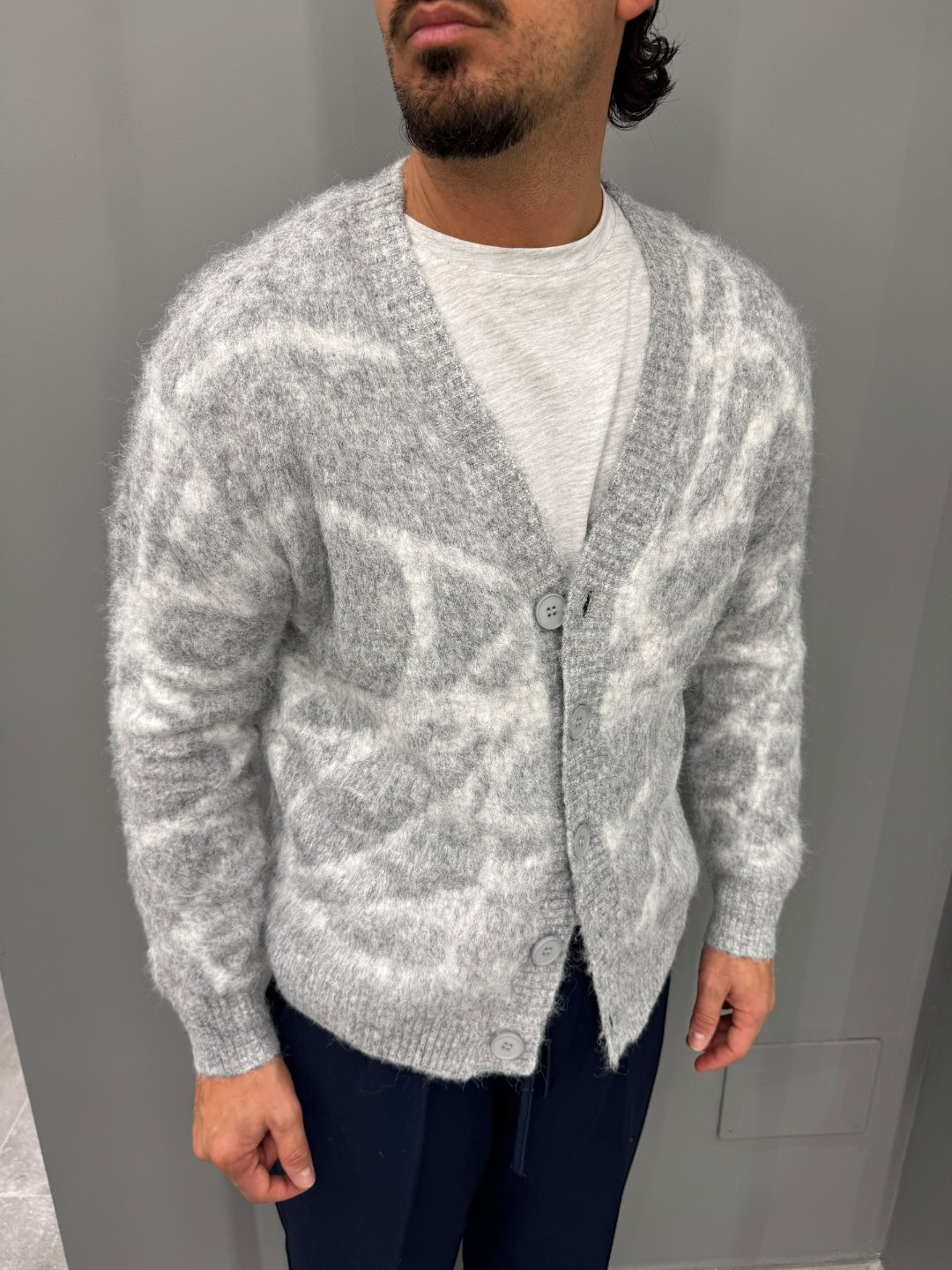 Aggiungi carattere al tuo guardaroba con questo cardigan in morbido mix di mohair, un capo dall’estetica moderna e ricercata che unisce comfort assoluto e personalità. Disponibile in due varianti cromatiche – grigio chiaro con pattern tono su tono e nero con grafica bianca a contrasto – è il cardigan perfetto per chi vuole distinguersi senza rinunciare alla versatilità.