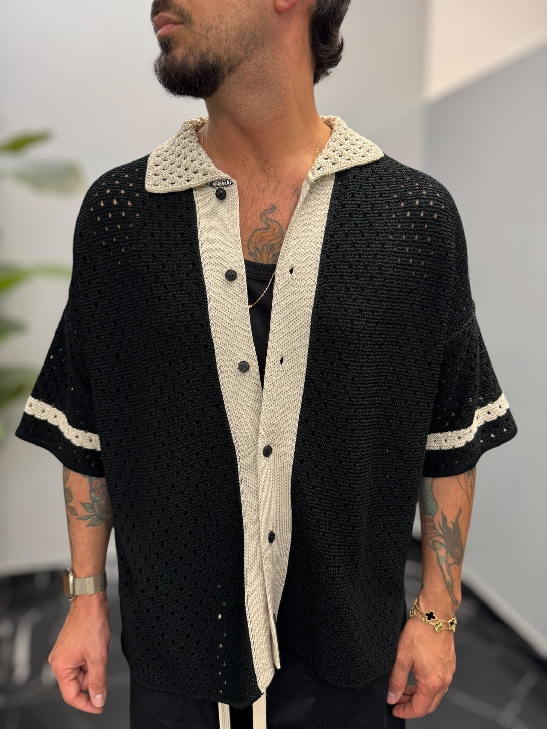 non lasciare che questo pezzo unico ti sfugga! Aggiungi il Polo Cardigan Bicolore con trama a fori al tuo carrello oggi stesso e rinnova il tuo stile con un tocco di eleganza e modernità!