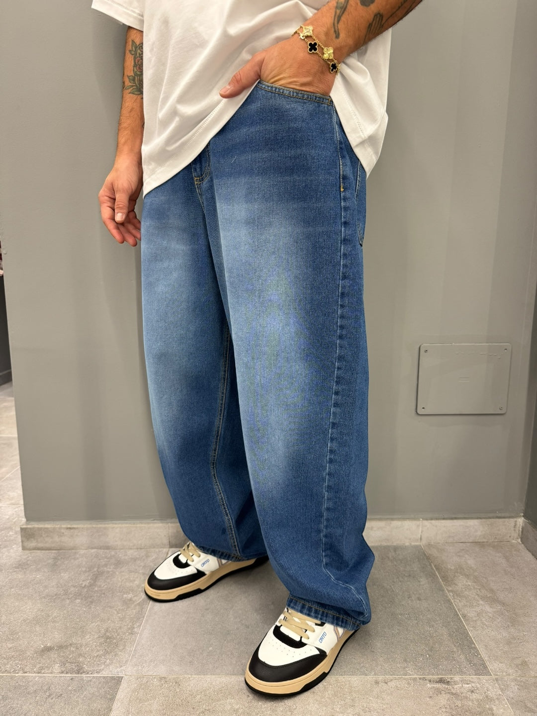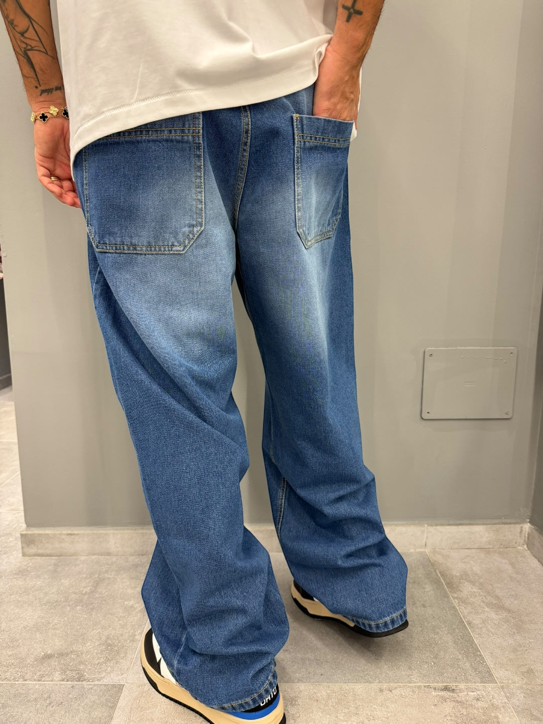 Il jeans ideale per chi ama lo stile relaxed senza rinunciare al carattere. Realizzato in denim morbido con lavaggio chiaro sfumato, presenta una gamba ultra–wide che cade fluida e moderna, enfatizzando un look street di grande tendenza. Le tasche posteriori oversize e le leggere sfumature frontali aggiungono un tocco vintage che lo rende unico e super versatile.