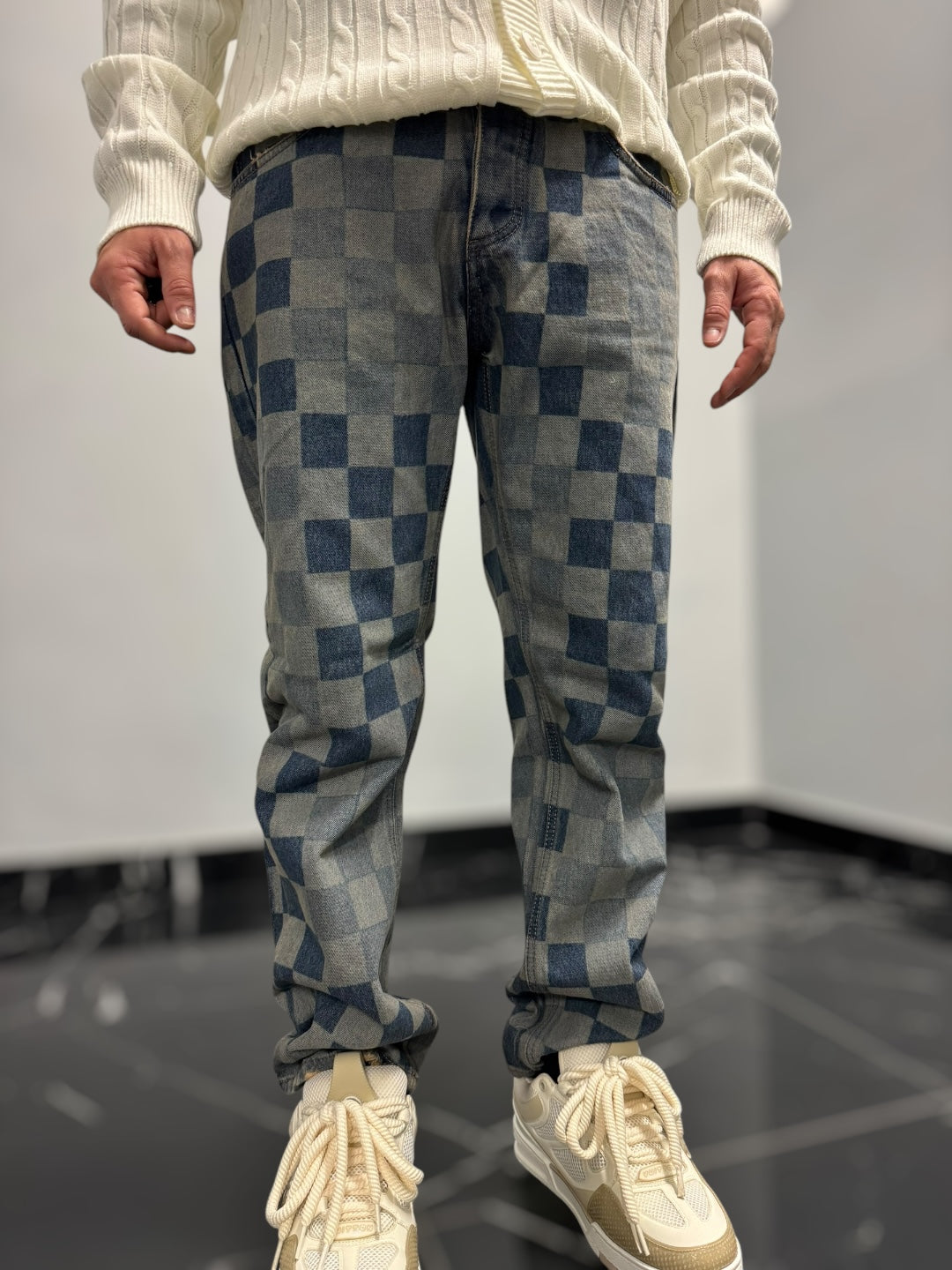 Ecco un jeans dal carattere deciso e ricercato, ispirato all’eleganza moderna della maison Vuitton. Questo capo presenta un motivo a quadri in tonalità sabbiate e blu, che crea un contrasto unico e contemporaneo, ideale per chi ama distinguersi con dettagli originali.