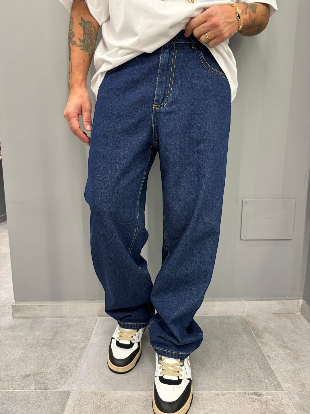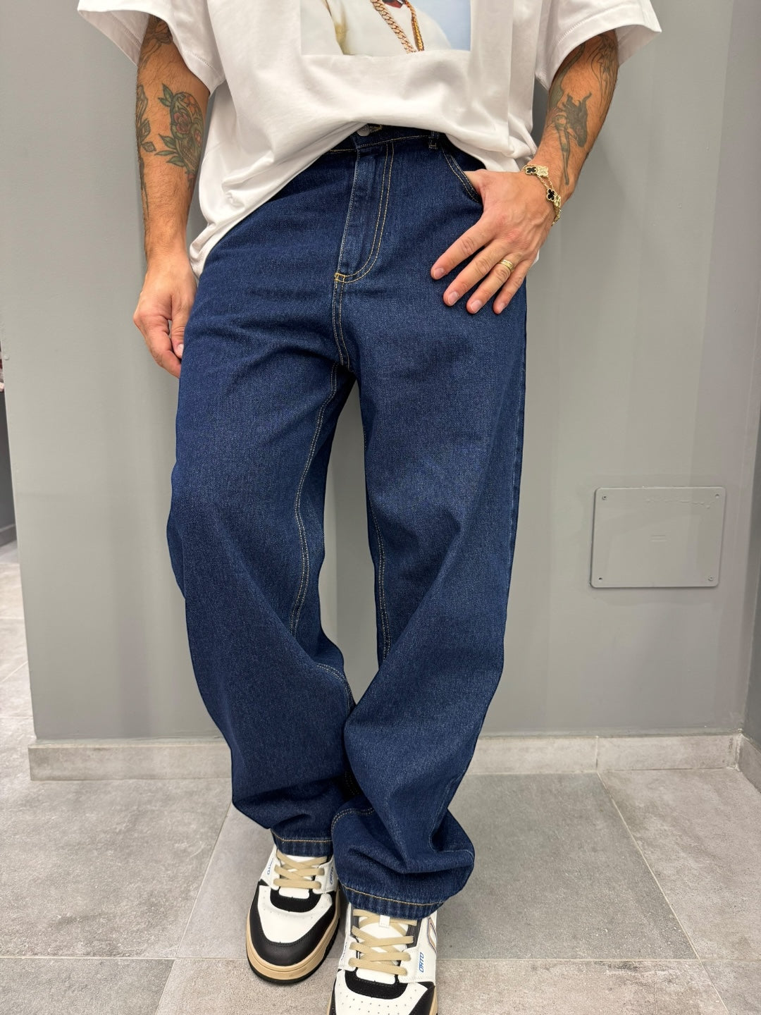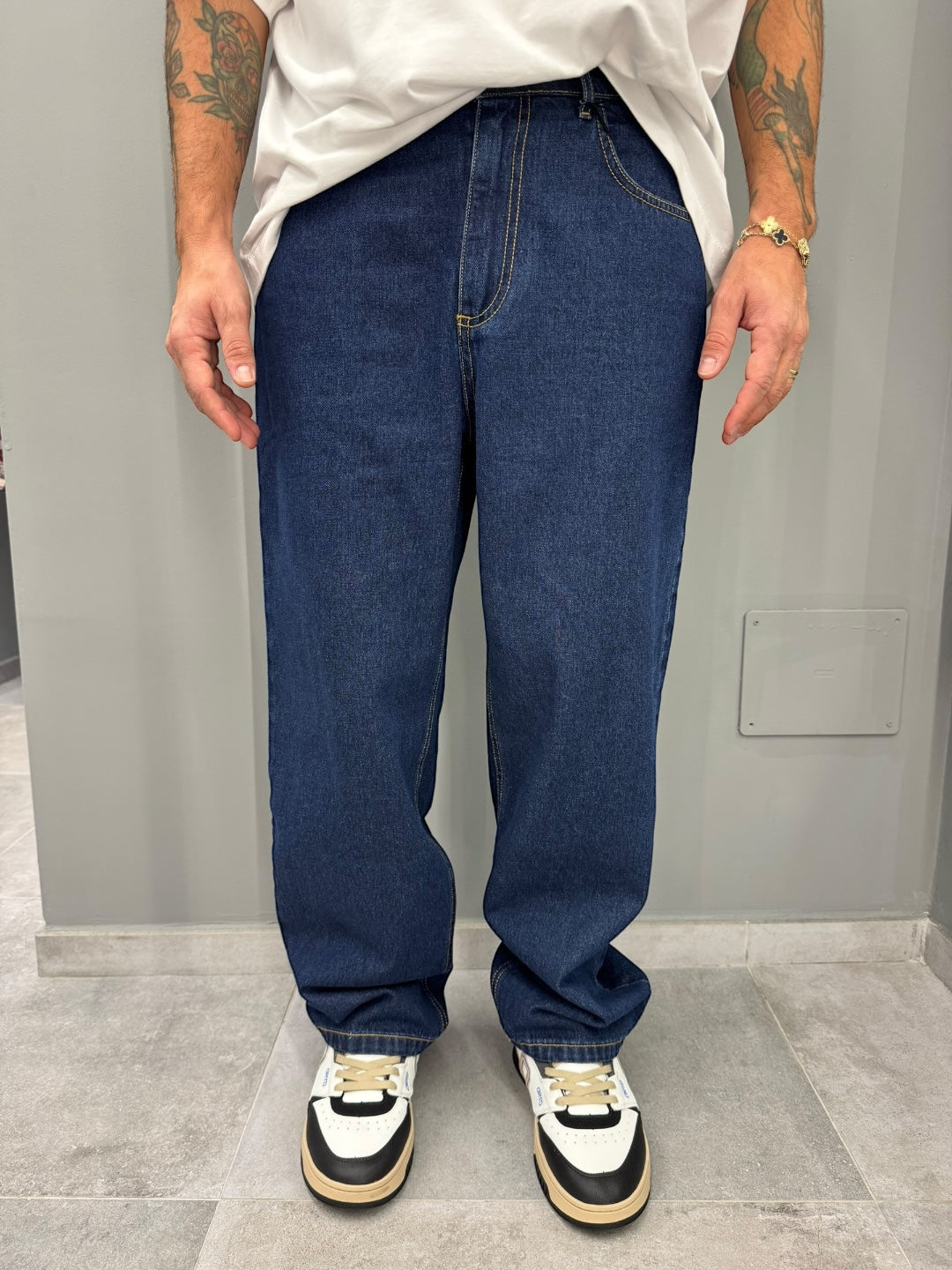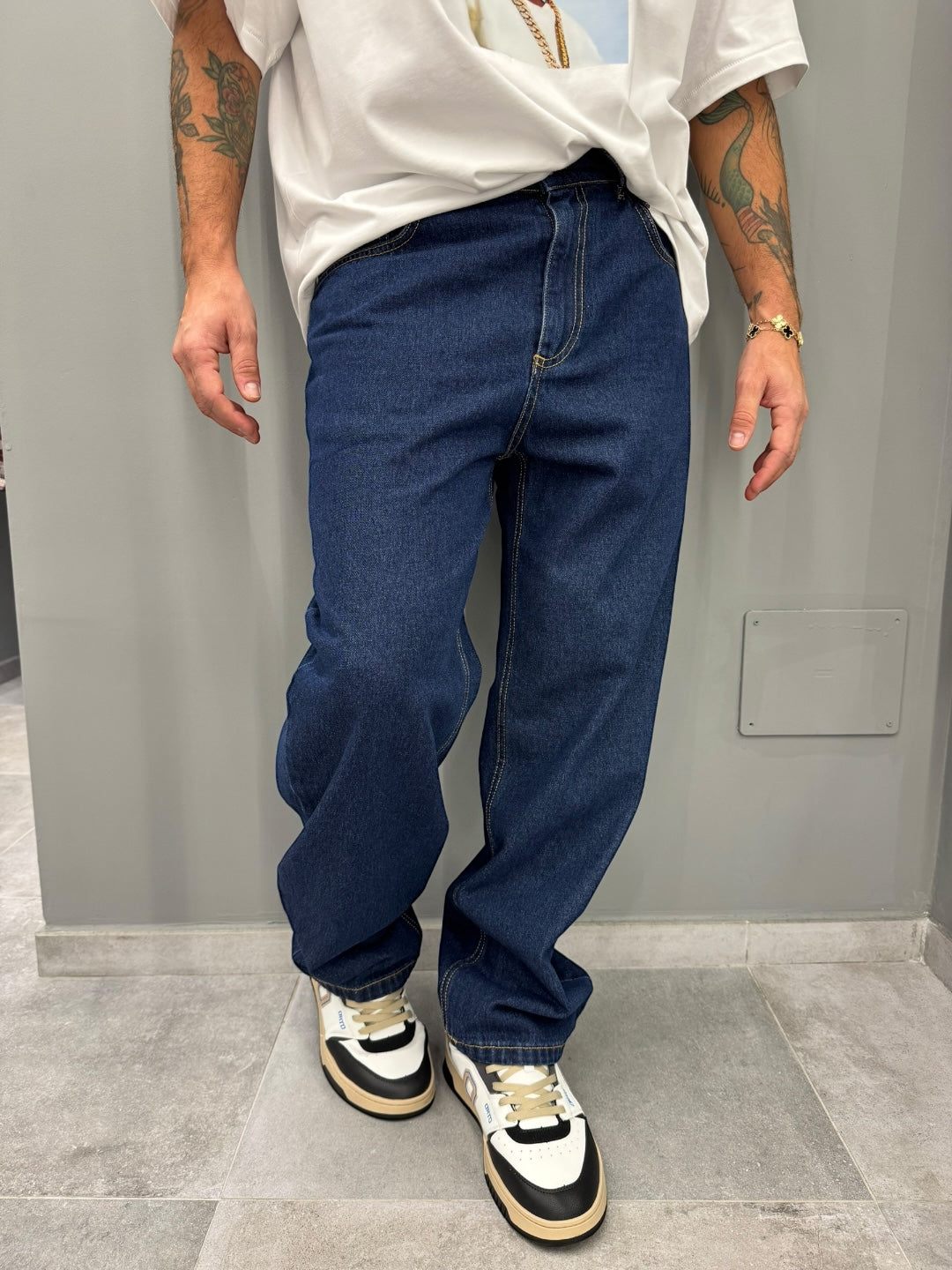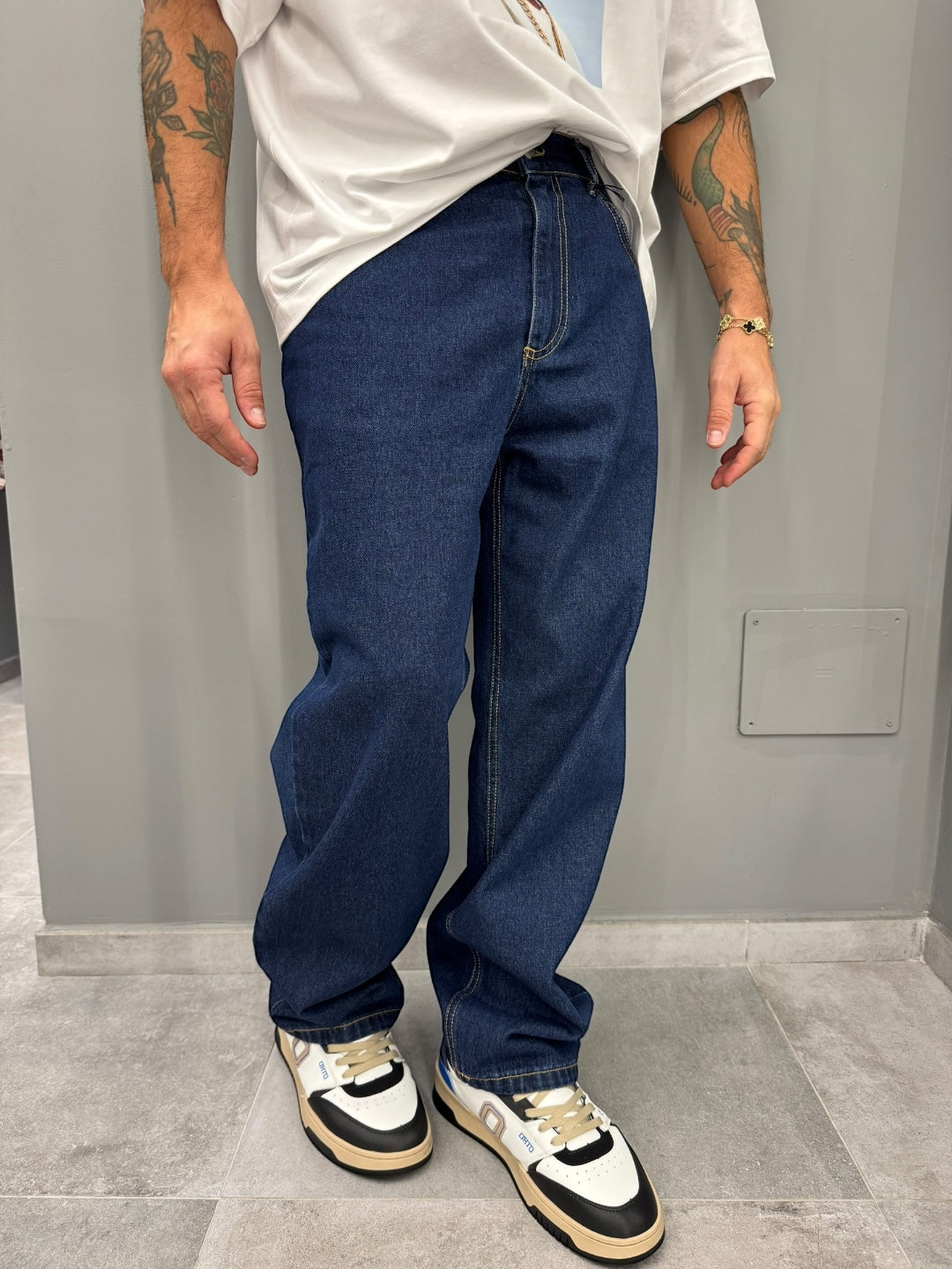 Jeans in denim blu scuro con fit loose e linea dritta, pensato per offrire comfort e stile in ogni occasione. Le cuciture a contrasto valorizzano la struttura, mentre il taglio ampio dona un look contemporaneo e casual perfetto per tutti i giorni.