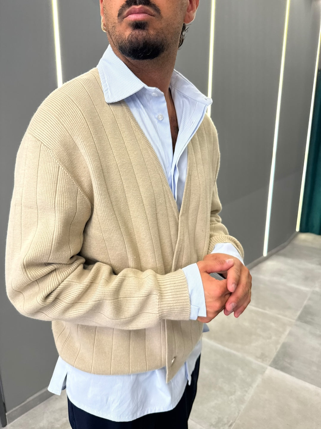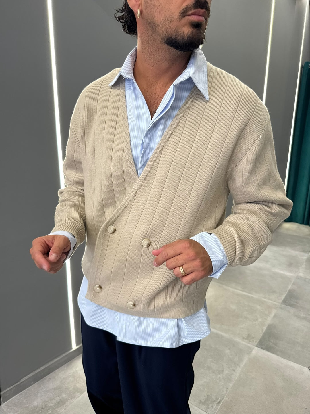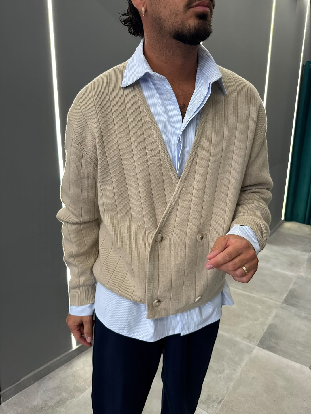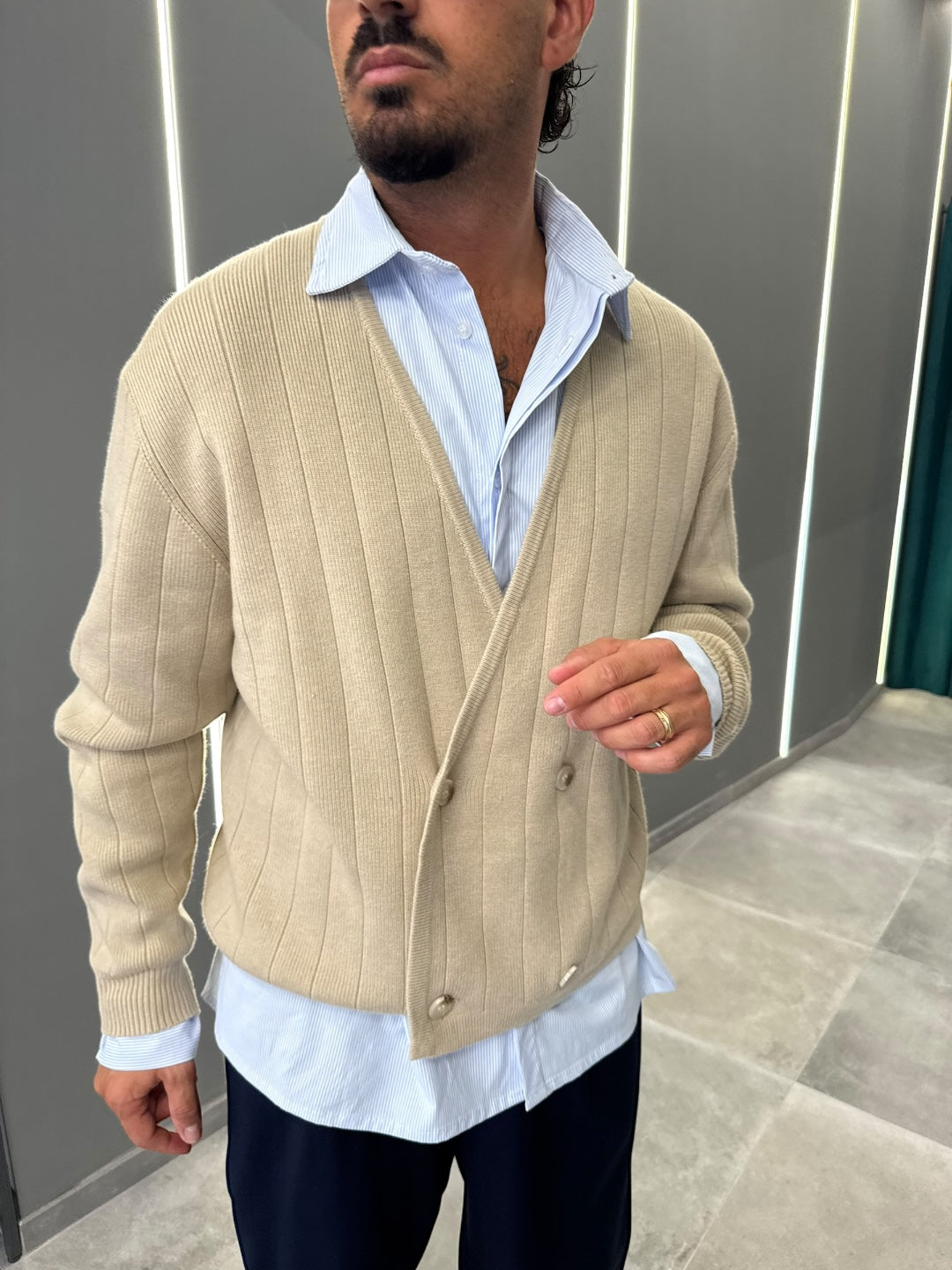 Cardigan beige a doppio petto in maglia a costine, dal gusto elegante e contemporaneo. Scollo a V, chiusura con bottoni e vestibilità confortevole che valorizza la silhouette. Un capo raffinato e versatile, ideale per completare look casual chic o più formali, perfetto sopra camicia o t-shirt.